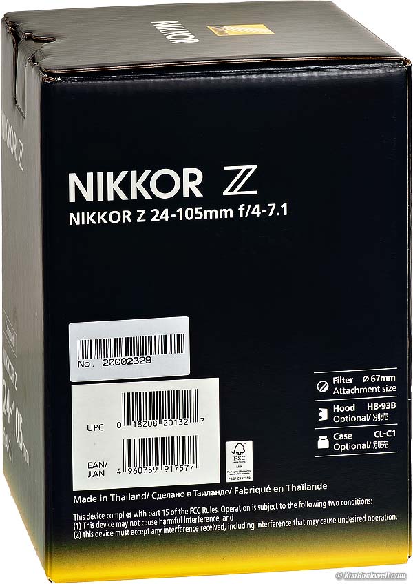 Nikon Z 24-105mm f/4-7.1. (67mm filters, 12.3 oz./350g, 0.8'/0.25m close focus, 0.5× macro ratio, $547). bigger. I got my 24-105mm at B&H. I'd also get it at Adorama, at Amazon or at Crutchfield, or get it used if you know How to Win at eBay, or get it used at KEH. It also comes as a kit with the Z5 II at B&H, at Adorama, at Amazon and at Crutchfield.