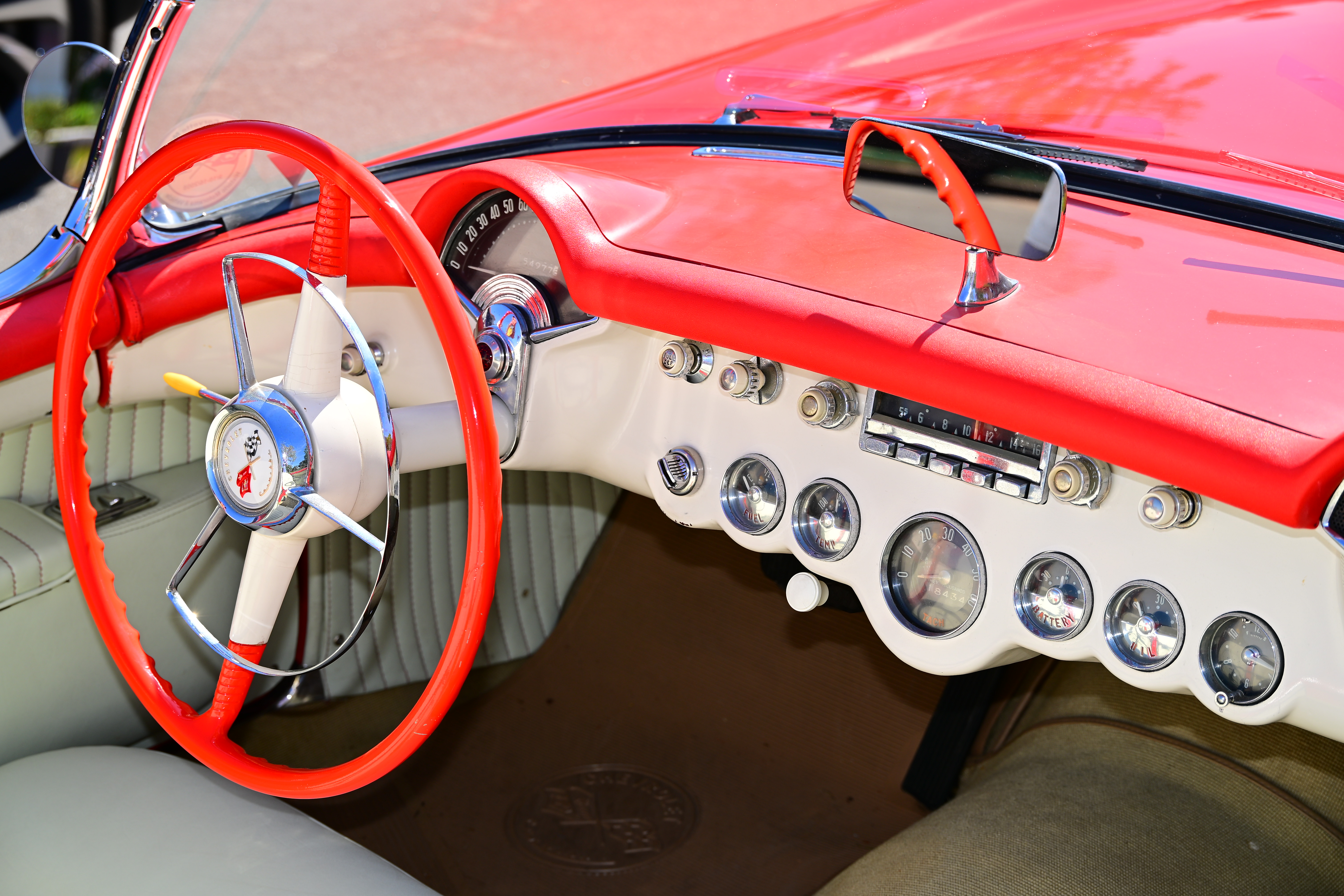 Gypsy Red (exterior color code 596) 1955 Corvette Interior in White and Red, 10:41 AM, 28 March 2026. Nikon Z5 II, Nikon SB-400 flash to fill in shadows, Nikon Z 24-105mm at 67mm at f/8 at 1/200 at Auto ISO 100 (LV 13.6), as shot. bigger or camera-original 24 MP © 3.9 MB BASIC ★ JPG file.
