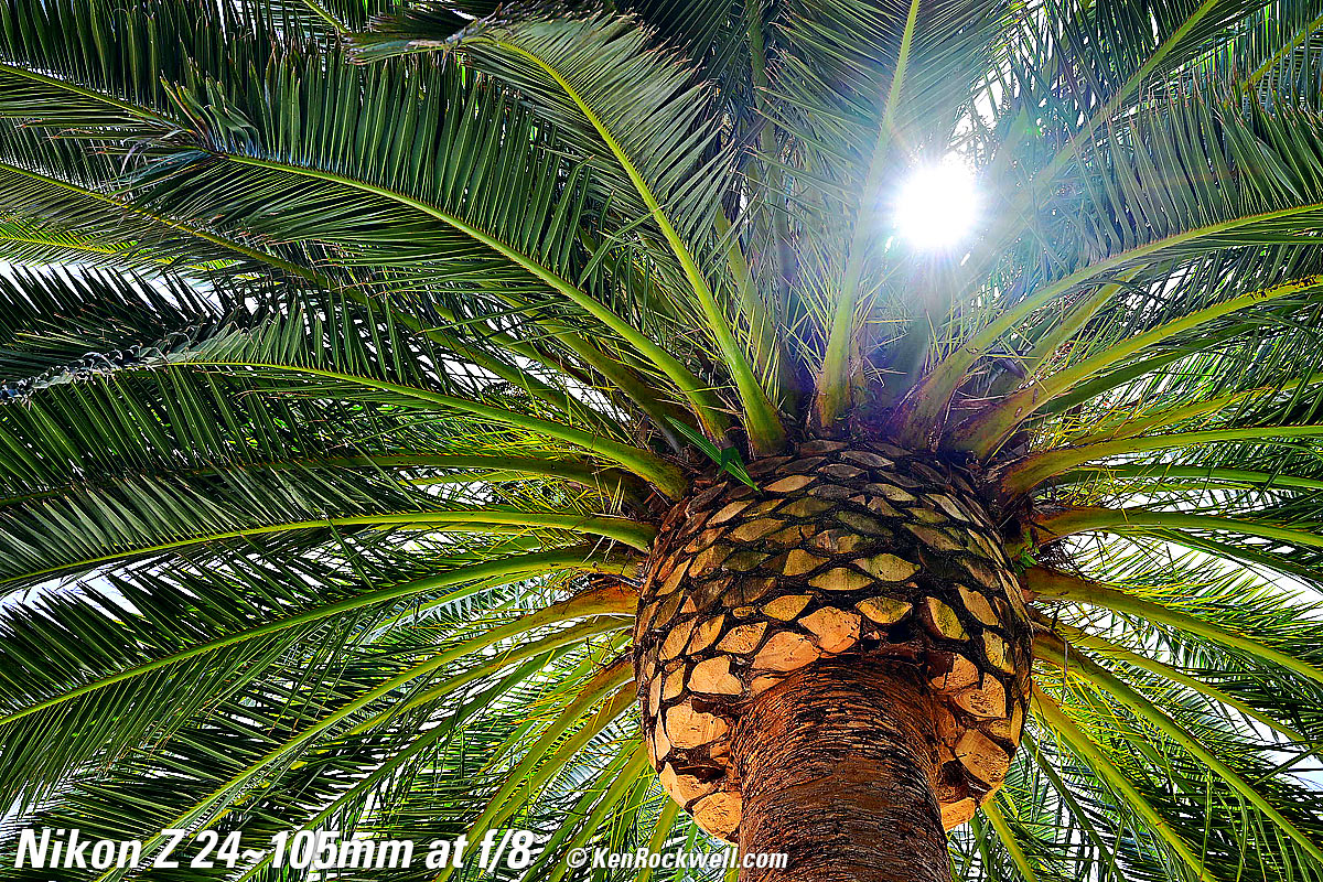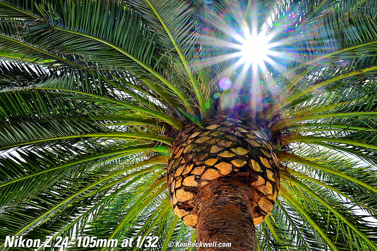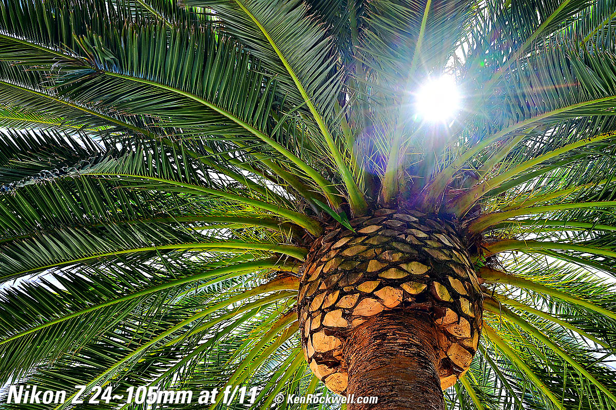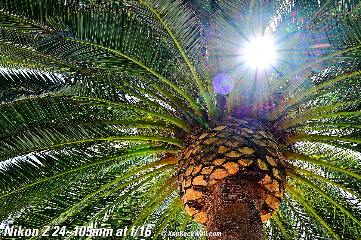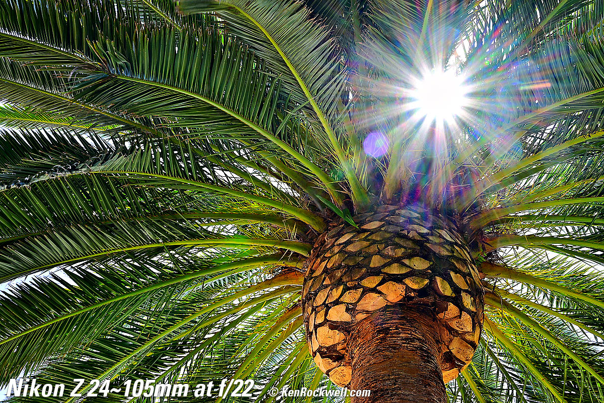 Ignore the crazy rainbow dots at small apertures; these are sensor artifacts caused by interference among the divisions between pixels on the sensor. These are made visible because we're using enough exposure to show the dark underside of a huge palm tree, and then putting the blinding disk of the mid-day sun in it. Doing this will show everything due to the insane lighting range.