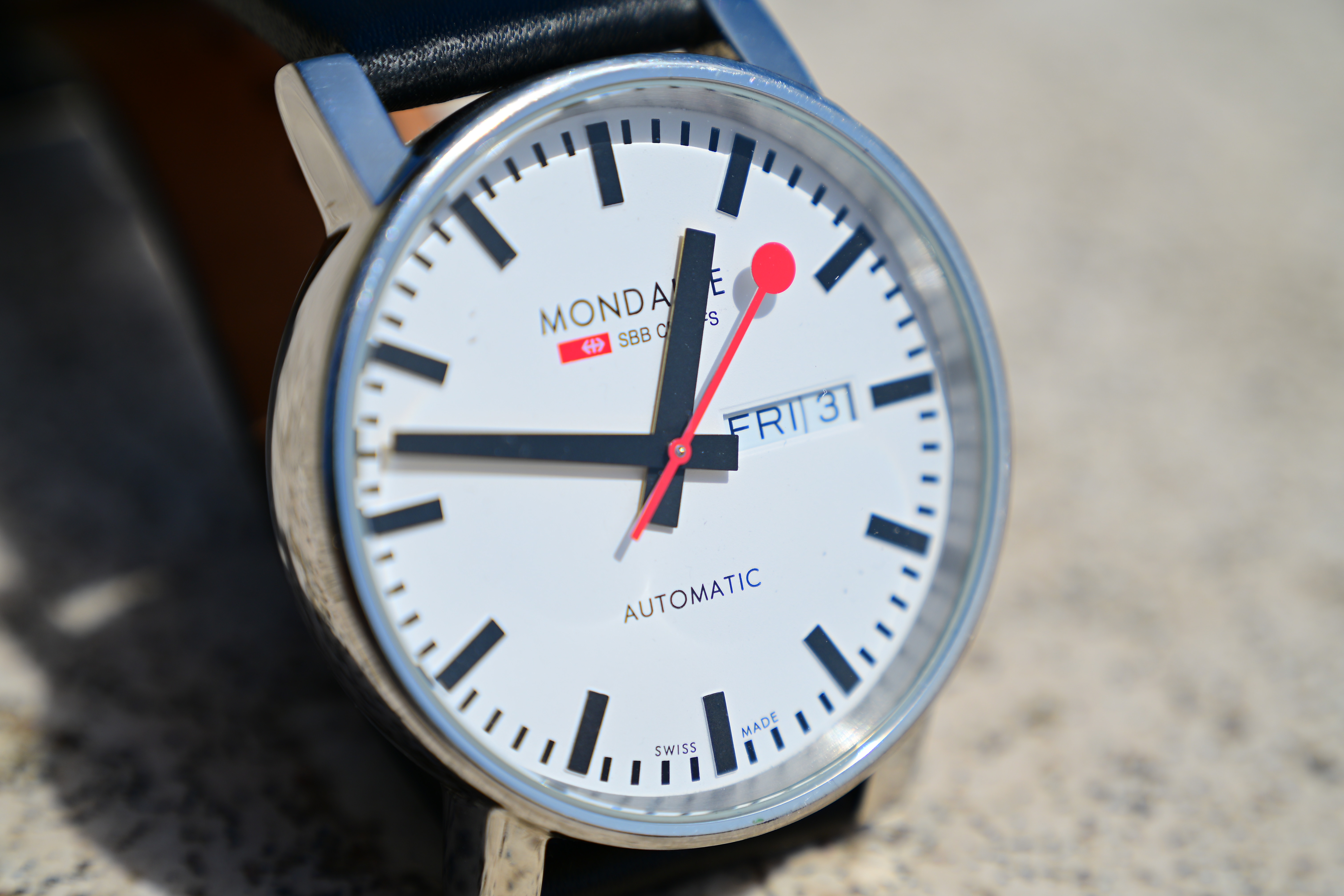Spherochromatism performance topSpherochromatism, also called secondary spherical chromatic aberration or "color bokeh," is an advanced form of spherical and chromatic aberration in a different dimension than lateral chromatic aberration and therefore cannot be corrected with software or automatic corrections. It happens mostly in fast normal and tele lenses when spherical aberration at the ends of the color spectrum (red and blue) are corrected differently than in the middle of the spectrum (green). Spherochromatism can cause colored fringes on out-of-focus highlights, usually seen as green fringes (the middle of the spectrum) on background highlights and magenta fringes (the red and blue ends of the spectrum added together make magenta) on foreground highlights. Spherochromatism is common in fast lenses of moderate focal length when shooting contrasty items at full aperture. It goes away as stopped down. This Z 24-105mm has a small to moderate amount of spherochromatism, with warm fringes ahead of and cool fringes behind the plane of perfect focus: Mondaine A132.30348.11SBB at close-focus distance, Friday, 03 April 2026. Nikon Z5 II, Nikon Z 24-105mm at 105mm wide-open at f/7.11 at 1/500 at Auto ISO 100 (LV 14.6), Radiant Photo software to add light to the shadows while retaining highlights. bigger or camera-original 24 MP © 2.2 MB BASIC ★ JPG file.