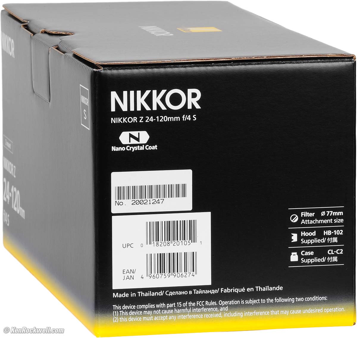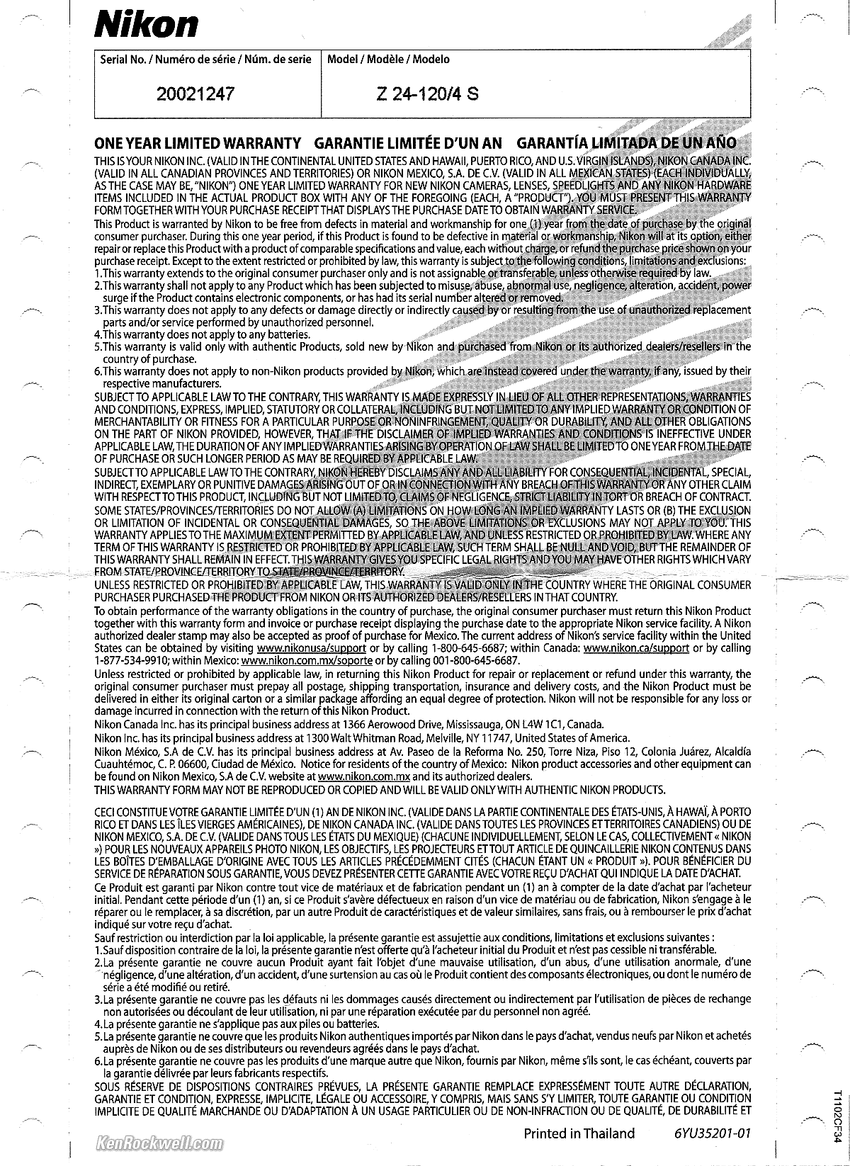 This section applies in the U. S. A. only. Your box should include a USA Warranty Card, and the serial number must match the one on the bottom of your lens, otherwise you have no warranty. Nikon Z 24-120mm f/4 U. S. A. Warranty Card. bigger. If you don't have this card, if the card doesn't say "VALID IN THE CONTINENTAL UNITED STATES" or the serial number on the card doesn't match the one on your lens exactly, you got ripped off with a gray market version from another country. All legitimate camera lenses come with printed warranty cards, even if you prefer to register online. (The serial number on the outside of the box doesn't have to match, but if it doesn't it means you bought from a shady dealer who took cameras lenses out of boxes and then resold these used lenses cameras as new.) Shifty dealers may include color copies of a card from a legitimate U. S. A. product in a gray-market box, hoping you won't check serial numbers and catch their fraud. A card with the wrong serial number means nothing other than that you have no warranty coverage. Nikon stopped offering 5-year lens warranties in 2021 in an effort to save themselves money at our expense. Did you notice the clever nod to ancient computer technology? This is printed on tractor-fed paper with tear-off sides and dot-matrix printing of model and serial numbers! If your card lacks these side perforations, beware. Everyone counterfeits laser holograms, but few people have dot-matrix printers floating around to fake these. Always be sure to check your box, warranty card and serial numbers while you can still return it, or just don't buy from unapproved sources or at retail so you'll be able to have your camera serviced and get free updated firmware as needed. This is why I never buy anyplace other than from my personally approved sources. You just can't take the chance of buying elsewhere, especially at any retail store, because non-USA versions have no warranty in the U. S. A., and you won't even be able to get firmware or service for it — even if you're willing to pay out-of-pocket for it when you need it! Nikon U. S. A. enforces its trademarks strictly. It's unlikely, but possible that US customs won't let your camera back in the country if you bought a gray-market version in the U. S. A., carried it overseas, and try to bring it back in. (If you take the chance of buying one overseas, be sure you have a receipt to prove you bought it overseas and be prepared to pay duty on it.) If a gray market version saves you $300 it may be worth it, but for $200 or less I wouldn't risk having no warranty or support. Get yours from the same places I do and you won't have a problem, but if you take the risk of getting yours elsewhere, be sure to check everything while you still can return it.