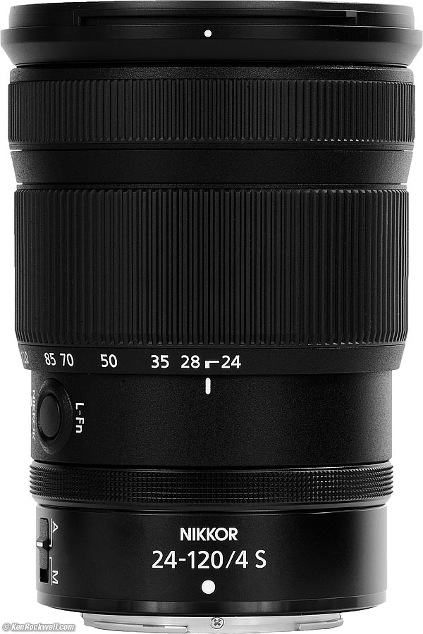 Name specifications topNikon calls this the NIKKOR Z 24-120mm f/4 S:NIKKOR: Nikon's brand name for all their lenses. Z: For Nikon's mirrorless cameras, only. S: Subliminally suggests sexual satisfaction. The "S" designation has no other purpose than subliminal seduction; Nikon and electronics and automobile and every kind of marketer have been using letters like "S" and "X" in model numbers since the 1940s for this same reason. Nikon called their first 1946 rangefinder lens mount the "S" mount, then went whole-hog to the "F" SLR mount in 1959, used "S" again when they updated their AI lenses to AI‑S in 1983, created AF‑S SWM lenses in 1998 and here it is again. S also stands for Expen$ive; S means nothing in terms of features or quality but lets Nikon up the price and their profit margins implying there's something extra about an "$" lens.