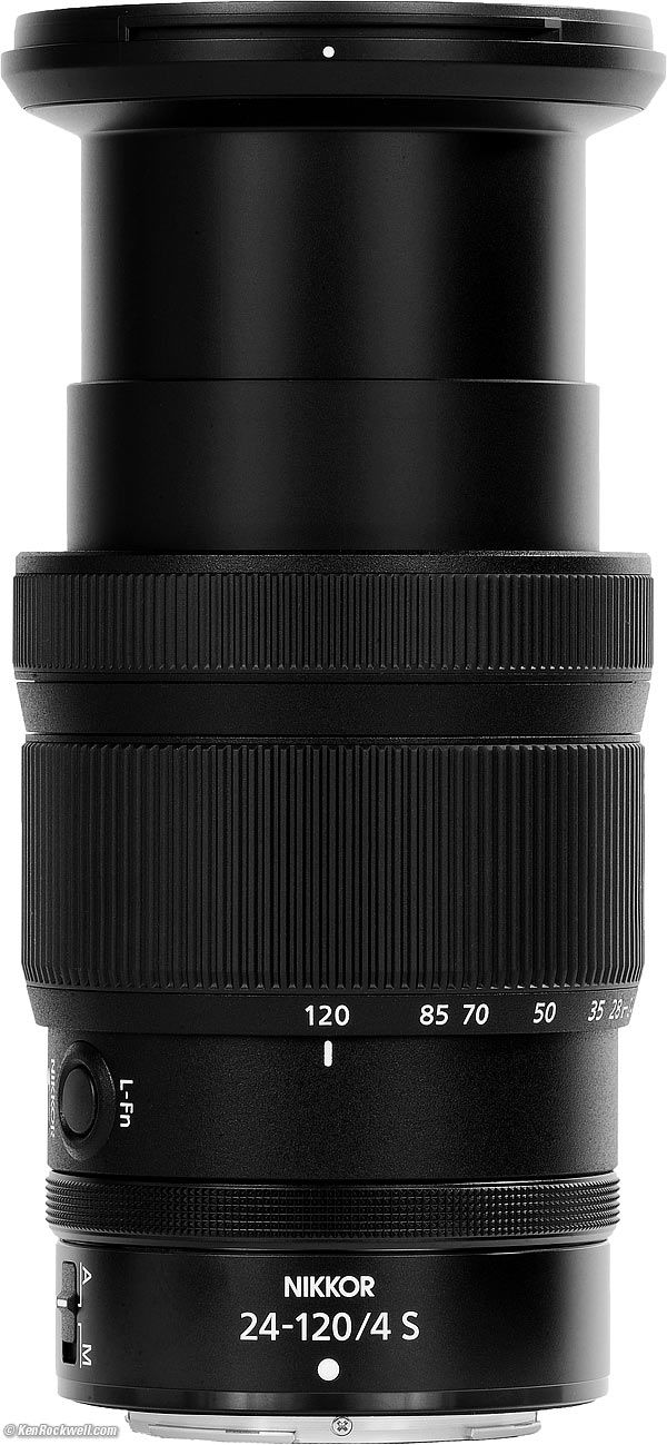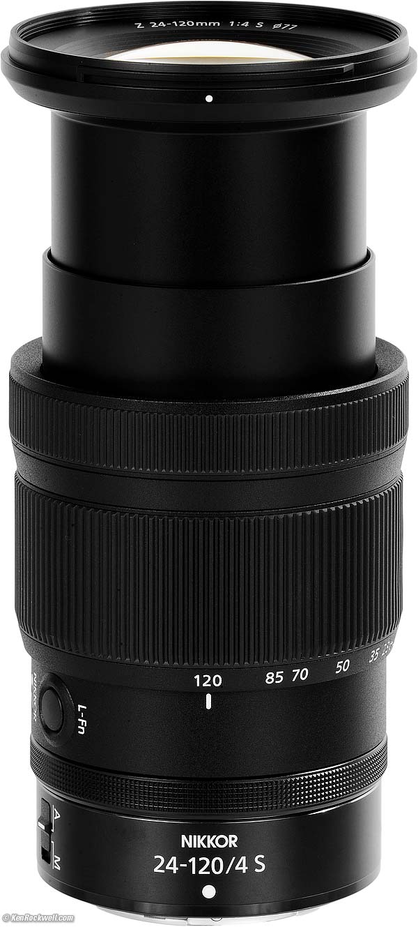 Nikon Z 24-120mm f/4Z-mount FX Mirrorless LensSample Images Intro New Good Bad Missing Compatibility Specifications USA Version Performance Compared Recommendations Z9 Z8 Z7 II Z6 III Z6 II Z5 II Zƒ Z7 Z6 Z5 DX (APS-C): Zƒc Z50 II Z50 Z30 Z System Z Lenses All Nikon Lenses Flash Nikon Z 24-120mm f/4 S (77mm filters, 22.2 oz./630 g, 1.15'/0.35m close focus, 0.39× macro ratio, $1,097). bigger. I got mine at B&H. I'd also get it at Adorama, at Amazon, or at Crutchfield, or eventually used at eBay if you know How to Win at eBay. This 100% all-content, junk-free website's biggest source of support is when you use those or any of these links to my personally approved sources I've used myself for way over 100 combined years when you get anything, regardless of the country in which you live — but I receive nothing for my efforts if you get it elsewhere. Nikon does not seal its boxes in any way, so never buy at retail or any other source not on my personally approved list since you'll have no way of knowing if you're missing accessories, getting a defective, damaged, returned, dropped, incomplete, gray-market, store demo or used lens — and all of my personally approved sources allow for 100% cash-back returns for at least 30 days if you don't love your new lens. I've used many of these sources since the 1970s because I can try it in my own hands and return it if I don't love it, and because they ship from secure remote warehouses where no one gets to touch your new lens before you do. Buy only from the approved sources I've used myself for decades for the best prices, service, return policies and selection.