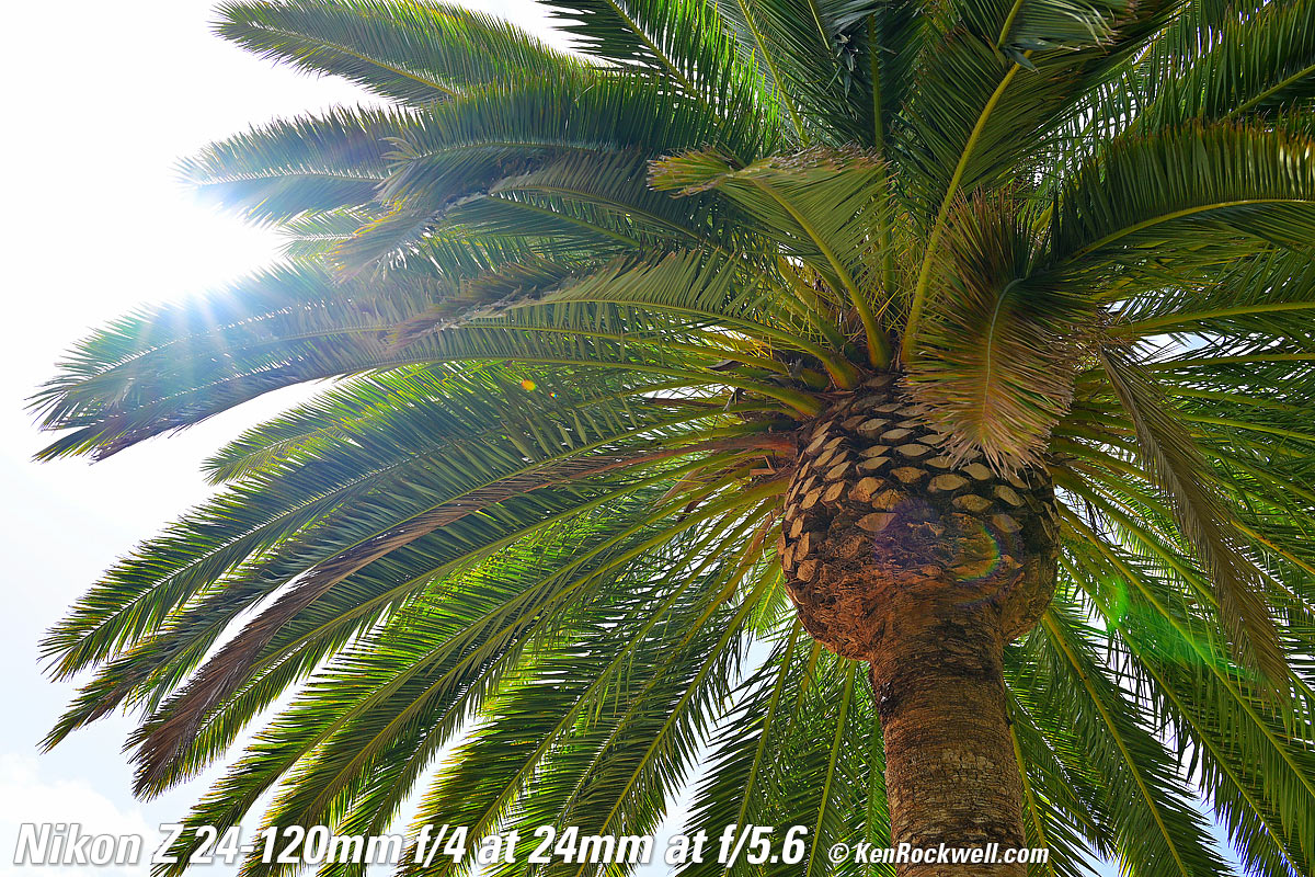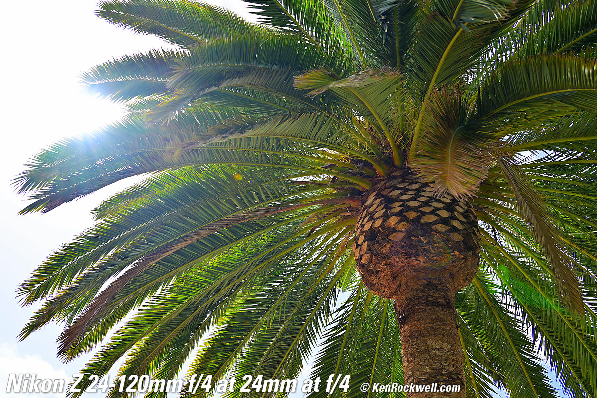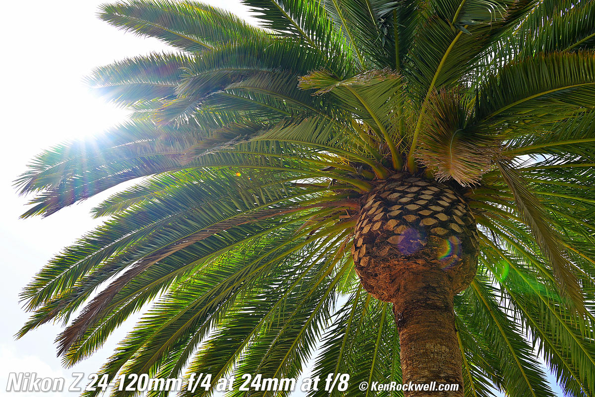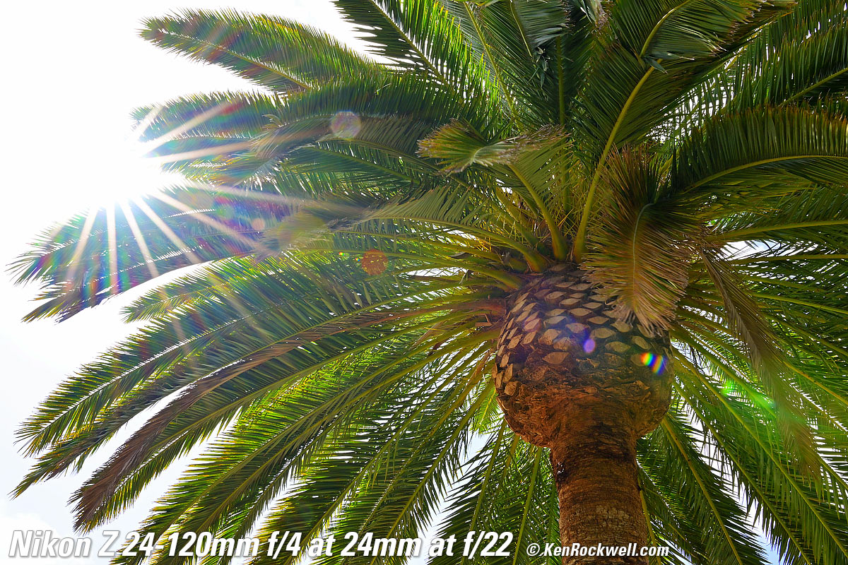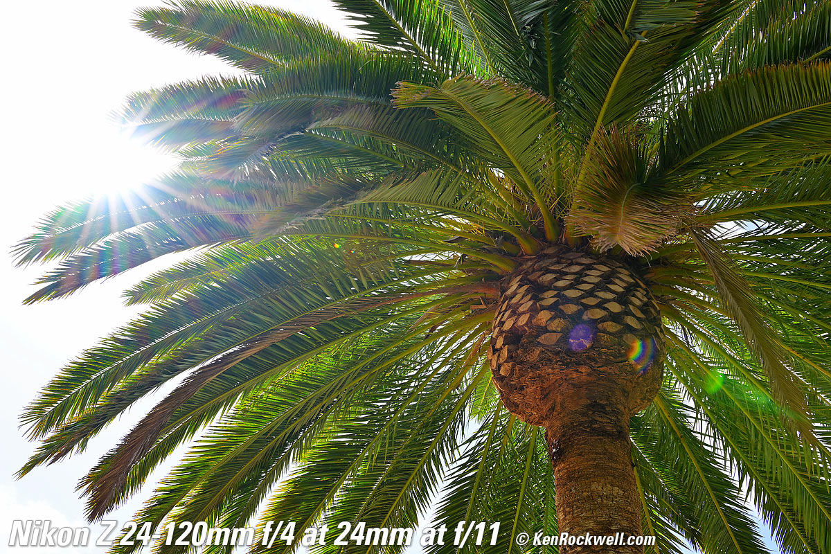 Canary Palm, 9:47 AM, Monday, 09 May 2022. Nikon Z9, Z 24-120mm f/4 at 24mm wide-open at f/4 at 1/60 at Auto ISO 64 (LV 10.6), exactly as shot. bigger or camera-original © JPG file. As you can see, it's ultra sharp corner-to-corner, even shot wide-open here. It gets even sharper stopped down. The only things not sharp are simply out-of-focus due to the limited depth of field at f/4. Focus is on the central pineapple. Introduction topSample Images Intro New Good Bad Missing Compatibility Specifications USA Version Performance Compared Recommendations
