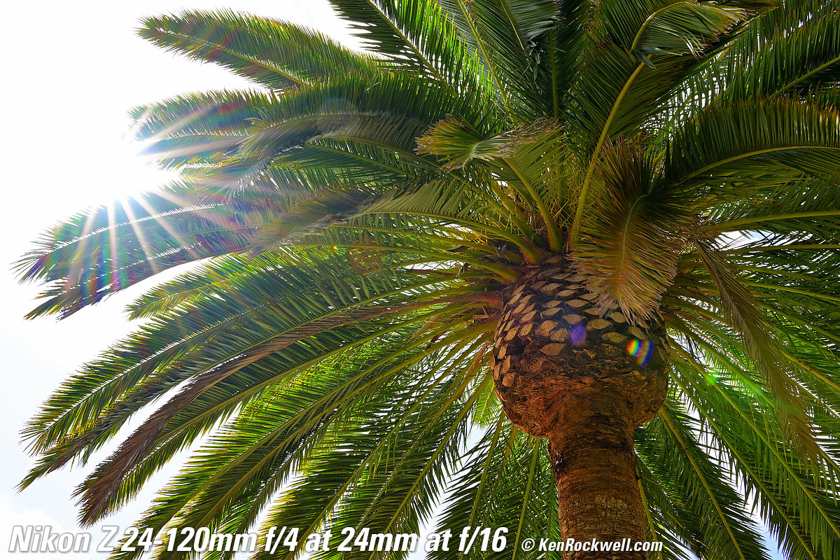 Sunstars performance topWith a 9-bladed rounded diaphragm, I get 18-pointed sunstars on brilliant points of light mostly at the smallest apertures. Ignore the crazy rainbow dots at small apertures; these are sensor artifacts caused by taking a picture directly of the sun and exposing for the dark underside of a huge palm tree, and using that same palm tree to hide the sky to accentuate the stars. Click any to enlarge: Click any to enlarge. Compared topSample Images Intro New Good Bad Missing Compatibility Specifications USA Version Performance Compared Recommendations