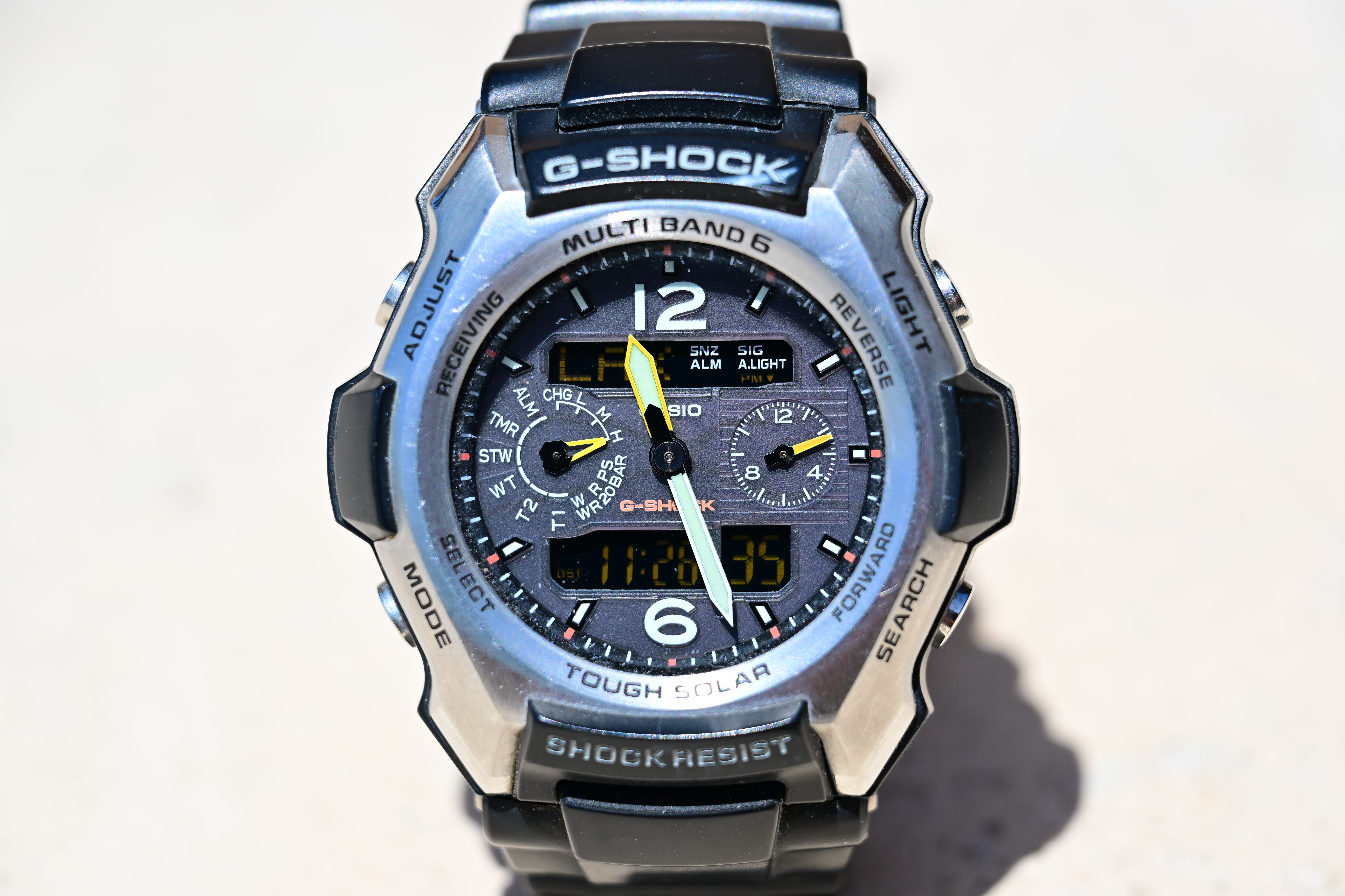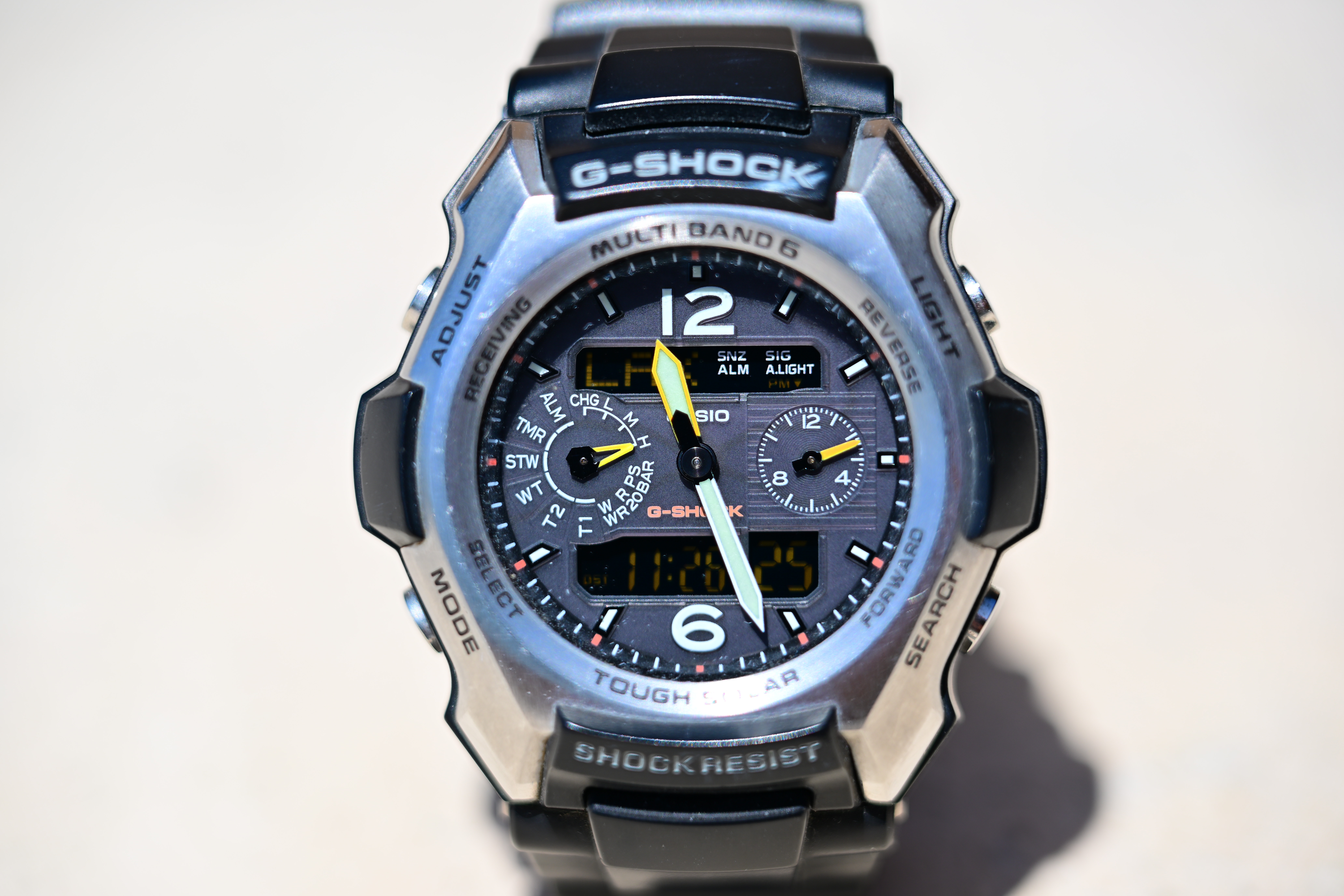 At f/8Stop down a little and it's super-sharp: Casio G-Shock Solar Atomic Watch at close-focus distance at 120mm, Monday, 09 May 2022. bigger or camera-original © file.