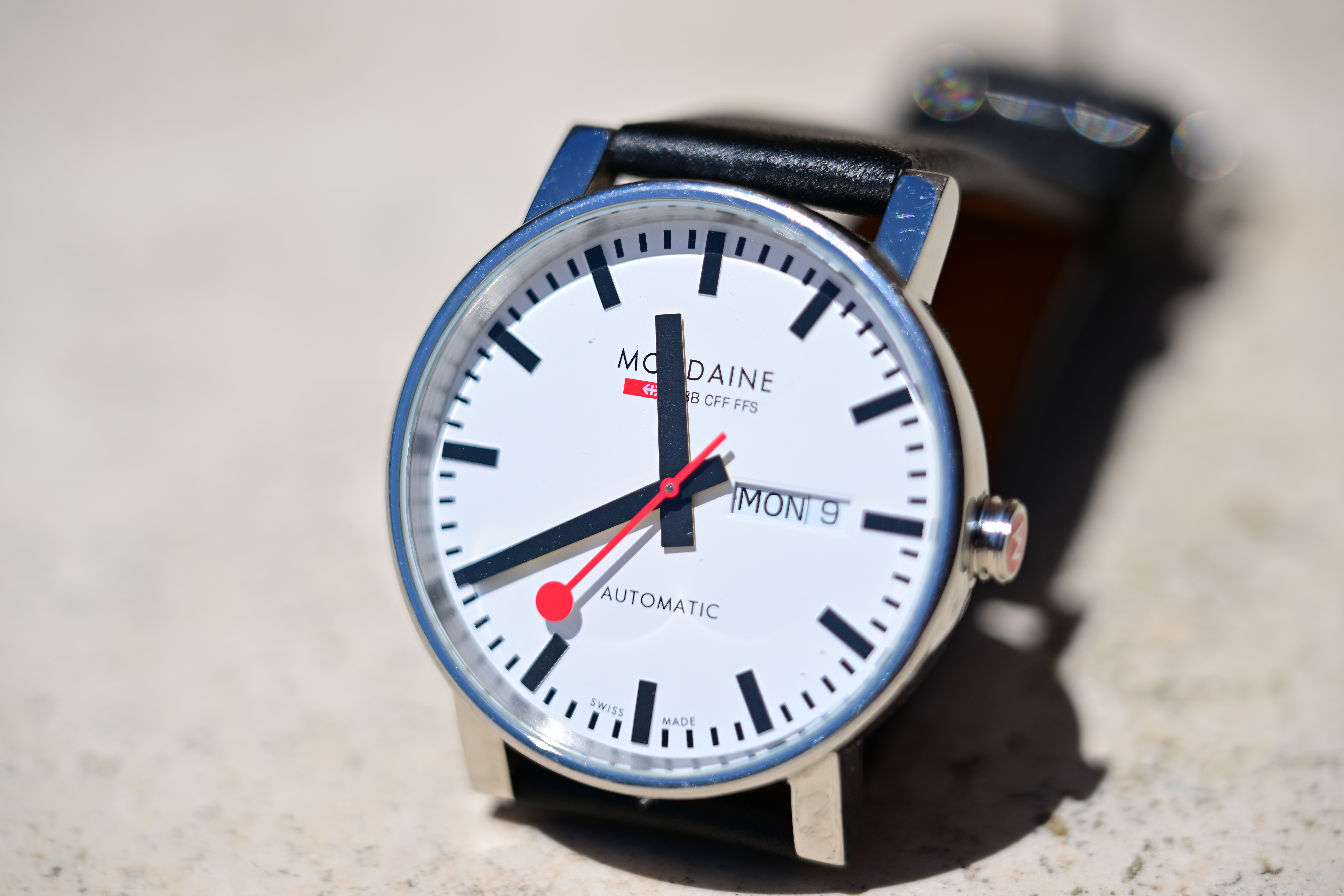 Spherochromatism performance topSpherochromatism, also called secondary spherical chromatic aberration or "color bokeh," is an advanced form of spherical and chromatic aberration in a different dimension than lateral chromatic aberration. It happens mostly in fast normal and tele lenses when spherical aberration at the ends of the color spectrum are corrected differently than in the middle of the spectrum. Spherochromatism can cause colored fringes on out-of-focus highlights, usually seen as green fringes on backgrounds and magenta fringes on foregrounds. Spherochromatism is common in fast lenses of moderate focal length when shooting contrasty items at full aperture. It goes away as stopped down. I can't see any spherochromatism; this lens gets softer this close at f/4 which covers any that might be there, and I can't see any at longer distances where it's sharp. Excellent. Mondaine A132.30348.11SBB at close-focus distance at , May 2022. bigger or camera-original © file.