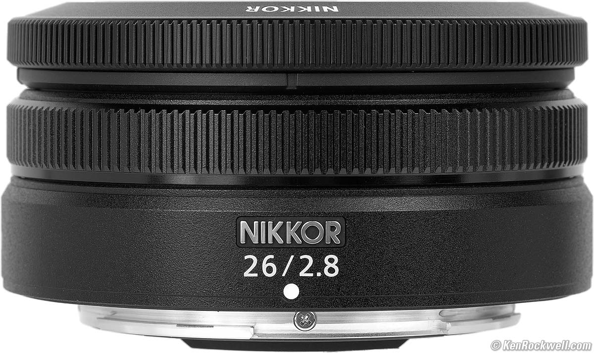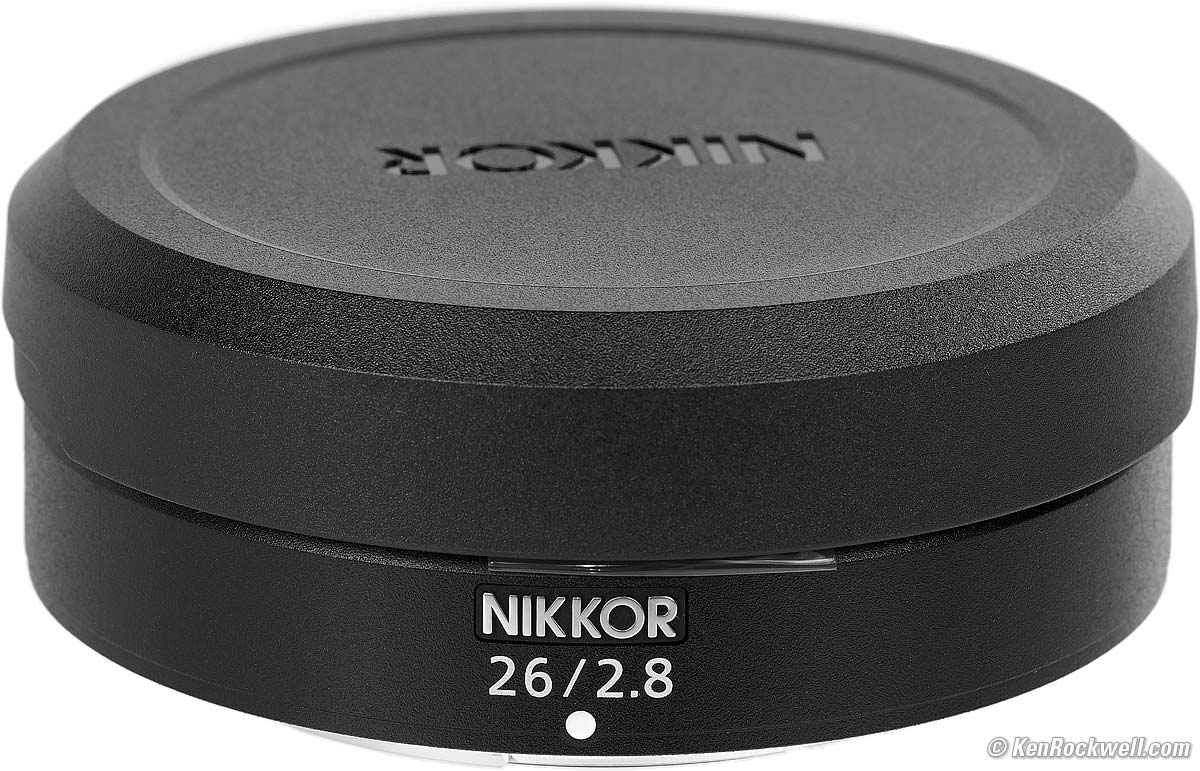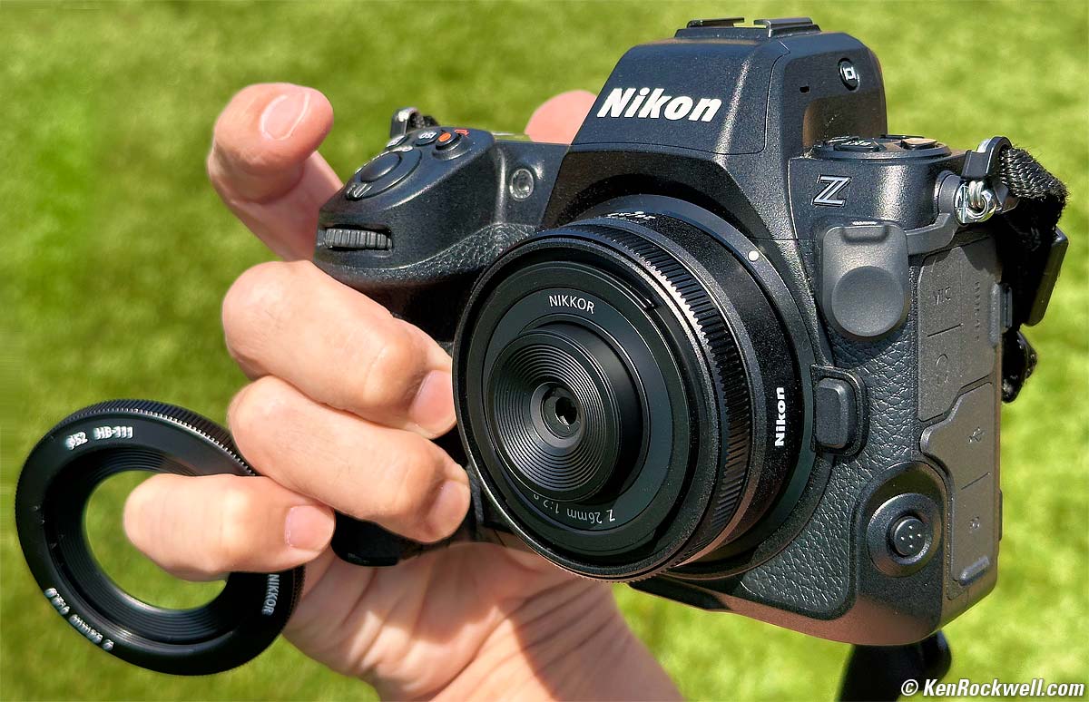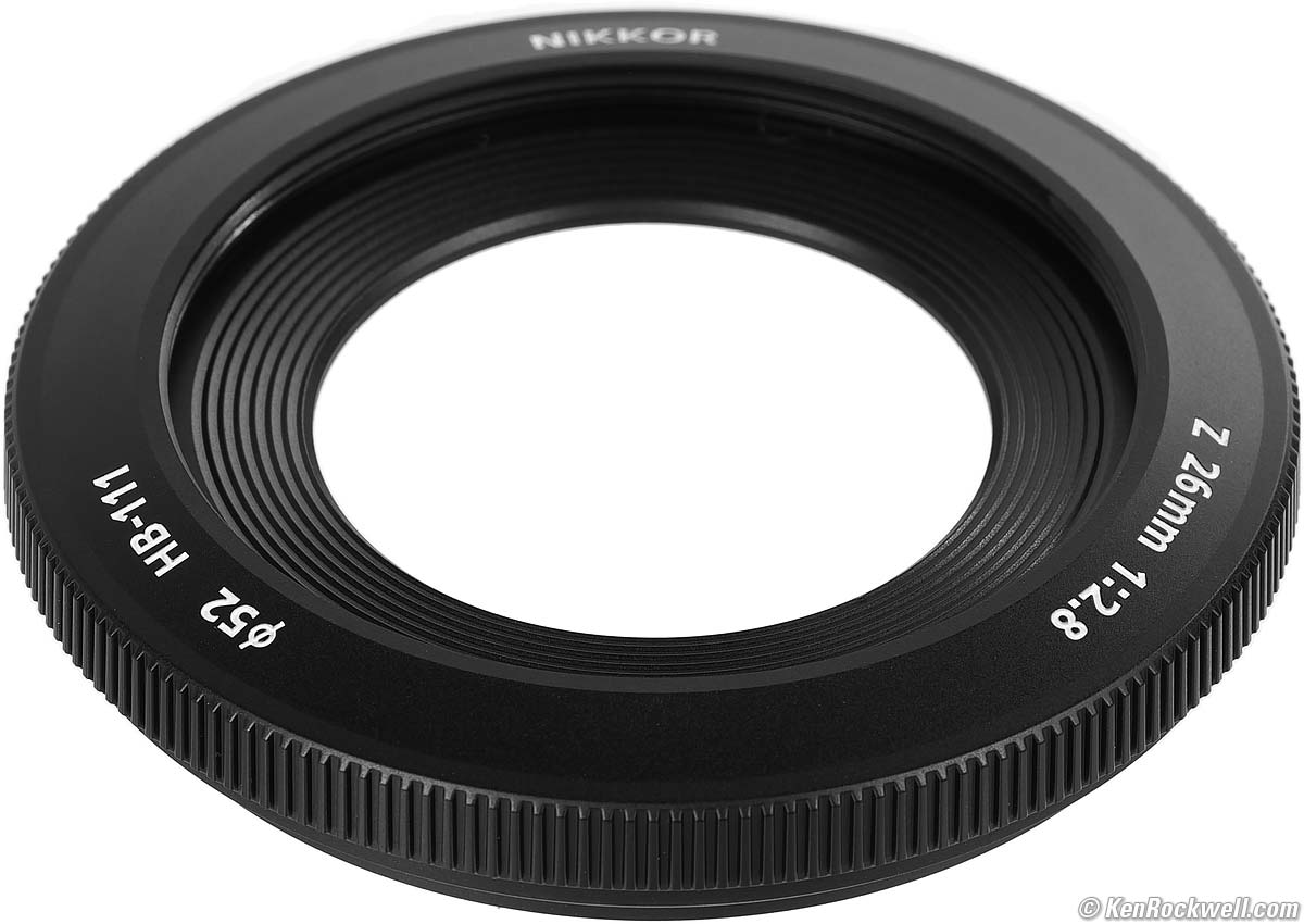 Nikon Z 26mm f/2.8 with HB-111 removed (takes 52mm filters only when used with HB-111 hood, 4.8 oz./136g with hood; 4.3 oz./122g without hood as shown, 0.66'/0.2m close focus, 0.19× macro ratio, $497). bigger. I got mine at B&H. I'd also get mine at Adorama, at Amazon or at Crutchfield, or used at eBay if you know How to Win at eBay. This 100% all-content, junk-free website's biggest source of support is when you use those or any of these links to my personally approved sources I've used myself for way over 100 combined years when you get anything, regardless of the country in which you live — but I receive nothing for my efforts if you get it elsewhere. Nikon does not seal its boxes in any way, so never buy at retail or any other source not on my personally approved list since you'll have no way of knowing if you're missing accessories, getting a defective, damaged, returned, dropped, incomplete, gray-market, store demo or used lens — and all of my personally approved sources allow for 100% cash-back returns for at least 30 days if you don't love your new lens. I've used many of these sources since the 1970s because I can try it in my own hands and return it if I don't love it, and because they ship from secure remote warehouses where no one gets to touch your new lens before you do. Buy only from the approved sources I've used myself for decades for the best prices, service, return policies and selection.