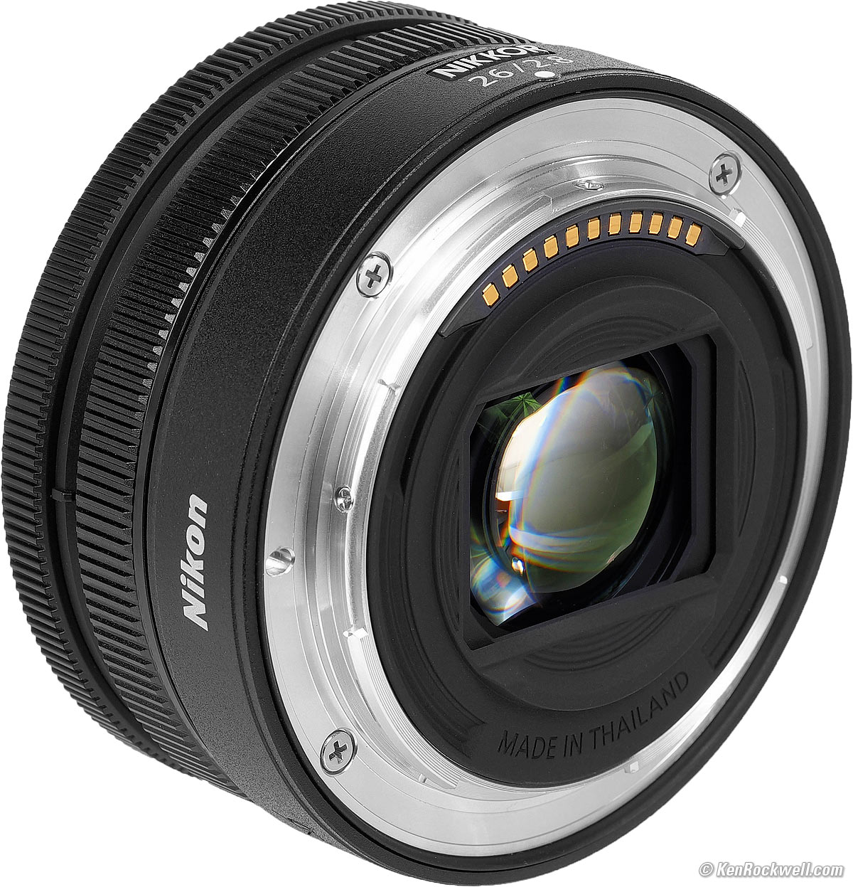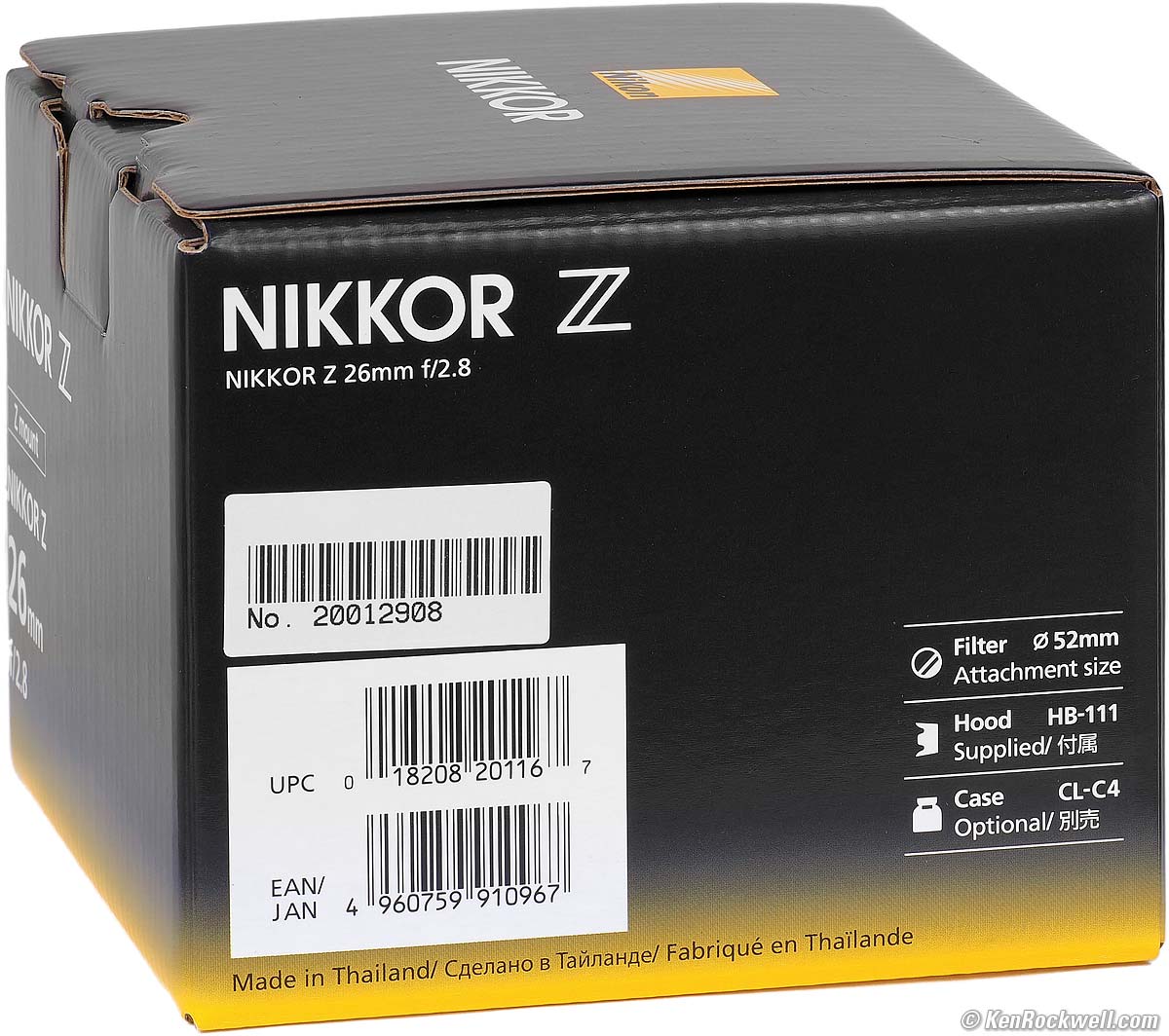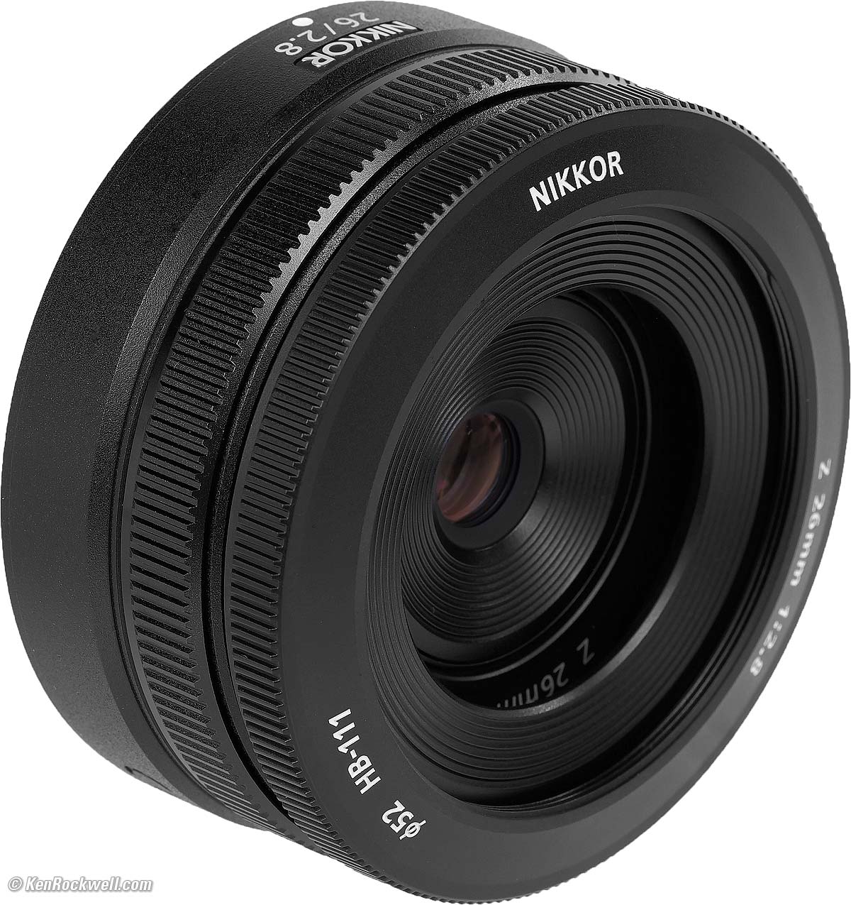 Nikon Z 26mm f/2.8 with HB-111 removed (takes 52mm filters only when used with HB-111 hood, 4.8 oz./136g with hood; 4.3 oz./122g without hood as shown, 0.66'/0.2m close focus, 0.19× macro ratio, $497). bigger. I got mine at B&H. I'd also get mine at Adorama, at Amazon or at Crutchfield, or used at eBay if you know How to Win at eBay. This 100% all-content, junk-free website's biggest source of support is when you use those or any of these links to my personally approved sources I've used myself for way over 100 combined years when you get anything, regardless of the country in which you live — but I receive nothing for my efforts if you get it elsewhere. Nikon does not seal its boxes in any way, so never buy at retail or any other source not on my personally approved list since you'll have no way of knowing if you're missing accessories, getting a defective, damaged, returned, dropped, incomplete, gray-market, store demo or used lens — and all of my personally approved sources allow for 100% cash-back returns for at least 30 days if you don't love your new lens. I've used many of these sources since the 1970s because I can try it in my own hands and return it if I don't love it, and because they ship from secure remote warehouses where no one gets to touch your new lens before you do. Buy only from the approved sources I've used myself for decades for the best prices, service, return policies and selection.