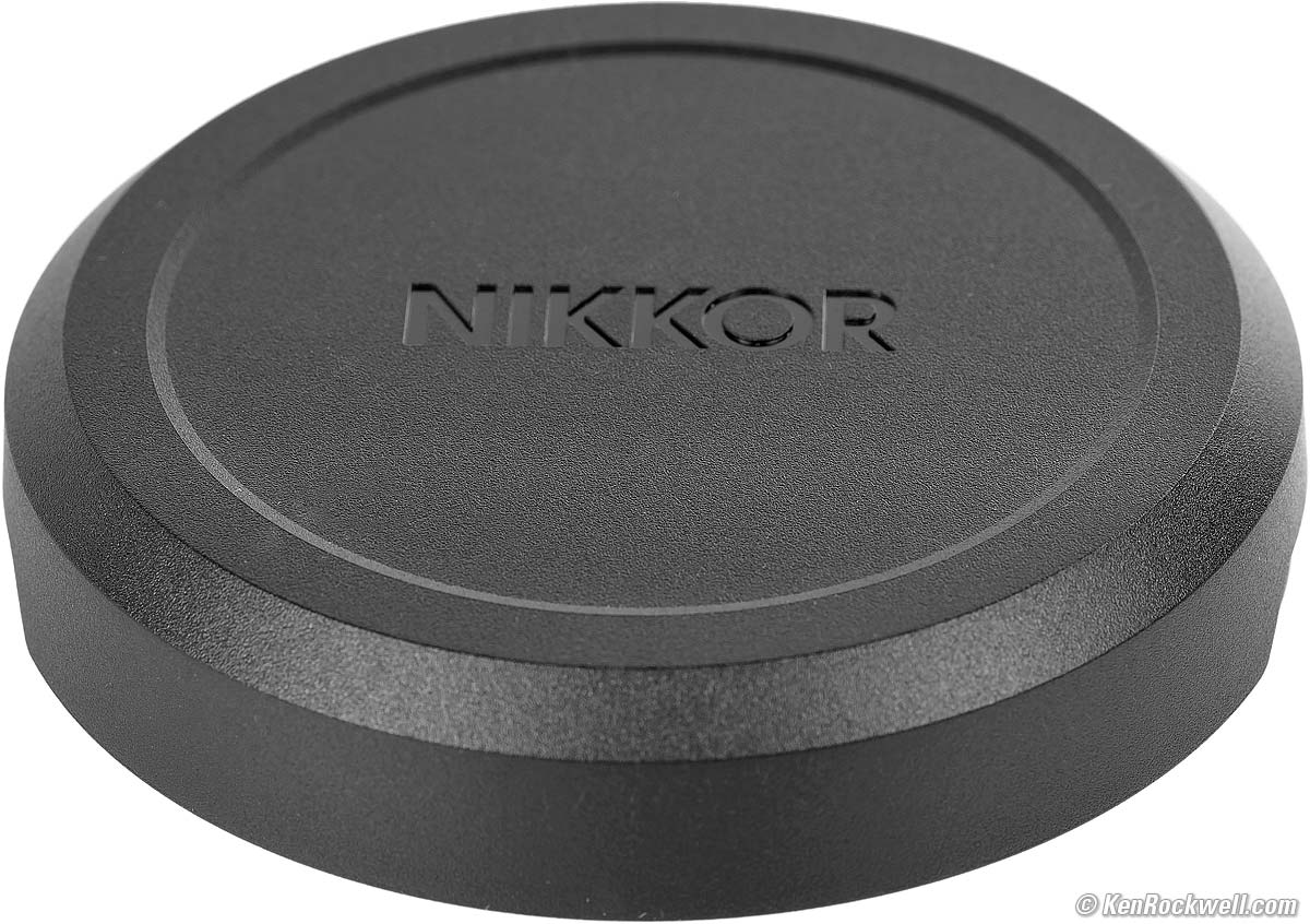 Caps specifications topSpecial LC-K108 push-on front cap (Nikon part number 4279) included: LC-K108 push-on front cap. bigger. It's all plastic, and it's felt-lined so it pushes-on and pulls straight-off like a real cap. It pushes-on to the lens alone which has no filter (or conventional cap) threads: Nikon Z 26mm f/2.8 with LC-K108 but no HB-111 hood. bigger. The LC-K108 also pushes-over the HB-111 hood, so there's no need for a 52mm cap and thus no 52mm cap included.