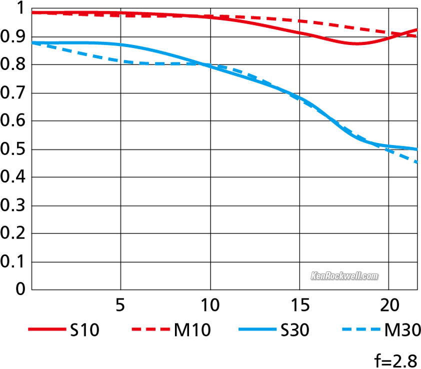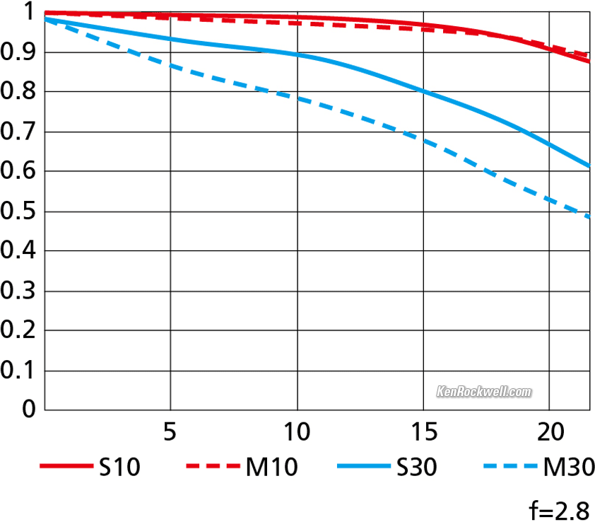 Sharpness performance topLens sharpness has nothing to do with picture sharpness; every lens made in the past 100 years is more than sharp enough to make super-sharp pictures if you know what you're doing. The only limitation to picture sharpness is your skill as a photographer. It's the least talented who spend the most time worrying about lens sharpness and blame crummy pictures on their equipment rather than themselves. Skilled photographers make great images with whatever camera is in their hands; I've made some of my best images of all time with an irreparably broken camera! Most pixels are thrown away before you see them, but camera makers don't want you to know that. If you're not getting ultra-sharp pictures with this, be sure not to shoot at f/11 or smaller where all lenses are softer due to diffraction, always shoot at ISO 100 or below because cameras become softer at ISO 200 and above, avoid shooting across long distances over land which can lead to atmospheric heat shimmer, be sure everything is in perfect focus, set your camera's sharpening as you want it (I set mine to the maximum) and be sure nothing is moving, either camera or subject. If you want to ensure a soft image with any lens, shoot at f/16 or smaller at ISO 1,600 or above at default sharpening in daylight of subjects at differing distances in the same image. People worry waaaaay too much about lens sharpness. It's not 1968 anymore when lenses often weren't that sharp and there could be significant differences among them; ever since about 2010 all new lenses are all pretty much equally fantastic. It's a little bit less sharp in the corners wide-open in the lab, but so what; in actual use it's always sharp corner to corner in actual use at f/2.8, and stopped-down as we usually shoot it, it's ultra sharp everywhere. Bravo!