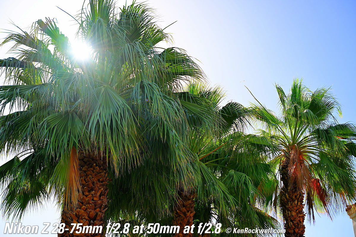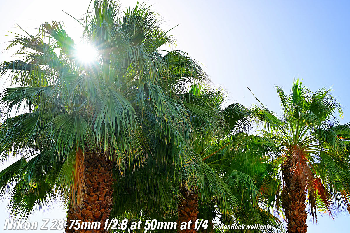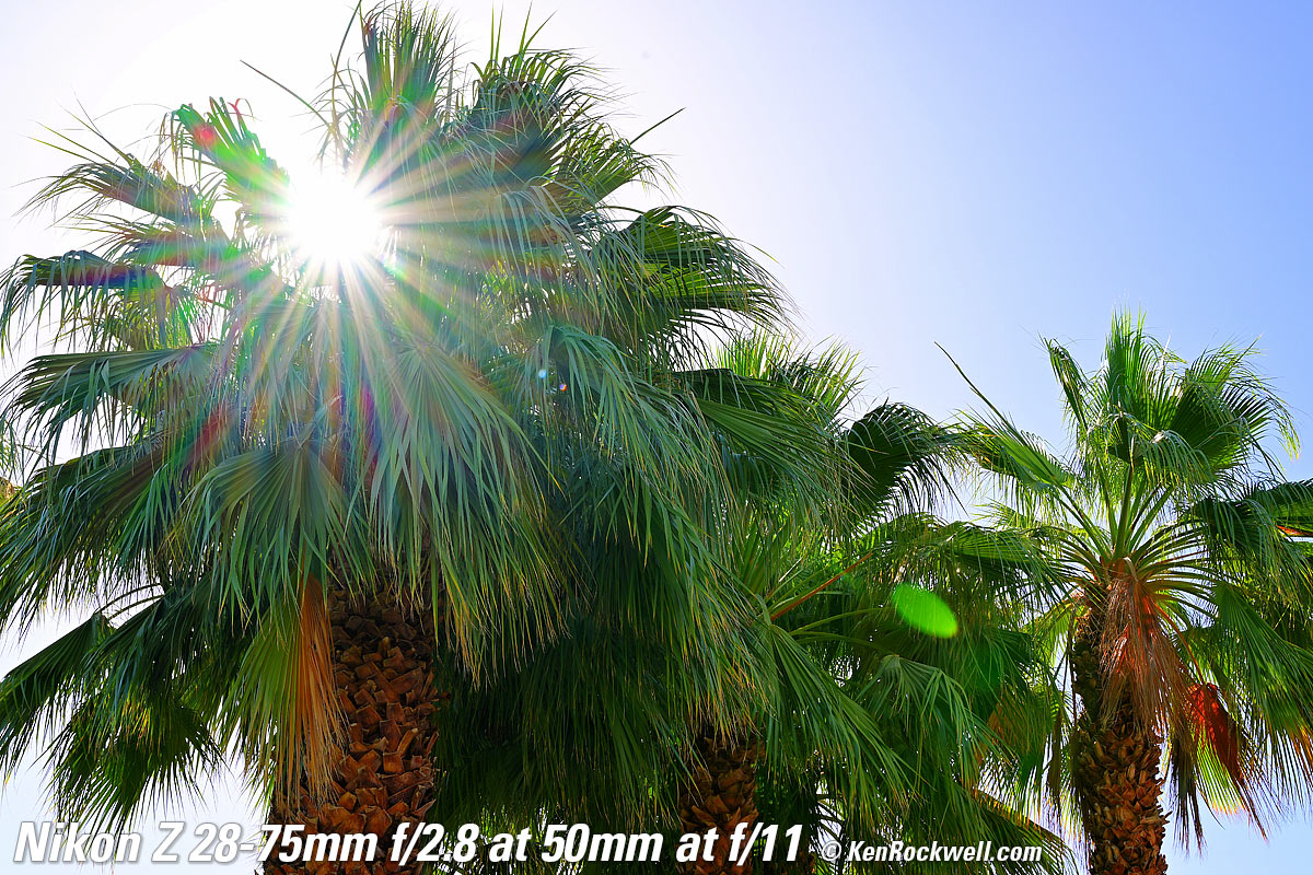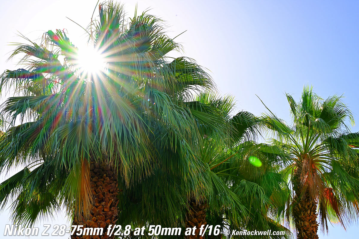 Sunstars performance topWith a 9-bladed rounded diaphragm, I get 18-pointed sunstars on brilliant points of light moderate and small apertures. Ignore the crazy rainbow dots at small apertures; these are sensor artifacts caused by taking a picture directly of the sun and exposing for the dark underside of a huge palm tree, and using that same palm tree to hide the sky to accentuate the stars. Click any to enlarge: Click any to enlarge.
