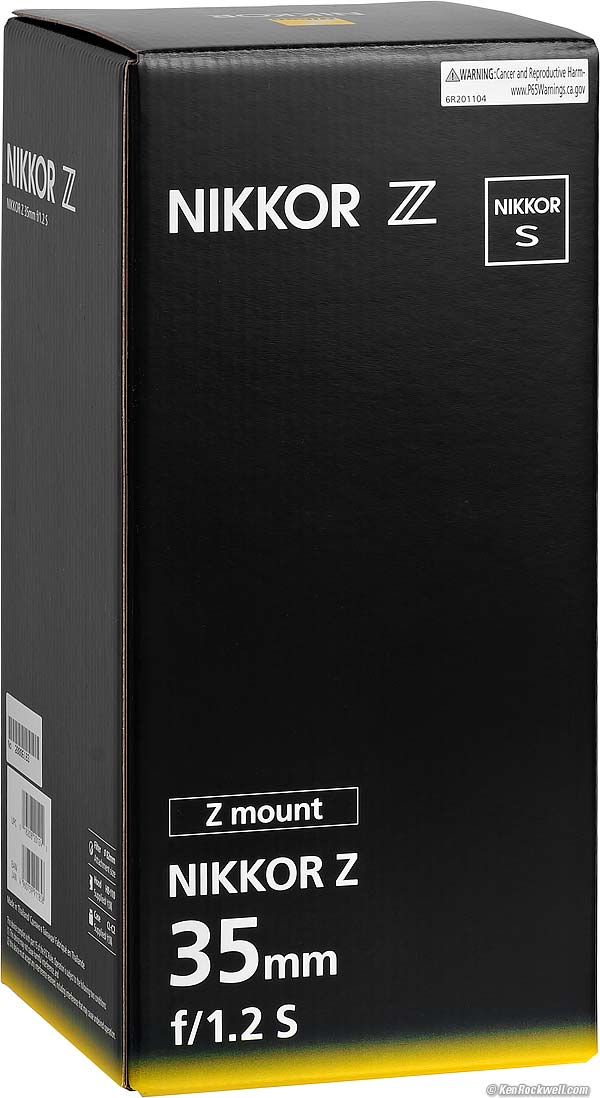 Nikon Z 35mm f/1.2Full Frame (2025 ~ today)Sample Images Intro New Good Bad Missing Specifications Accessories USA Version Performance Compared Recommendations Z9 Z8 Z7 II Z6 III Z6 II Z5 II Zƒ Z7 Z6 Z5 DX (APS-C): Zƒc Z50 II Z50 Z30 Nikon Z 35mm f/1.2S (82mm filters, 37.4 oz./1,060g, 1'/0.3m close focus, 0.2× macro ratio, $2,797). bigger. I got mine at B&H. I'd also get it at Adorama, at Amazon or at Crutchfield, or get it used if you know How to Win at eBay, or get it used at KEH. This 100% all-content, junk-free website's biggest source of support is when you use those or any of these links to my personally approved sources I've used myself for way over 100 combined years when you get anything, regardless of the country in which you live. Nikon does not seal its boxes in any way, so never buy at retail or any other source not on my personally approved list since you'll have no way of knowing if you're missing accessories, getting a defective, damaged, returned, non-USA, store demo or used lens — and all of my personally approved sources allow for 100% cash-back returns for at least 30 days if you don't love your new lens. I've used many of these sources since the 1970s because I can try it in my own hands and return it if I don't love it, and because they ship from secure remote warehouses where no one gets to touch your new lens before you do. Buy only from the approved sources I've used myself for decades for the best prices, service, return policies and selection.