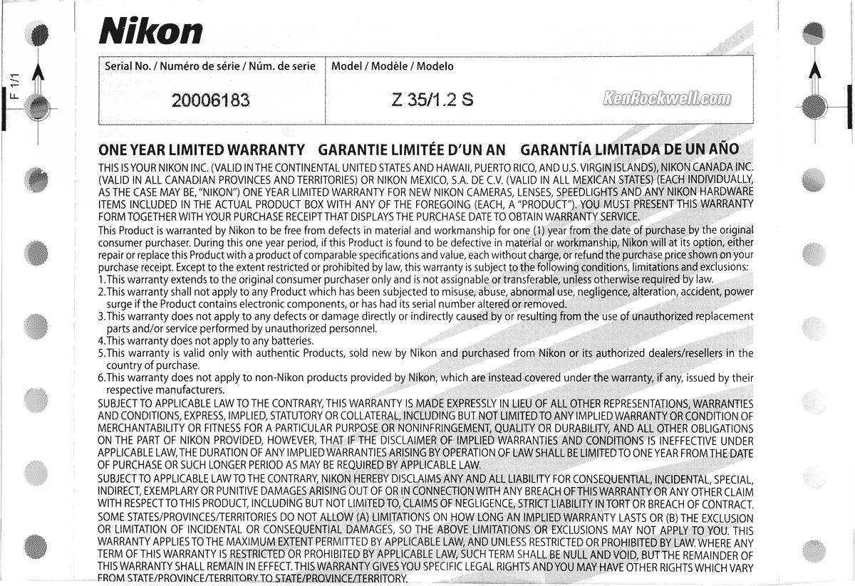 Getting a Legal U. S. A. Version topSample Images Intro New Good Bad Missing Specifications Accessories USA Version Performance Compared Recommendations I got my Z 35mm f/1.2 at B&H. I'd also get it at Adorama, at Amazon or at Crutchfield, or get it used if you know How to Win at eBay, or get it used at KEH. This section applies in the U. S. A. only. You must have a printed USA Warranty Card, and the serial number must match the one on the bottom of your lens, otherwise you have no warranty: Nikon Z 35mm f/1.2 U. S. A. Warranty Card. bigger. If you don't have this card, if the card doesn't say "VALID IN THE CONTINENTAL UNITED STATES" or the serial number on the card doesn't match the one on your camera lens exactly, you got ripped off with a gray market version from another country. All legitimate cameras and lenses come with printed warranty cards, even if you prefer to register online. (The serial number on the outside of the box doesn't have to match, but if it doesn't it means you bought from a shady dealer who took lenses out of boxes and then resold these used lenses cameras as new.) Shifty dealers may include copies of a card from a legitimate U. S. A. product in a gray-market box, hoping you won't check serial numbers and catch their fraud. A card with the wrong serial number means nothing other than that you have no warranty coverage. The warranty is also valid only if you are the original purchaser and only if it was purchased from an authorized dealer. All because a store or someone claims to be authorized doesn't mean they are. That's why I only buy from my personally approved sources. Nikon stopped offering 5-year lens warranties in 2021 in an effort to save themselves money at our expense. Did you notice the clever nod to ancient computer technology? This is printed on tractor-fed paper with tear-off sides and dot-matrix printing of model and serial numbers! If your card lacks these side perforations and tractor holes, beware. Everyone counterfeits laser holograms, but few people have dot-matrix printers floating around to fake these. Always be sure to check your box, warranty card and serial numbers while you can still return it, or just don't buy from unapproved sources or at retail so you'll be able to have your camera serviced and get free updated firmware as needed. This is why I never buy anyplace other than from my personally approved sources. You just can't take the chance of buying elsewhere, especially at any retail store, because non-USA versions have no warranty in the U. S. A., and you may not be able to get firmware or service for it — even if you're willing to pay out-of-pocket for it when you need it! Nikon U. S. A. enforces its trademarks strictly. It's unlikely, but possible that US customs won't let your camera back in the country if you bought a gray-market version in the U. S. A., carried it overseas, and try to bring it back in. (If you take the chance of buying one overseas, be sure you have a receipt to prove you bought it overseas and be prepared to pay duty on it.) If a gray market version saves you $1,000 it may be worth it, but for $200 or less I wouldn't risk having no warranty or support. Get yours from the same places I do and you won't have a problem, but if you take the risk of getting yours elsewhere, be sure to check everything while you still can return it.