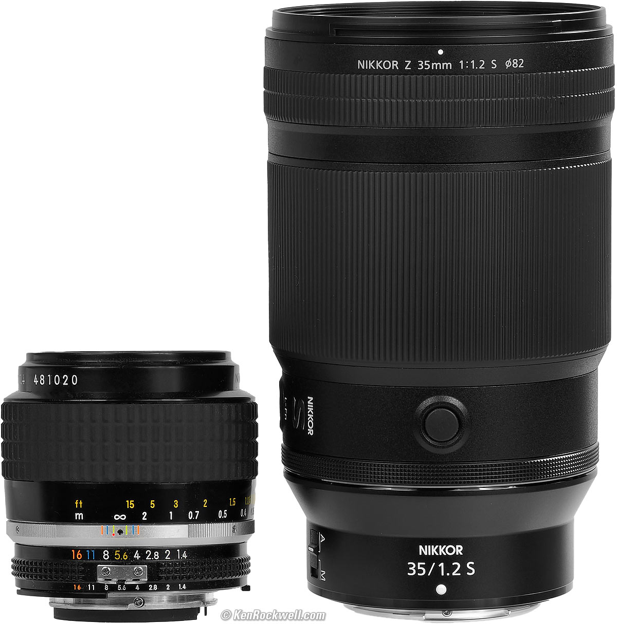 Versus Nikon's first 35mm f/1.4Nikon's first 35mm f/1.4 is strictly manual focus and silly to try to use on mirrorless unless you like to fiddle, but it's also made to last a lifetime out of all metal and glass - not a microgram of plastic on it. Its optics are less contrasty and loaded with coma at f/1.4, but honestly I'm all about feel and I love my original 35mm f/1.4 and will be sending back this plastic f/1.2 wonder — I'm not an astronomer and I prefer zooms for mirrorless (but that's just me). Nikon AI-s 35mm f/1.4 and Z 35mm f/1.2. bigger.