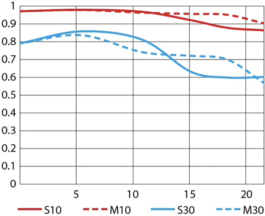 Sharpness performance topLens sharpness has nothing to do with picture sharpness; every lens made in the past 100 years is more than sharp enough to make super-sharp pictures if you know what you're doing. The only limitation to picture sharpness is your skill as a photographer. It's the least talented who spend the most time worrying about lens sharpness and blame crummy pictures on their equipment rather than themselves. Skilled photographers make great images with whatever camera is in their hands; I've made some of my best images of all time with an irreparably broken camera! Most pixels are thrown away before you see them, but camera makers don't want you to know that. If you're not getting ultra-sharp pictures with this, be sure not to shoot at f/11 or smaller where all lenses are softer due to diffraction, always shoot at ISO 100 or below because cameras become softer at ISO 200 and above, be sure everything is in perfect focus, set your camera's sharpening as you want it (I set mine to the maximum) and be sure nothing is moving, either camera or subject. If you want to ensure a soft image with any lens, shoot at f/16 or smaller at ISO 1,600 or above at default sharpening in daylight of subjects at differing distances in the same image. People worry waaaaay too much about lens sharpness. It's not 1968 anymore when lenses often weren't that sharp and there could be significant differences among them; ever since about 2010 all new lenses are all pretty much equally fantastic. This lens is super sharp corner-to corner at every aperture, duh, limited by your vision as an artist and of course by diffraction at the smallest apertures. Avoid f/11 and smaller unless you really need them for extreme depth of field because diffraction takes its toll. See also How to Calculate the Sharpest Aperture. This lens is ultrasharp everywhere, especially at f/1.2, but then again, so is the Z 35mm f/1.4. While you may see slight variation in the MTF curves, any actual photographic difference between the two is invisible: Nikon's MTF chart measured at f/1.2 at 10 cyc/mm and 30 cyc/mm. The solid lines are the sagittal (radial) and the dotted lines are the meridional (tangential) measurements. While it's usually valid to compare rated MTFs between different lenses of similar vintage from the same maker, every maker measures or simply calculates MTF very differently, and therefore one cannot compare these curves between brands. For instance, Sony seems to ignore diffraction and simply calculate overly optimistic MTFs that hug 100%, which no real lens can do at f/8, while other brands are more realistic and include diffraction. Only Canon offers any insight on how they arrive at their curves.