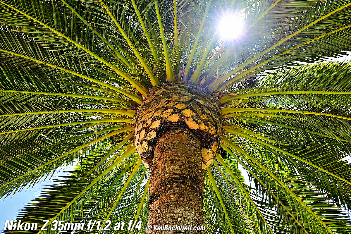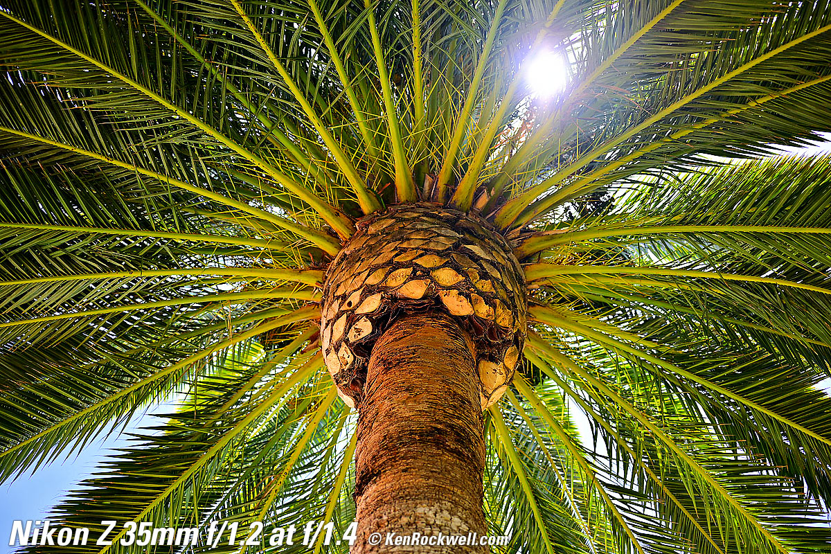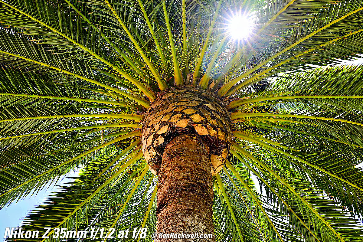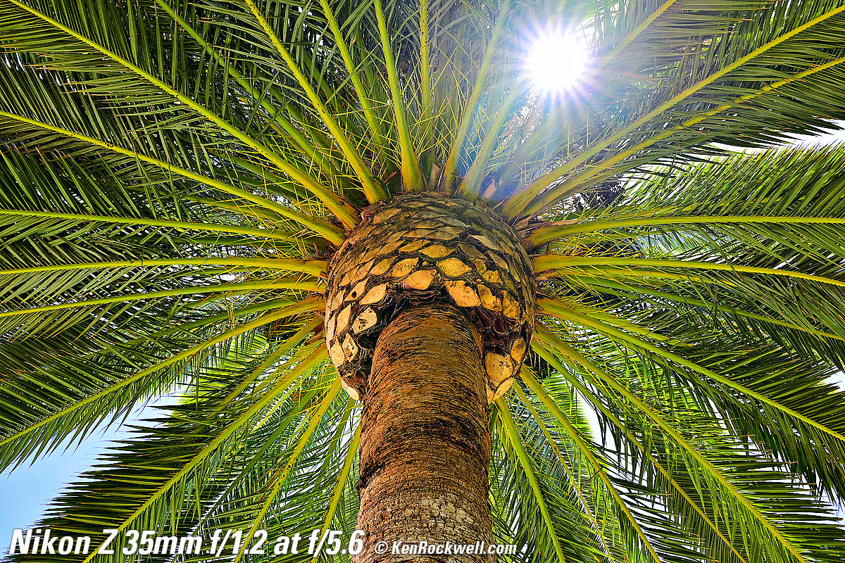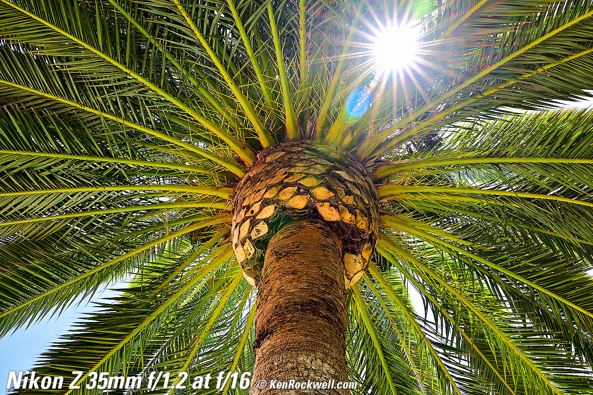 Sunstars performance topWith an 11-bladed rounded diaphragm, I get glorious 22-point sunstars on brilliant points from about f/5.6 and smaller. Ignore the crazy rainbow streaks at f/16; these are sensor artifacts caused by interference among the divisions between pixels on the sensor. These are made visible because we're using enough exposure to show the dark underside of a huge palm tree, and then putting the blinding disk of the mid-day sun in it. Doing this will show everything due to the insane lighting range. Click any to enlarge: Click any to enlarge.