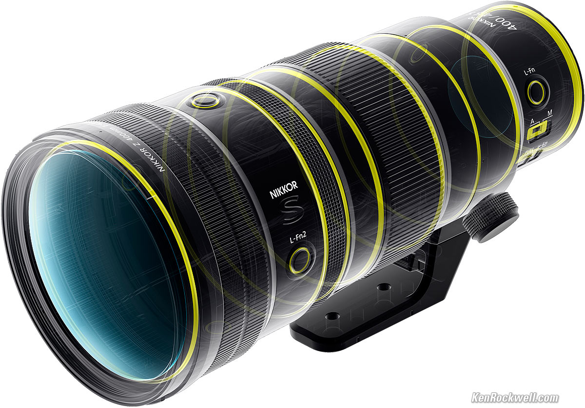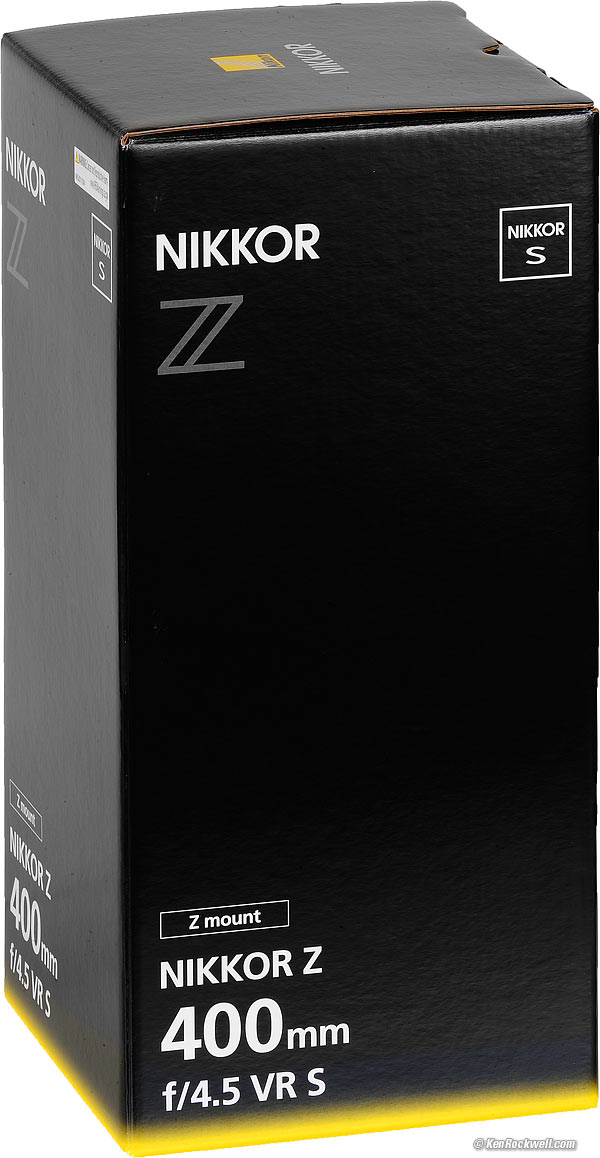 Nikon Z 400mm f/4.5 VRFull-Frame Ultra-light Ultra-TelephotoSample Images Intro New Good Bad Missing Compatibility Specifications Performance Compared User's Guide Recommendations Z9 Z8 Z7 II Z6 III Z6 II Z5 II Zƒ Z7 Z6 Z5 DX (APS-C): Zƒc Z50 II Z50 Z30 Z System Z Lenses All Nikon Lenses Flash Nikon Z 400mm f/4.5 VR (95mm filters, 43.9 oz./1,245g with tripod collar, 40.9 oz./1,160g without, 8'/2.5m close focus, 0.16 × macro ratio, $3,247). bigger. I'd get mine at Adorama, at Amazon, at B&H or at Crutchfield, or used at eBay if you know How to Win at eBay. This 100% all-content, junk-free website's biggest source of support is when you use those or any of these links to my personally approved sources I've used myself for way over 100 combined years when you get anything, regardless of the country in which you live — but I receive nothing for my efforts if you get it elsewhere. Nikon does not seal its boxes in any way, so never buy at retail or any other source not on my personally approved list since you'll have no way of knowing if you're missing accessories, getting a defective, damaged, returned, dropped, incomplete, gray-market, store demo or used lens — and my personally approved sources allow for 100% cash-back returns for at least 30 days if you don't love your new lens. I've used many of these sources since the 1970s because I can try it in my own hands and return it if I don't love it, and because they ship from secure remote warehouses where no one gets to touch your new 400mm lens before you do. Buy only from the approved sources I've used myself for decades for the best prices, service, return policies and selection.