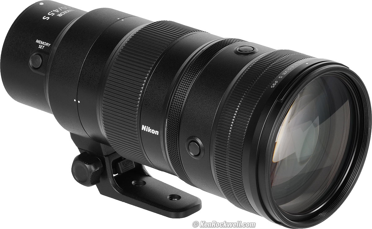 Name specifications topNikon calls this the NIKKOR Z 400mm f/4.5 VR S:NIKKOR: Nikon's brand name for almost all their lenses since 1932. Z: For Nikon's mirrorless cameras, only. VR: Vibration Reduction. S: Subliminally suggests sexual satisfaction. The "S" designation has no other purpose than subliminal seduction; Nikon and electronics and automobile and every kind of marketer have been using letters like "S" and "X" in model numbers since the 1940s for this same reason. Nikon called their first 1946 rangefinder lens mount the "S" mount, then went whole-hog to the "F" SLR mount in 1959, used "S" again when they updated their AI lenses to AI‑S in 1983, created AF‑S SWM lenses in 1998 and here it is again.