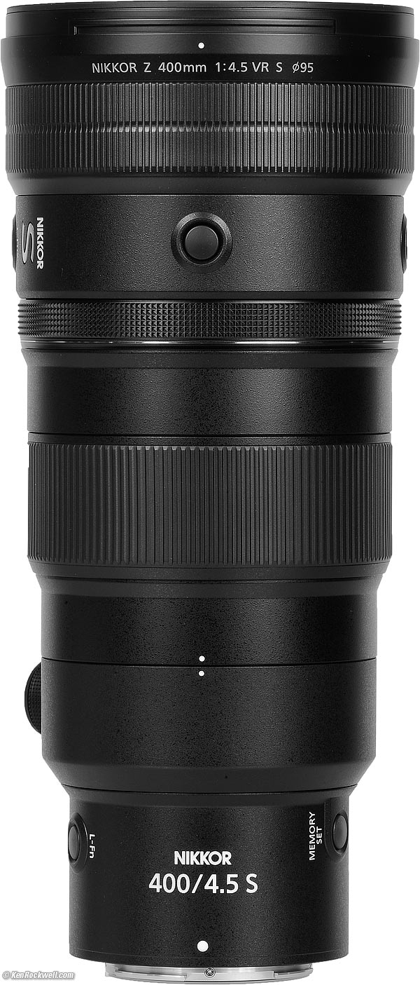 Recommendations topSample Images Intro New Good Bad Missing Compatibility Specifications Performance Compared User's Guide Recommendations I'd get my Z 400mm f/4.5 VR at Adorama, at Amazon, at B&H or at Crutchfield, or used at eBay if you know How to Win at eBay. Lots of people are very excited about this new 400/4.5, but I prefer the Z 100-400mm VR that costs less, focuses much more closely, is smaller and also zooms. Zoom lenses have been more popular than fixed lenses for forty years and there's a very good reason: usefulness, especially for telephotos where zooming with your feet becomes much less practical. Fixed telephoto lenses are great to read about and use for astronomy where you need all the speed you can get and don't want the zoom to creep in a long exposure, but zooms are a huge pain for practical field use because nature is always moving. This 400mm f/4.5 is only slightly lighter than the Z 100-400mm VR but slightly larger, and the Z 100-400mm VR focuses twice as close - especially at 400mm. The only other thing this new Z 400mm f/4.5 VR has on the Z 100-400mm VR is that it is 2/3 of a stop faster at 400mm. Both work great with the TC-1.4× and TC-2× teleconverters. I prefer the Z 100-400/4.5-5.6 VR for its greater flexibility over this fixed 400mm lens, but if you always shoot at 400mm and prefer the 2/3 stop extra speed and don't need to focus more closely than 8' (2.5m), by all means you'll love this lens. I use a clear (UV) protective filter instead of a cap so I'm always ready to shoot instantly. I only use a cap when I throw this in a bag with other gear without padding — which is never. The UV filter never gets in the way, and never gets lost, either. I'd use a German brass 95mm B+W 010 UV MRC filter or Japanese aluminum 95mm Hoya EVO UV to protect this lens. Both have special dirt, dust and smudge resistant multicoatings to stay cleaner longer, so it's your choice of brass or aluminum. The 95mm Hoya HMC filter is also superb, but doesn't have the fancy crud-resistant coatings. Since filters last a lifetime or more, there's no reason not to buy the best as it will last you for the next 40 years. Filters aren't throwaways like digital cameras which we replace every few years, like it or not. I'm still using filters I bought back in the 1970s! I'd get my Z 400mm f/4.5 VR at Adorama, at Amazon, at B&H or at Crutchfield, or eventually used at eBay if you know How to Win at eBay. This 100% all-content, junk-free website's biggest source of support is when you use those or any of these links to my personally approved sources I've used myself for way over 100 combined years when you get anything, regardless of the country in which you live — but I receive nothing for my efforts if you get it elsewhere. Nikon does not seal its boxes in any way, so never buy at retail or any other source not on my personally approved list since you'll have no way of knowing if you're missing accessories, getting a defective, damaged, returned, dropped, incomplete, gray-market, store demo or used lens — and my personally approved sources allow for 100% cash-back returns for at least 30 days if you don't love your new lens. I've used many of these sources since the 1970s because I can try it in my own hands and return it if I don't love it, and because they ship from secure remote warehouses where no one gets to touch your new 400mm lens before you do. Buy only from the approved sources I've used myself for decades for the best prices, service, return policies and selection. Thanks for helping me help you! Ken.