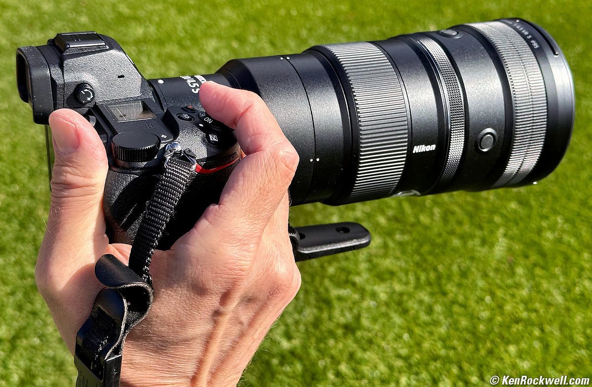 Image Stabilization (VR) performance topOptical Image Stabilization (OIS, IS or VR (Vibration Reduction)) works great. With a stabilized camera I can hand-hold this lightweight champ at 1/30 of a second, even with either of the Z TC 1.4× or Z TC 2× teleconverters. With in-camera stabilization I get a solid 5 stops of real-world improvement, which is fantastic. It's pretty incredible how it locks-down the finder image; without stabilization the image bounces all over while hand-holding, while with stabilization it locks-down solid. One understandable weirdness is that the framing changes wildly from shot-to-shot when making multiple hand-held shots. This is because the stabilizers are compensating for camera motion, which with a hand-held lens this long means everything moves pretty far from one shot to the next. The VR system "resets" for each shot so it can compensate better; it doesn't try to compensate for larger camera motion to try to keep each successive shot framed the same way. "Percent Perfectly Sharp Shots" are the percentage of frames with 100% perfect tripod-equivalent sharpness I get when I'm shooting hand-held while free-standing with no support or bracing. Hand tremor is a random occurrence, so at marginal speeds some frames will be perfectly sharp while others will be in various stages of blur — all at the same shutter speed. This rates what percentage of shots are perfectly sharp, not how sharp are all the frames: