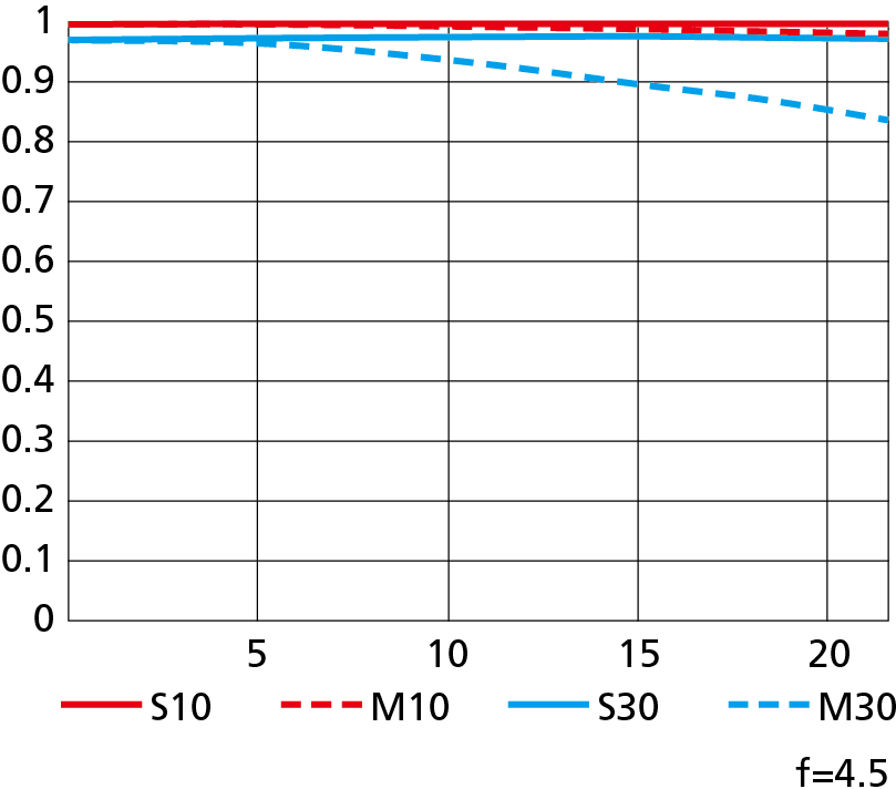 Even if you turn off Vignette Correction there isn't any significant falloff except maybe a little wide-open at f/4.5. Remember, these gray-on-gray shots exaggerate this: