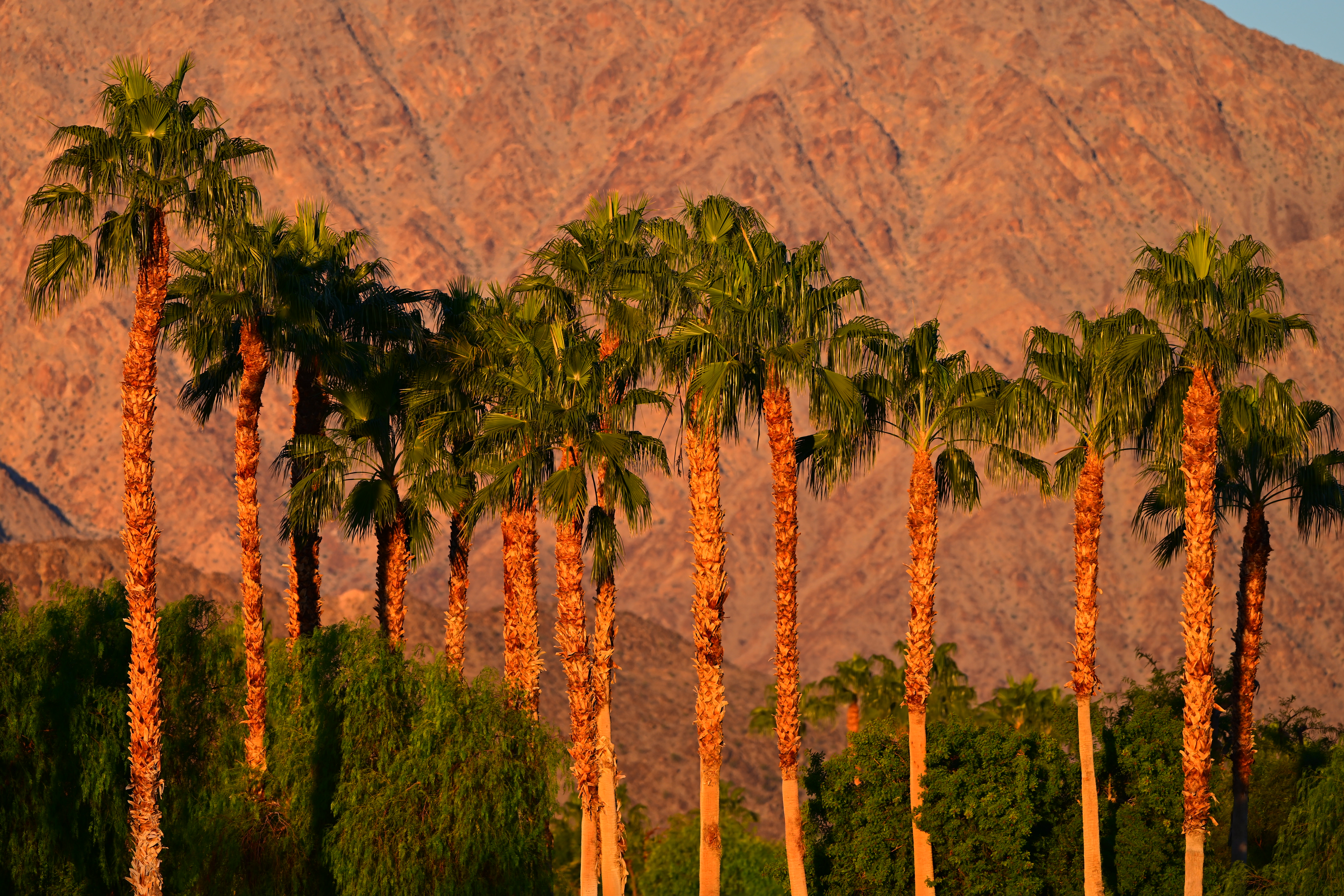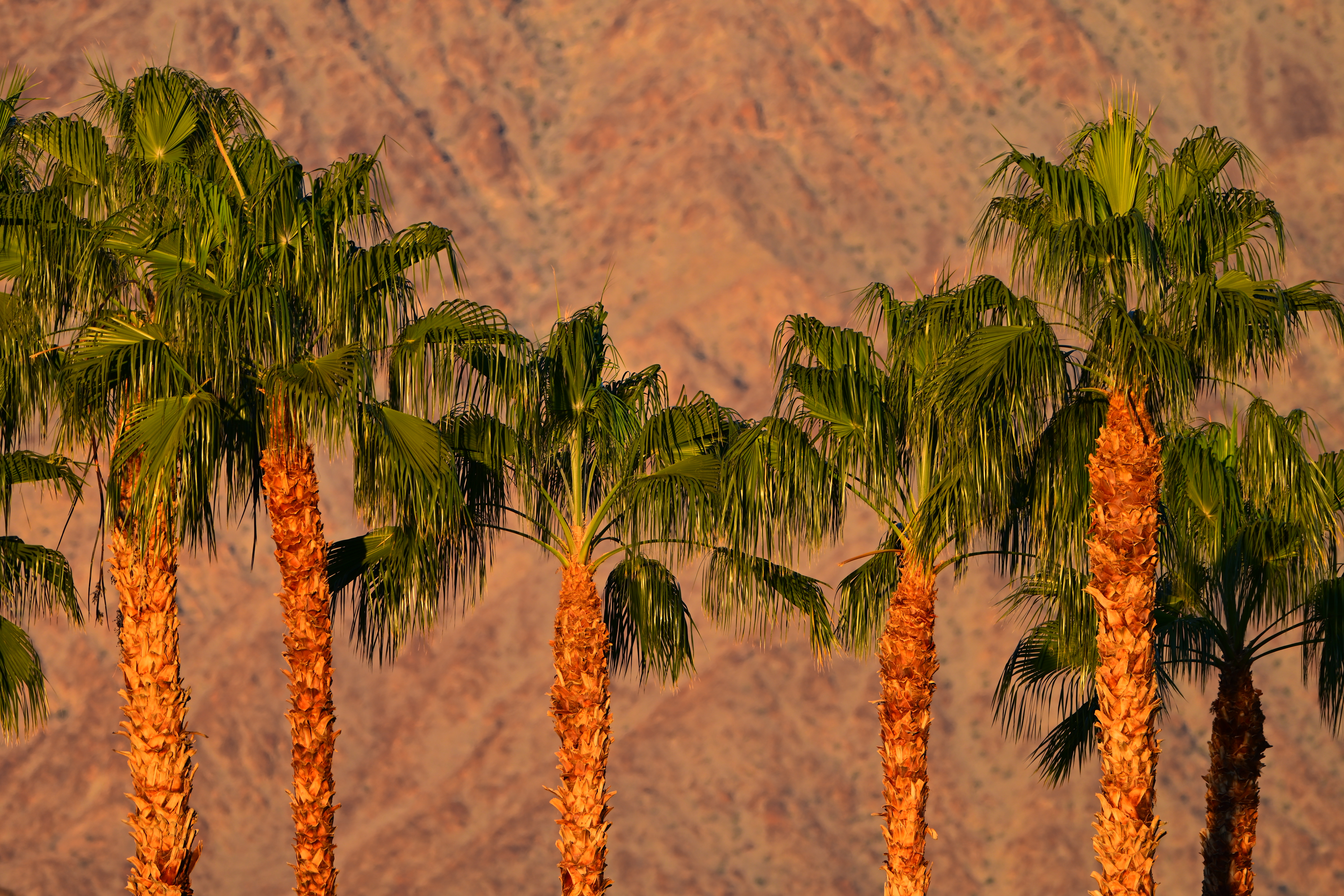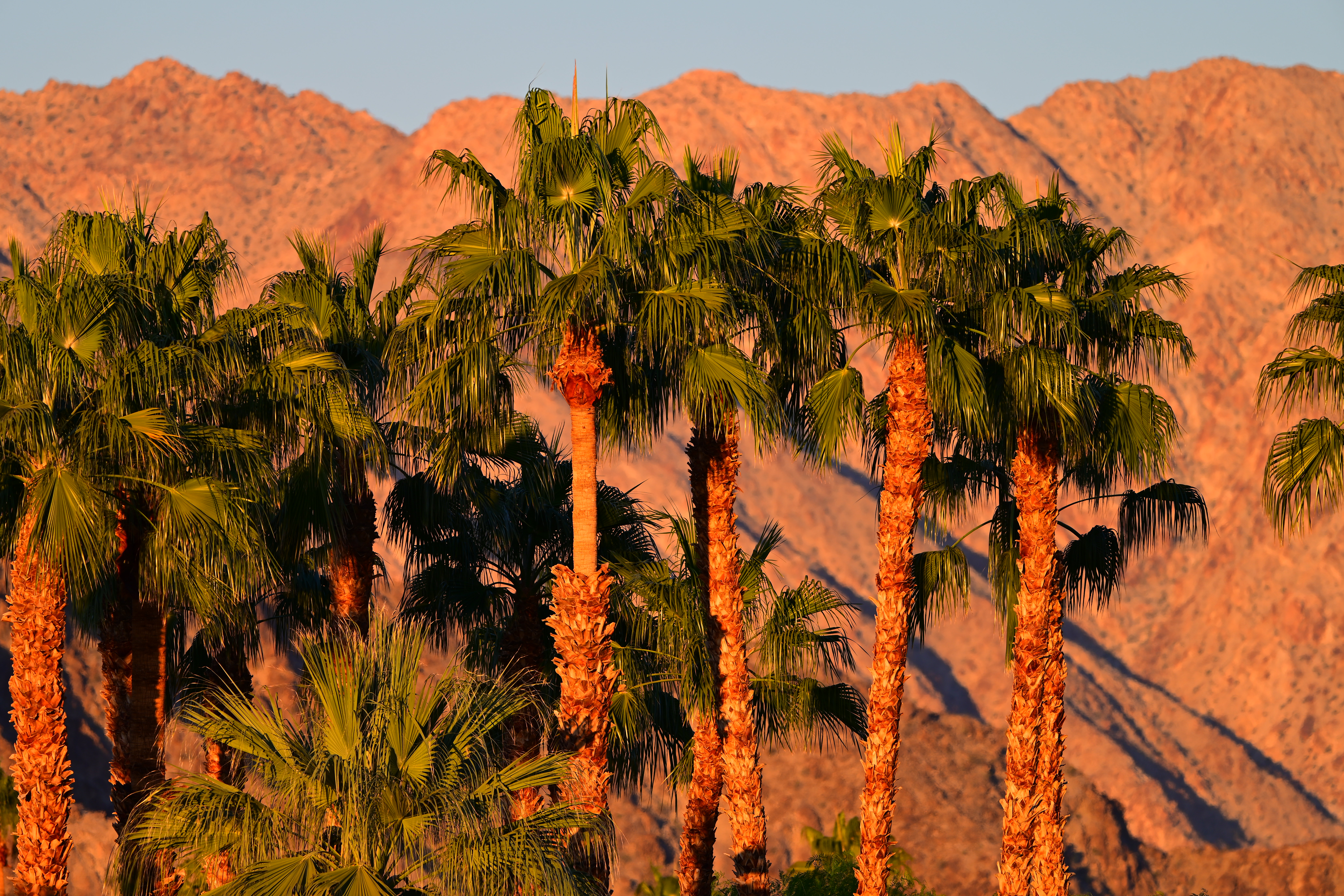 Desert Palms and Mountains at Dawn, 7:38 AM, Monday, 14 November 2022. Nikon Z7 II, Nikon Z 400mm f/4.5 VR with Z TC 1.4× teleconverter (making this a 560mm lens) wide open at f/6.3 hand-held at 1/125 at Auto ISO 64 (LV 12.9), as shot. bigger or camera-original 45 MP © 9 MB JPG file.