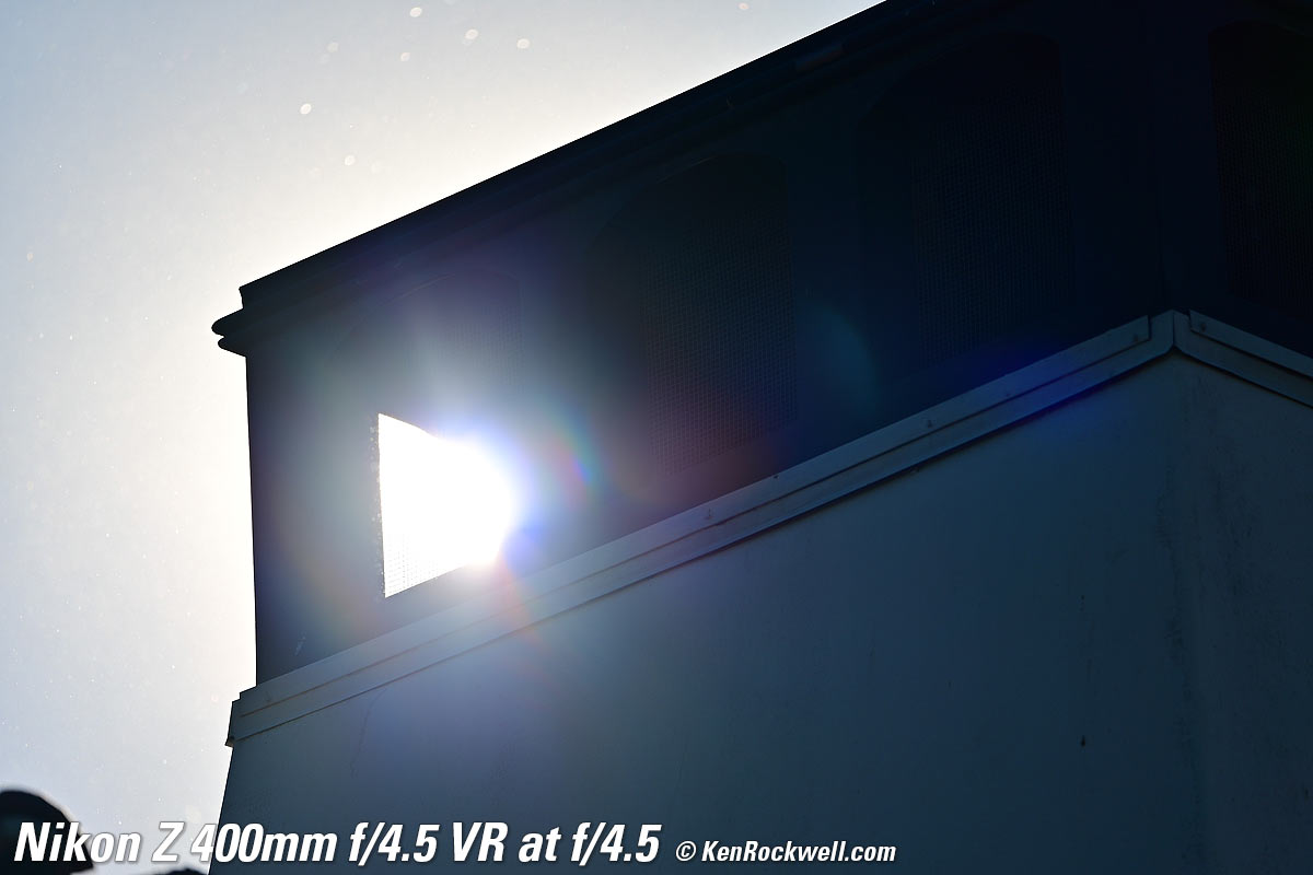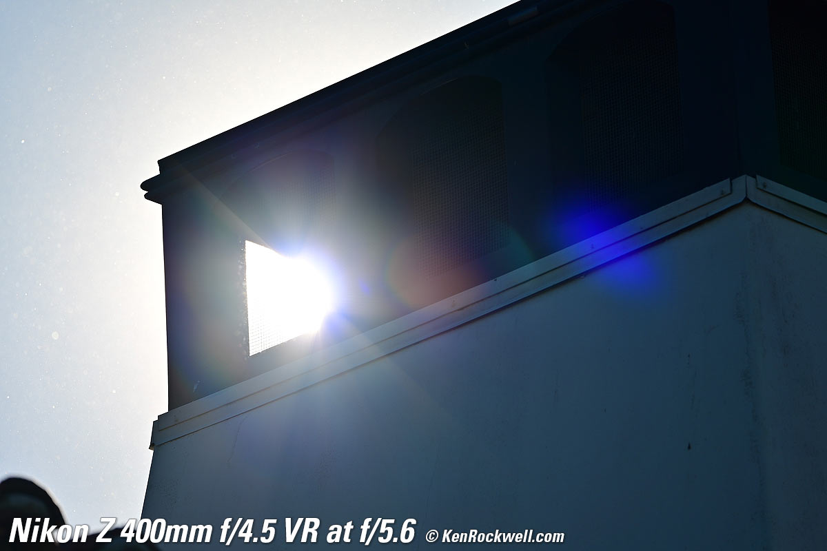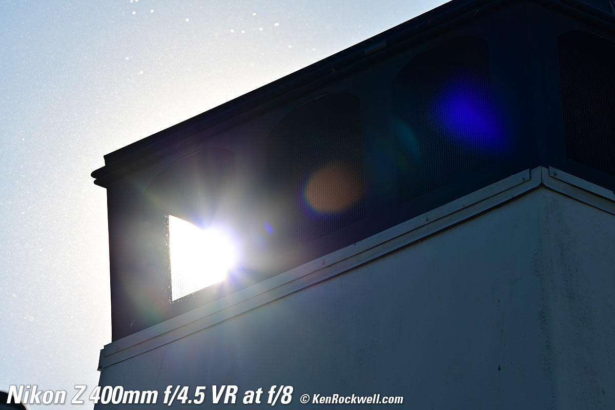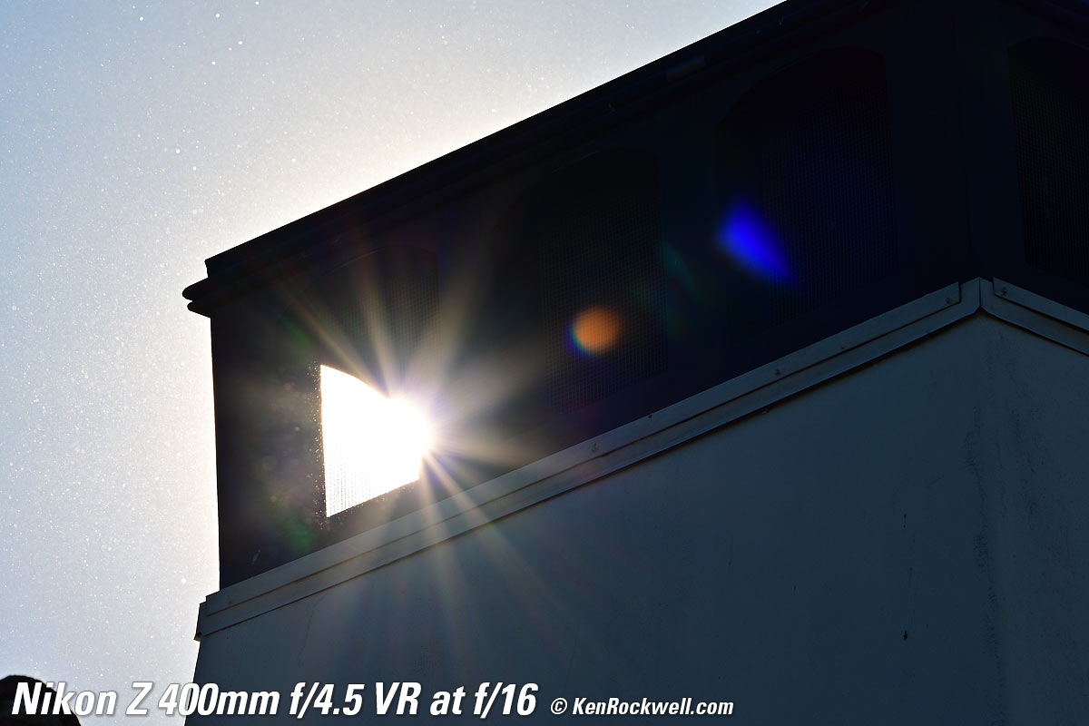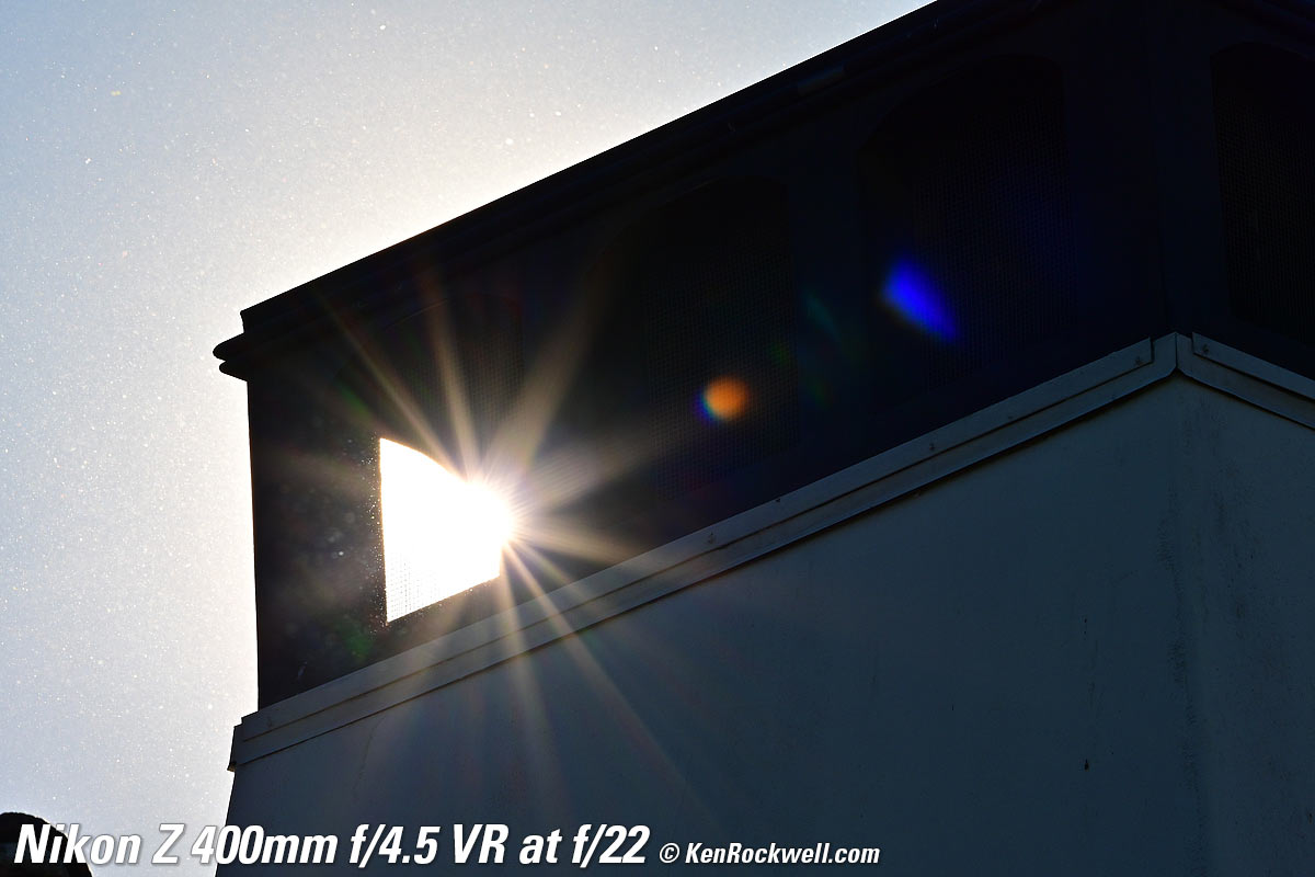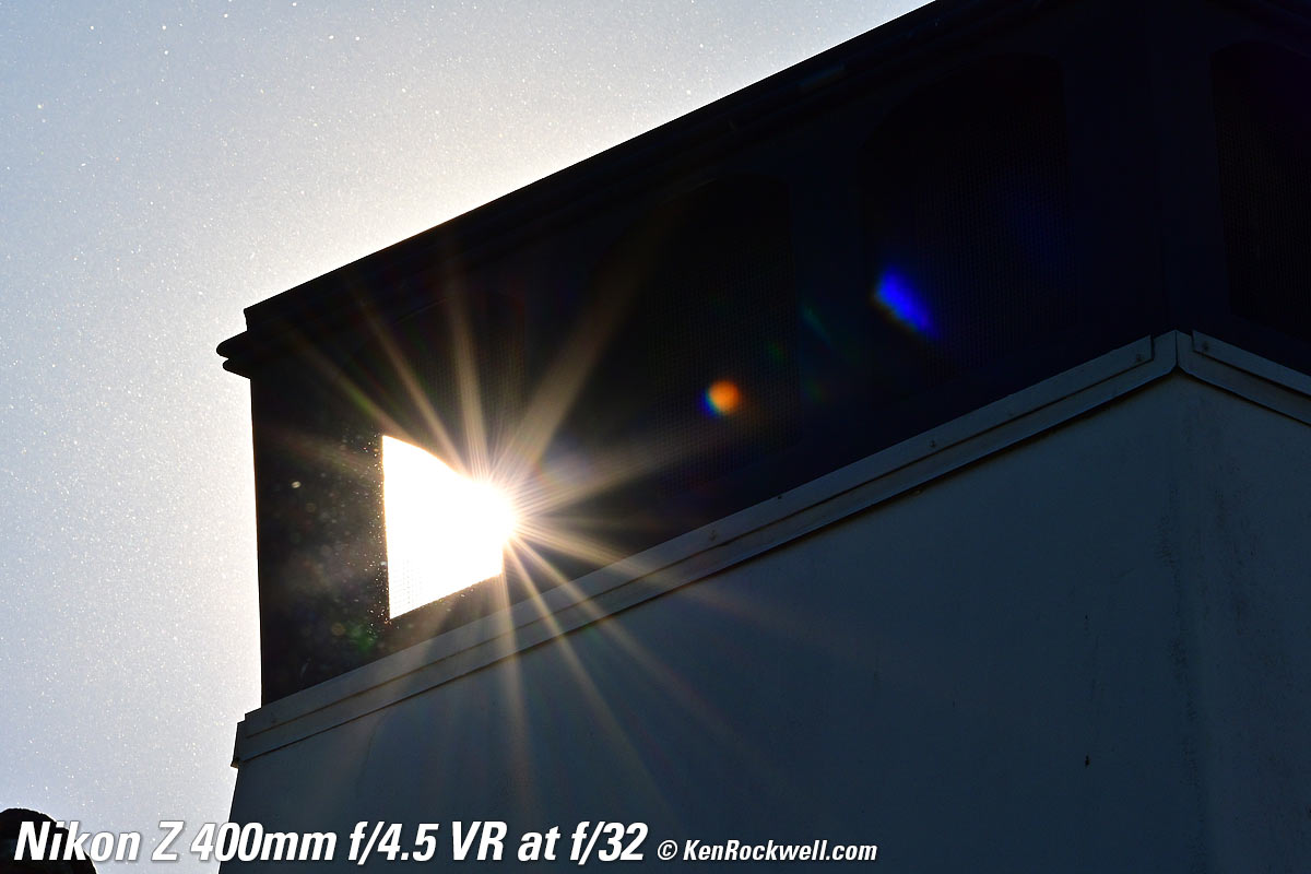 Sunstars performance topWith a 9-bladed rounded diaphragm, I get 18-pointed sunstars on brilliant points of light at the smaller apertures. Ignore all the bugs and dust in the air, which are the white dots flying around in this extreme backlight situation. The stars won't be sharp because the disc of the sun is so large with this 400mm ultratele. The real benefit of sunstars with this lens will be with long-distance night photography where streetlights would sparkle. Click any to enlarge: Click any to enlarge.