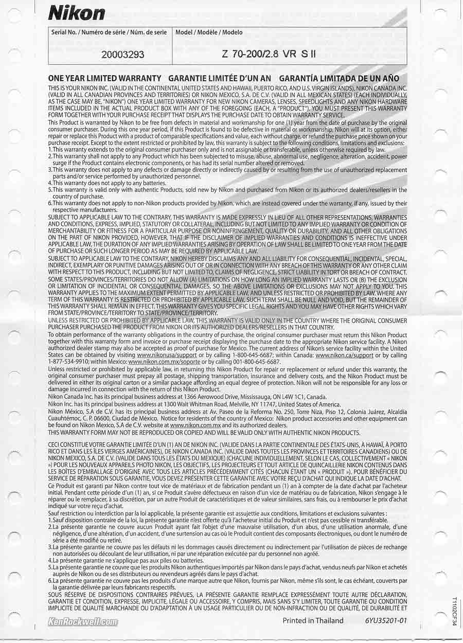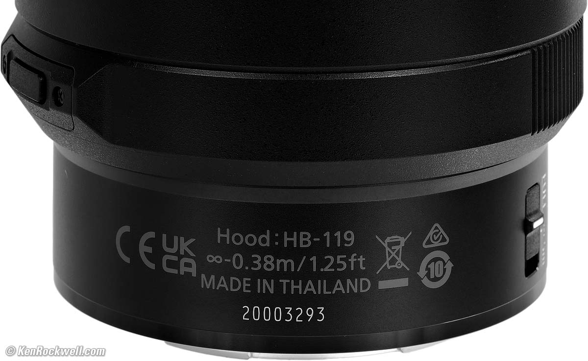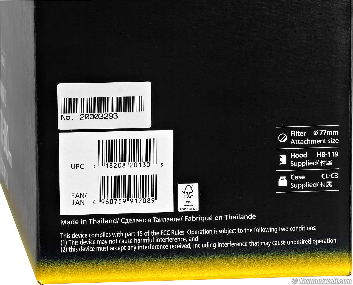 This section applies in the U. S. A. only.Your box must include a USA Warranty Card sitting on the top as you open it, and the serial number must match the one on the bottom of your lens, otherwise you have no warranty: U. S. A. Warranty Card. bigger. If you don't have this card, if the card doesn't say "VALID IN THE CONTINENTAL UNITED STATES" or the serial number on the card doesn't match the one on your camera lens exactly, you got ripped off with a gray market version from another country. All legitimate cameras and lenses come with printed warranty cards, even if you prefer to register online. (The serial number on the outside of the box doesn't have to match, but if it doesn't it means you bought from a shady dealer who took cameras lenses out of boxes and then resold these used lenses cameras as new.) The U. S. A. warranty card comes from "Nikon Inc.," the U. S. A. office; the Japanese headquarters is "Nikon Corporation." The warranty is also valid only if you are the original purchaser and only if it was purchased from an authorized dealer. All because a store or someone claims to be authorized doesn't mean they are. That's why I buy only from my personally approved sources. Shifty dealers may include copies of a card from a legitimate U. S. A. product in a gray-market box, hoping you won't check serial numbers and catch their fraud. A card with the wrong serial number means nothing other than that you have no warranty coverage. Nikon stopped offering 5-year lens warranties in 2021 in an effort to save themselves money at our expense. Did you notice the clever nod to ancient computer technology? This is printed on tractor-fed paper with tear-off sides and dot-matrix printing of model and serial numbers! If your card lacks these side perforations, beware. Everyone counterfeits laser holograms, but few people have dot-matrix printers floating around to fake these. Always be sure to check your box, warranty card and serial numbers while you can still return it, or just don't buy from unapproved sources or at retail so you'll be able to have your camera serviced and get free updated firmware as needed. This is why I never buy anyplace other than from my personally approved sources. You just can't take the chance of buying elsewhere, especially at any retail store, because non-USA versions have no warranty in the U. S. A., and you may not be able to get firmware or service for it — even if you're willing to pay out-of-pocket for it when you need it! Nikon U. S. A. enforces its trademarks strictly. It's unlikely, but possible that US customs won't let your camera back in the country if you bought a gray-market version in the U. S. A., carried it overseas, and try to bring it back in. (If you take the chance of buying one overseas, be sure you have a receipt to prove you bought it overseas and be prepared to pay duty on it.) If a gray market version saves you $1,000 it may be worth it, but for $600 or less I wouldn't risk having no warranty or support. U. S. A. versions include two giant folded single-sheet multi-language basic manuals, one talking about the tripod collar and polyprophylactic ring, and the other only a basic guide to all Z lenses. There's also another sheet, I think it's silly safety warnings. Sadly there is no real manual included specific to this lens with specifications or features. Get yours from the same places I do and you won't have a problem, but if you take the risk of getting yours elsewhere, be sure to check everything while you still can return it.