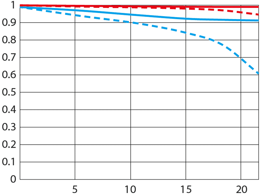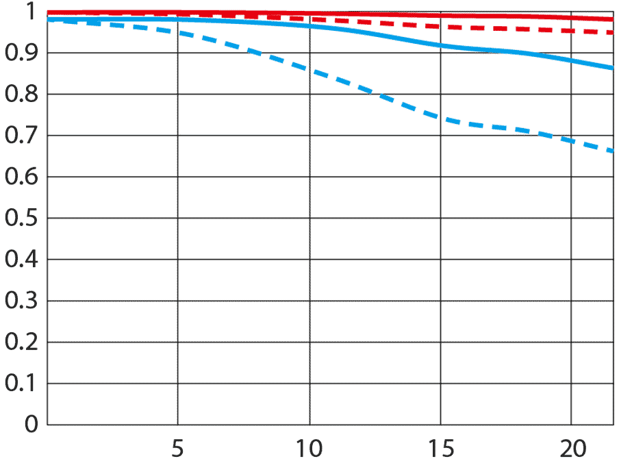 Nikon's MTF charts at 10 cyc/mm and 30 cyc/mm. Sagittal (radial) shown as solid lines. Meridional (tangential) shown as dashed lines. While it's usually valid to compare rated MTFs between different lenses of similar vintage from the same maker, every maker measures or simply calculates MTF very differently, and therefore one cannot compare these curves between brands. For instance, Sony seems to ignore diffraction and simply calculate overly optimistic MTFs that hug 100%, which no real lens can do at f/8, while other brands are more realistic and include diffraction. Only Canon offers any insight on how they arrive at their curves. See also my article on MTF and Canon's article on MTFs.