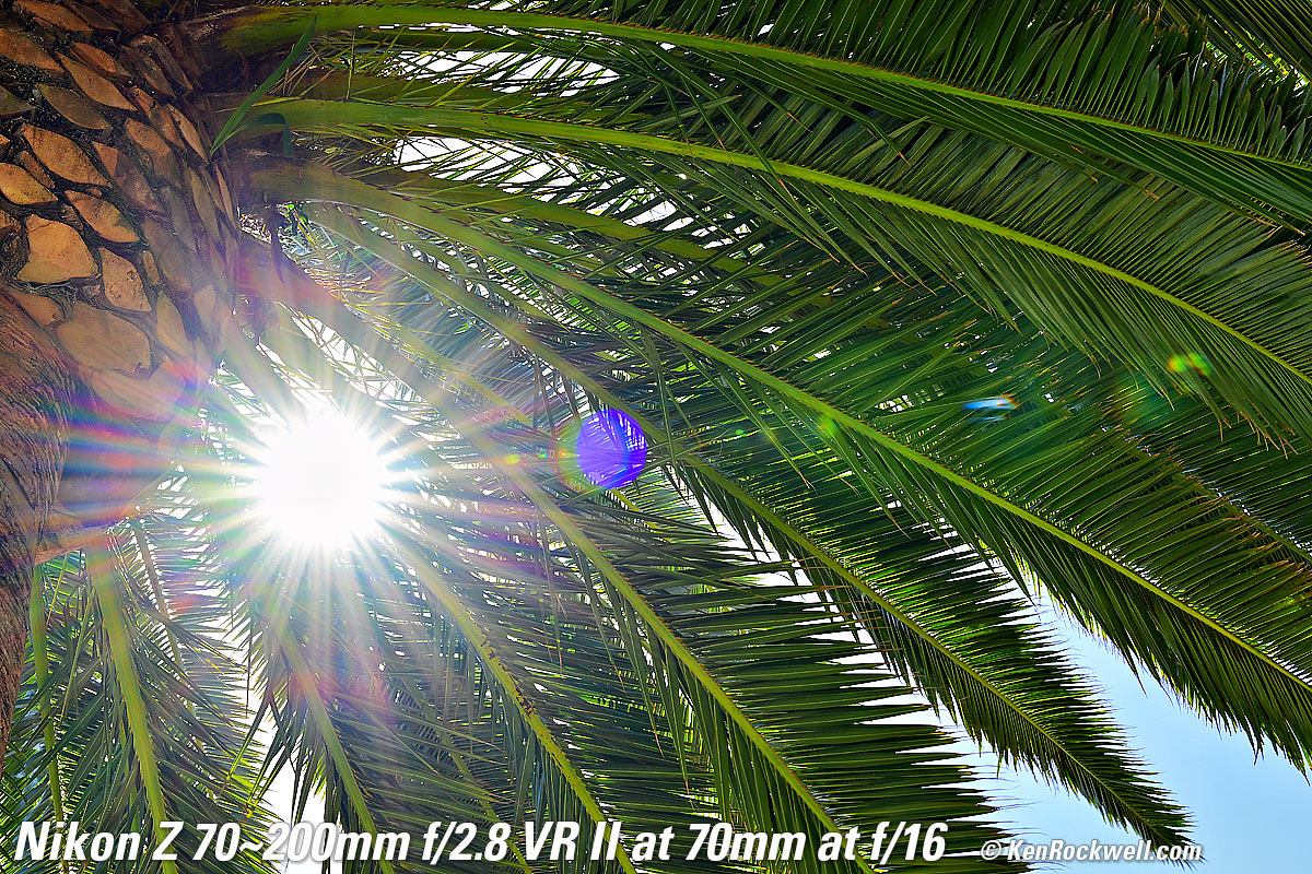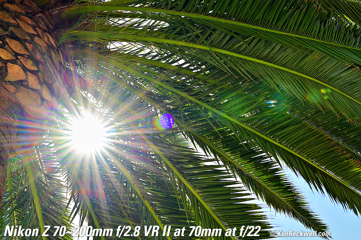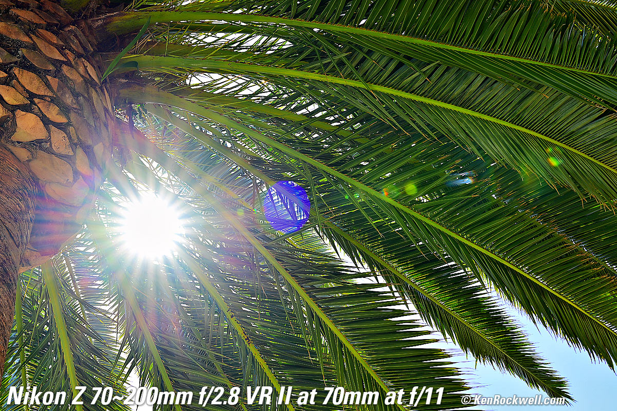 Sunstars performance topWith an 11-bladed rounded diaphragm, I get 22-pointed sunstars on brilliant points of light only at the smallest apertures. Ignore the crazy rainbows at small apertures; these are sensor artifacts caused by interference among the divisions between pixels on the sensor. These are made visible because we're using enough exposure to show the dark underside of a huge palm tree, and then putting the blinding disk of the mid-day sun in it. Doing this will show everything due to the insane lighting range. Click any to enlarge: Click any to enlarge.