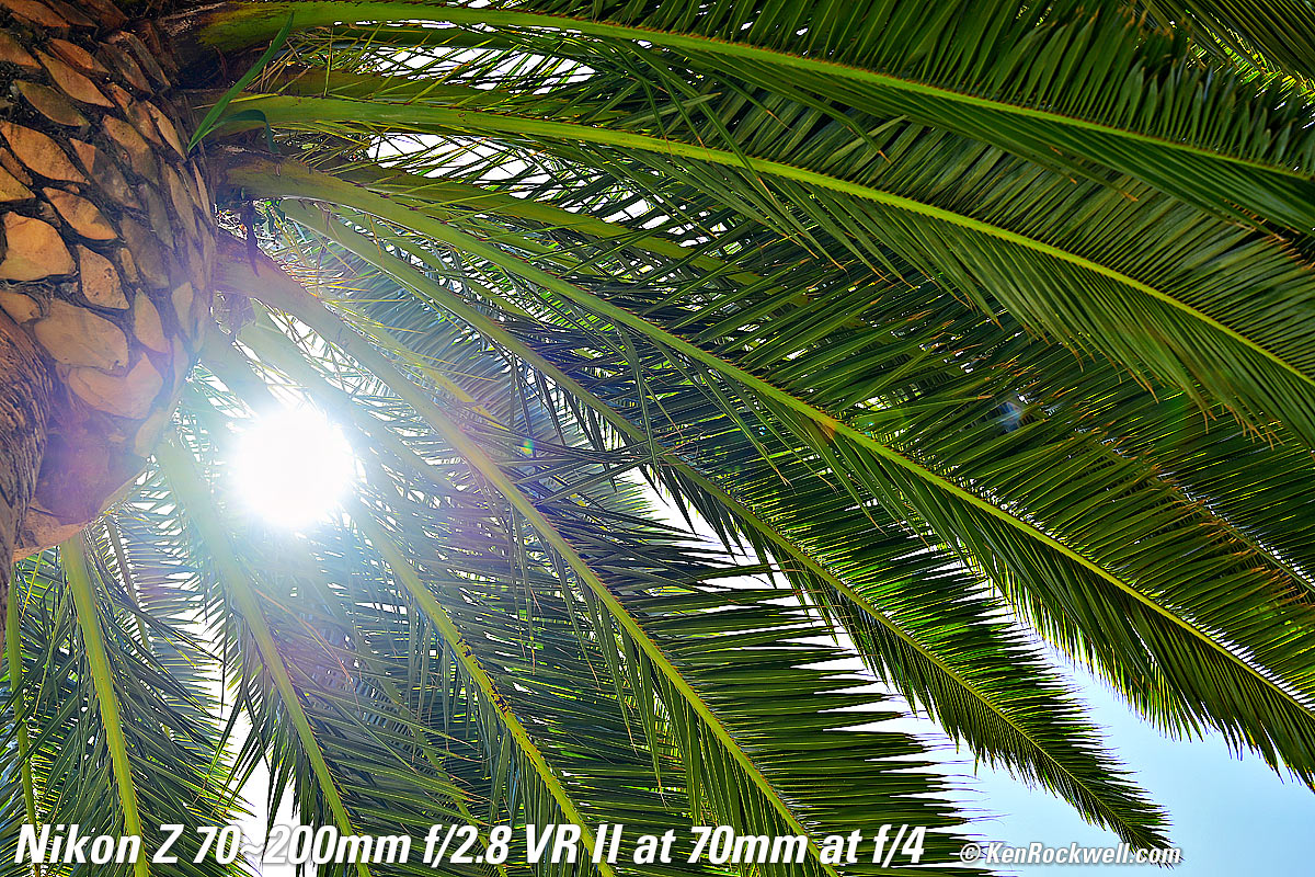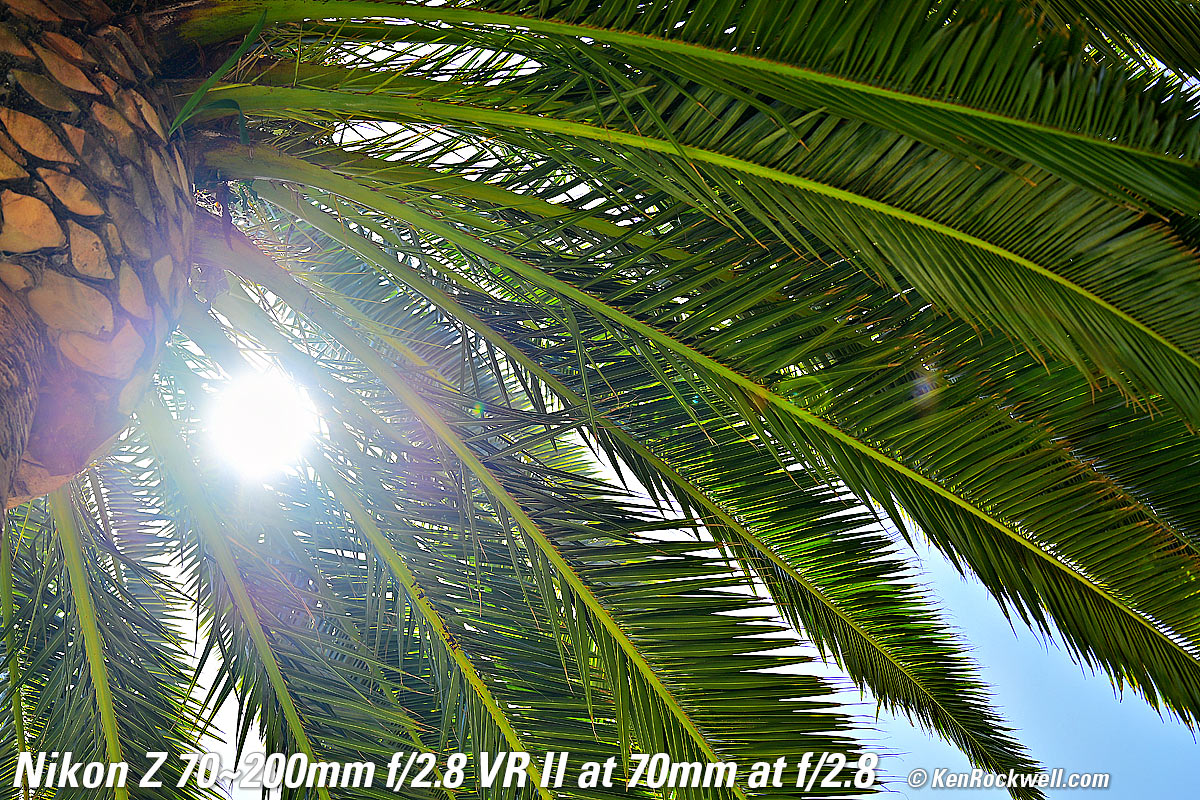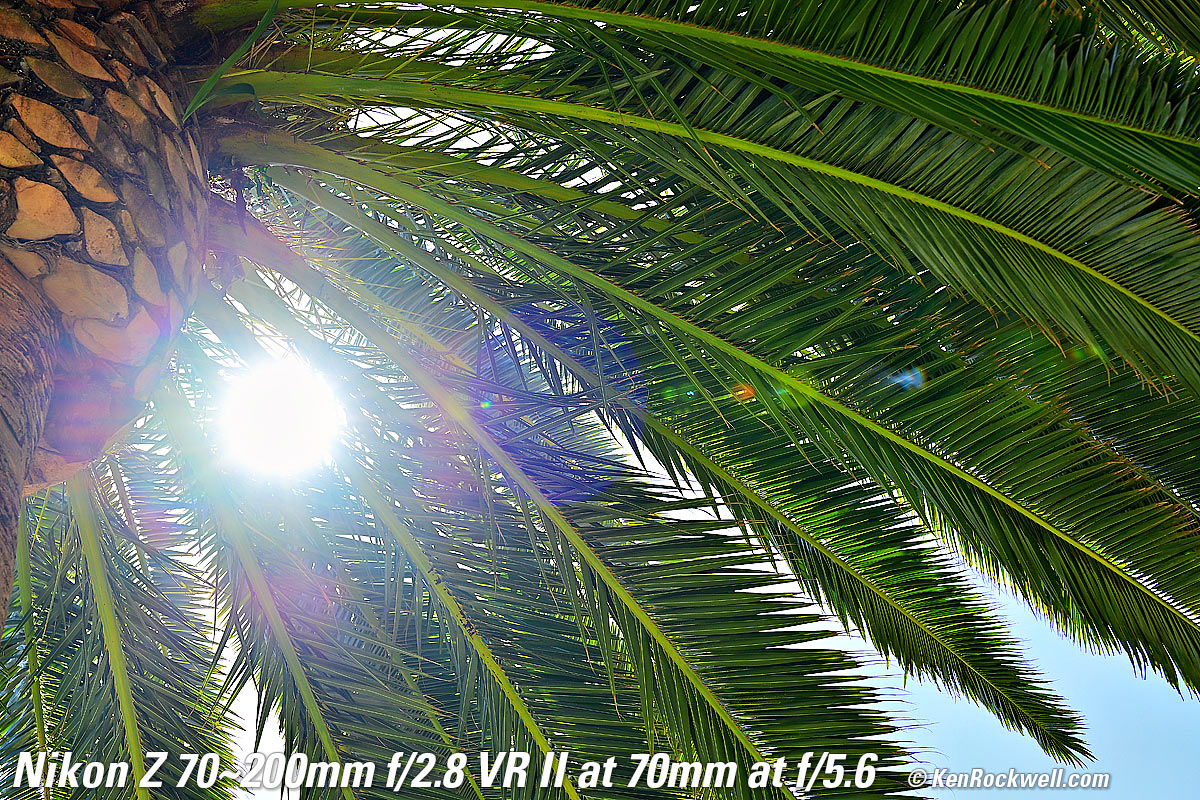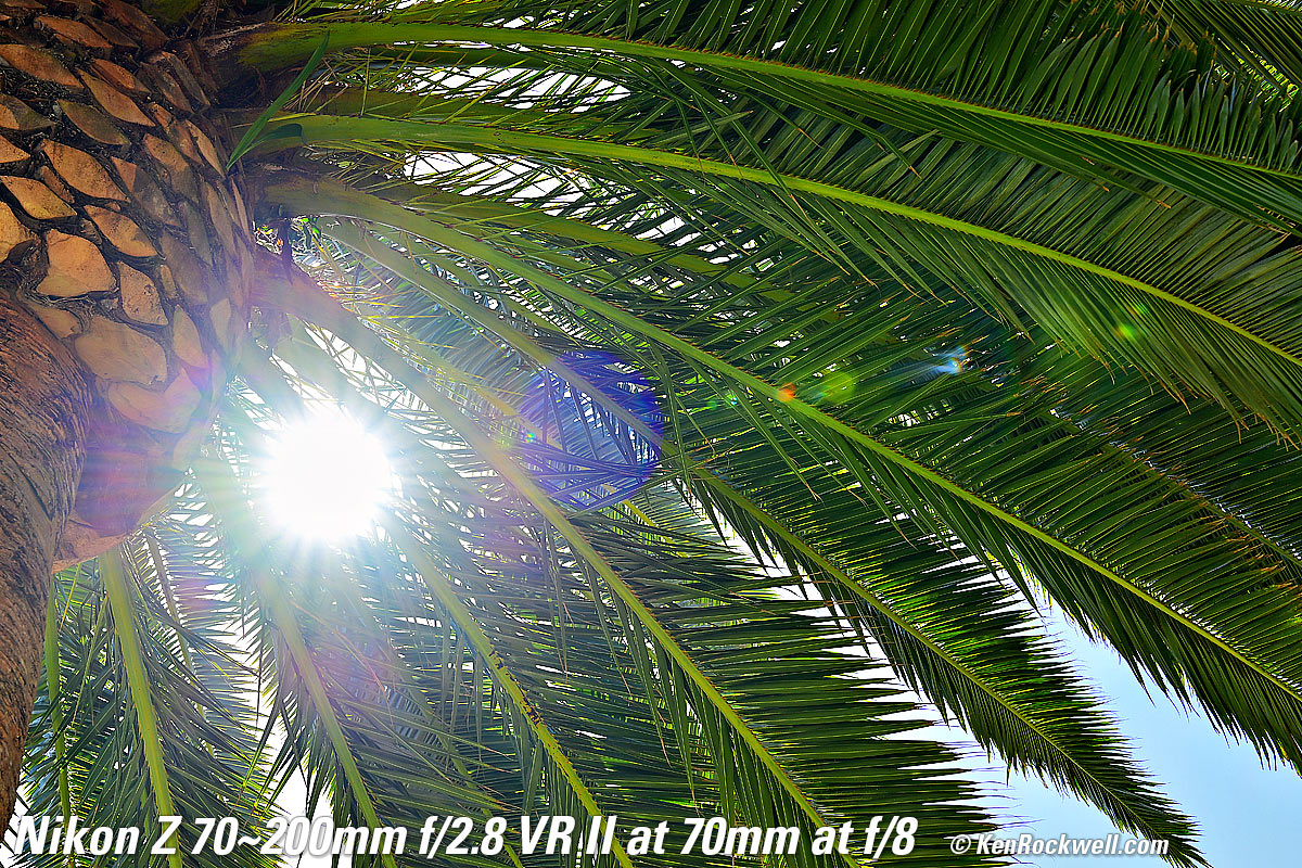 Sunstars performance topWith an 11-bladed rounded diaphragm, I get 22-pointed sunstars on brilliant points of light only at the smallest apertures. Ignore the crazy rainbows at small apertures; these are sensor artifacts caused by interference among the divisions between pixels on the sensor. These are made visible because we're using enough exposure to show the dark underside of a huge palm tree, and then putting the blinding disk of the mid-day sun in it. Doing this will show everything due to the insane lighting range. Click any to enlarge: Click any to enlarge.