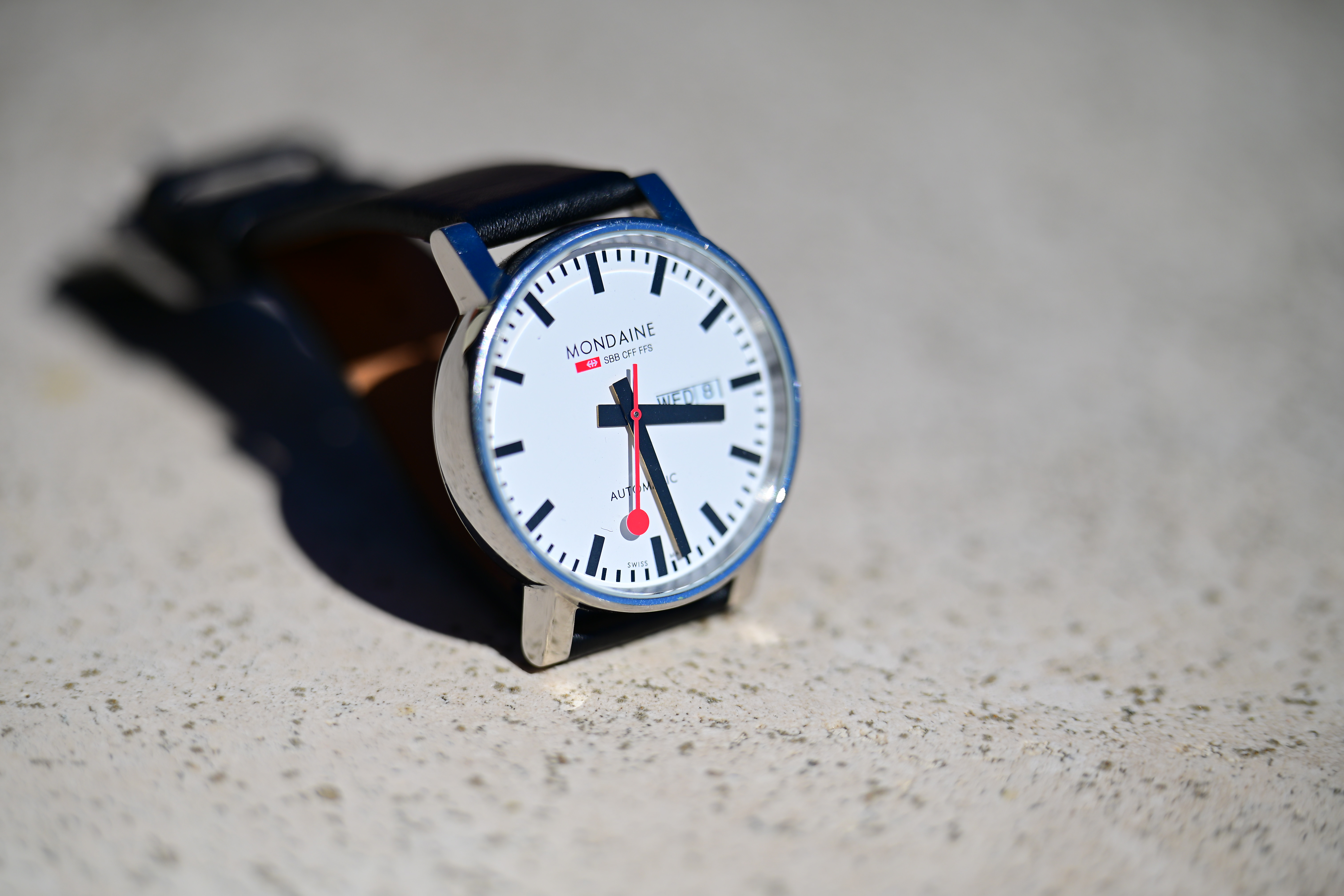 Only if you set up a deliberate test you might see sight yellow-green fringes behind and violet fringes ahead of the plane of perfect focus: Mondaine A132.30348.11SBB at close-focus distance, 08 April 2026. Nikon Z5 II, Nikon Z 70-200mm f/2.8 VR II at 200mm at f/2.8 at 1/8,000 at Auto ISO 100 (LV 15.9). bigger or camera-original © file.