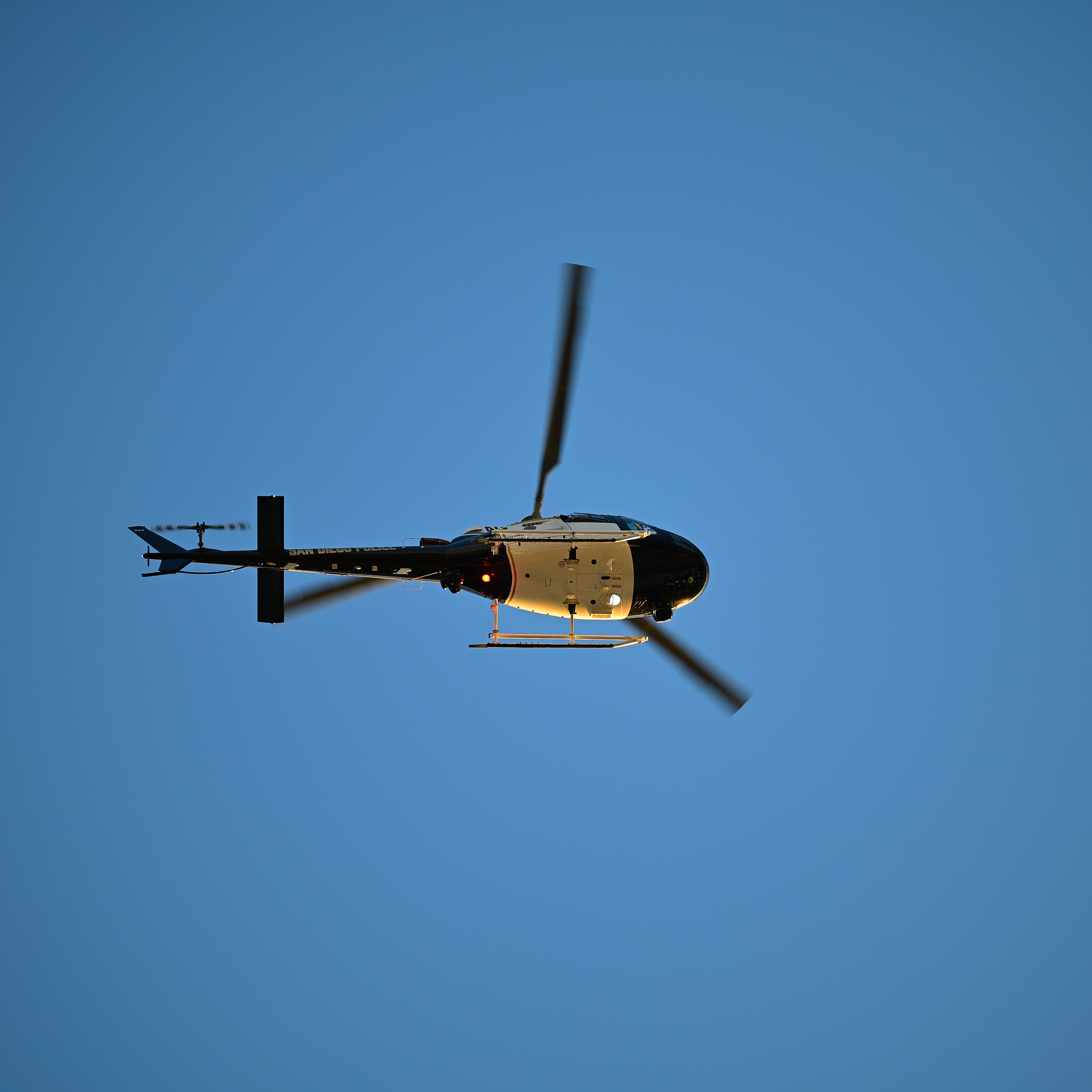 Police Helicopter (Doe!), 6:54 PM, Monday, 13 April 2026. Cropped from Nikon Z5 II in square-crop (HASSELBLAD) mode, Nikon Z 70-200mm f/2.8 VR II at 200mm at f/2.8 at 1/500 at Auto ISO 100 (LV 11.9), Radiant Photo software to add light. bigger or camera-original © 1.5 MB JPG file.