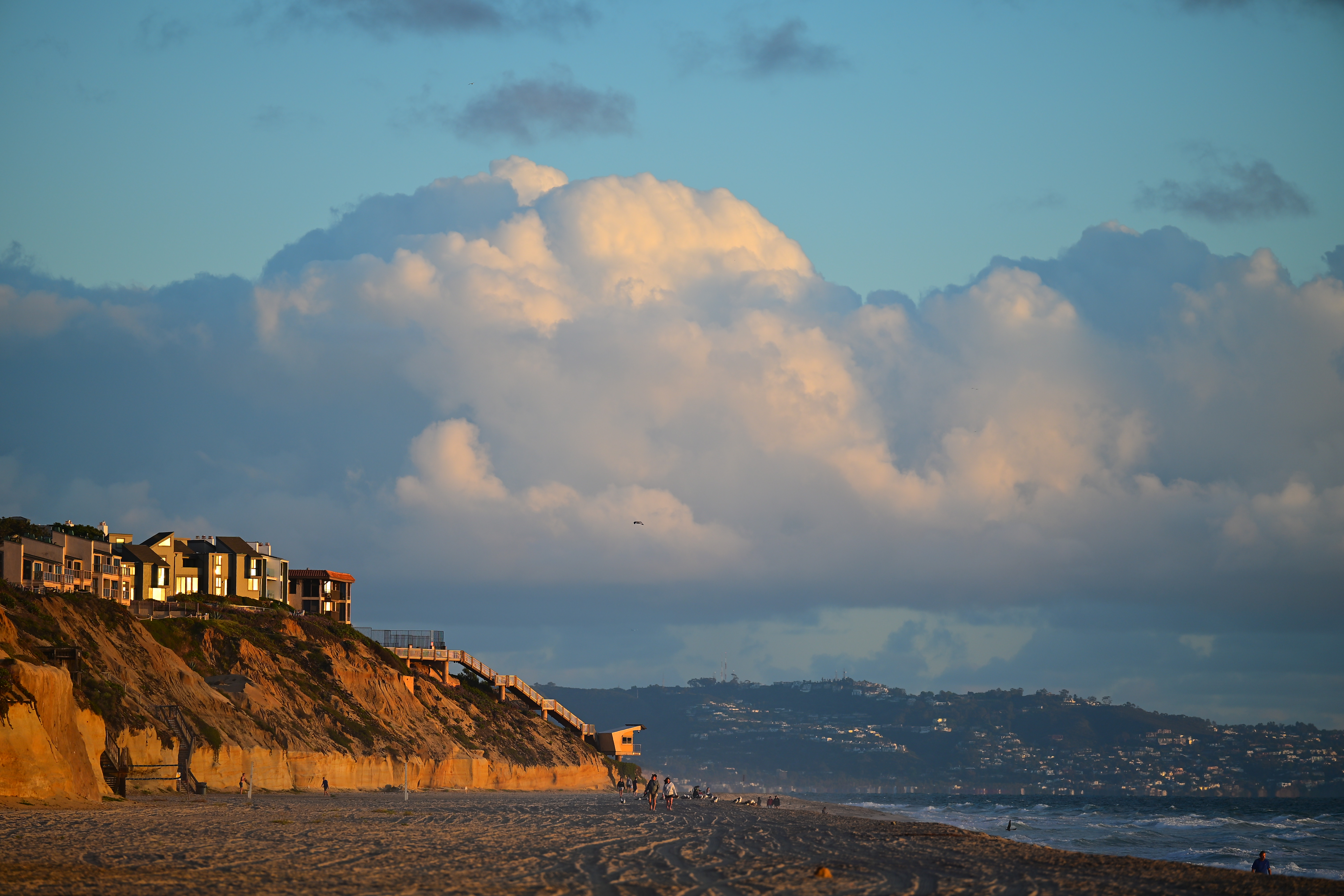 Clearing Springtime Storm, California Seacoast and Gull, 7:03 PM, Monday, 13 April 2026. Nikon Z5 II, Nikon Z 70-200mm f/2.8 VR II at 200mm at f/2.8 at 1/500 at Auto ISO 100 (LV 11.9), Radiant Photo software to add light. bigger or camera-original 24 MP © 3.2 MB JPG file. This lens, like most 70-200mm f/2.8 lenses, is so sharp even at f/2.8 that it's exciting aliasing (colored moiré patterns) on the vertical bars of the stairs.