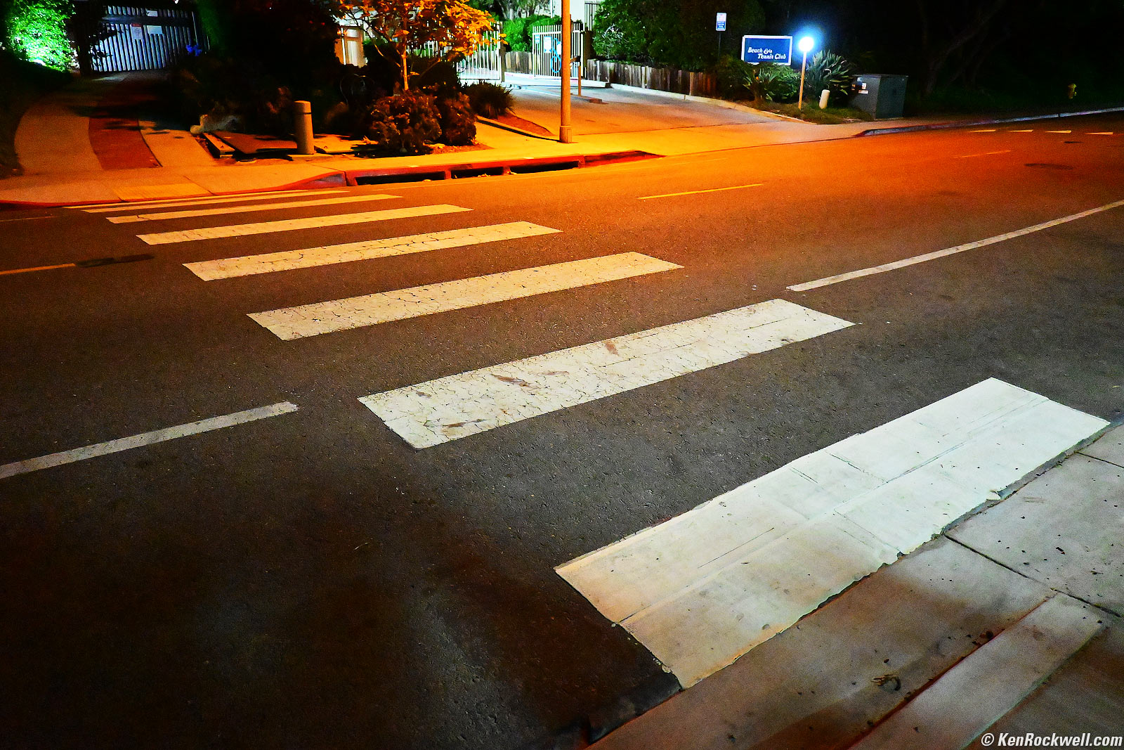 Pedestrian Crossing, 8:43 PM, Thursday, 28 July 2022. Nikon Z30, Nikon Z 16-50mm VR DX at 18.5mm wide-open at f/3.8 at 1/30 at Auto ISO 11,400 (LV 1.9), Perfectly Clear. bigger. Holy cow! Do you remember the olden days with cameras couldn't even get to ISO 12,000, and if they did, looked like complete mud? Back in the days of film, light meters often couldn't meter this low, and if they did, they'd tell me that this would be a three-minute exposure at f/16 at ISO 50, which due to reciprocity failure, means I'd have to have been carrying a tripod and make a ten-minute exposure at f/16 (f/16 to get depth-of field on my HASSELBLAD or view camera). Today, I can point and shoot as I walk around. How cool is this!