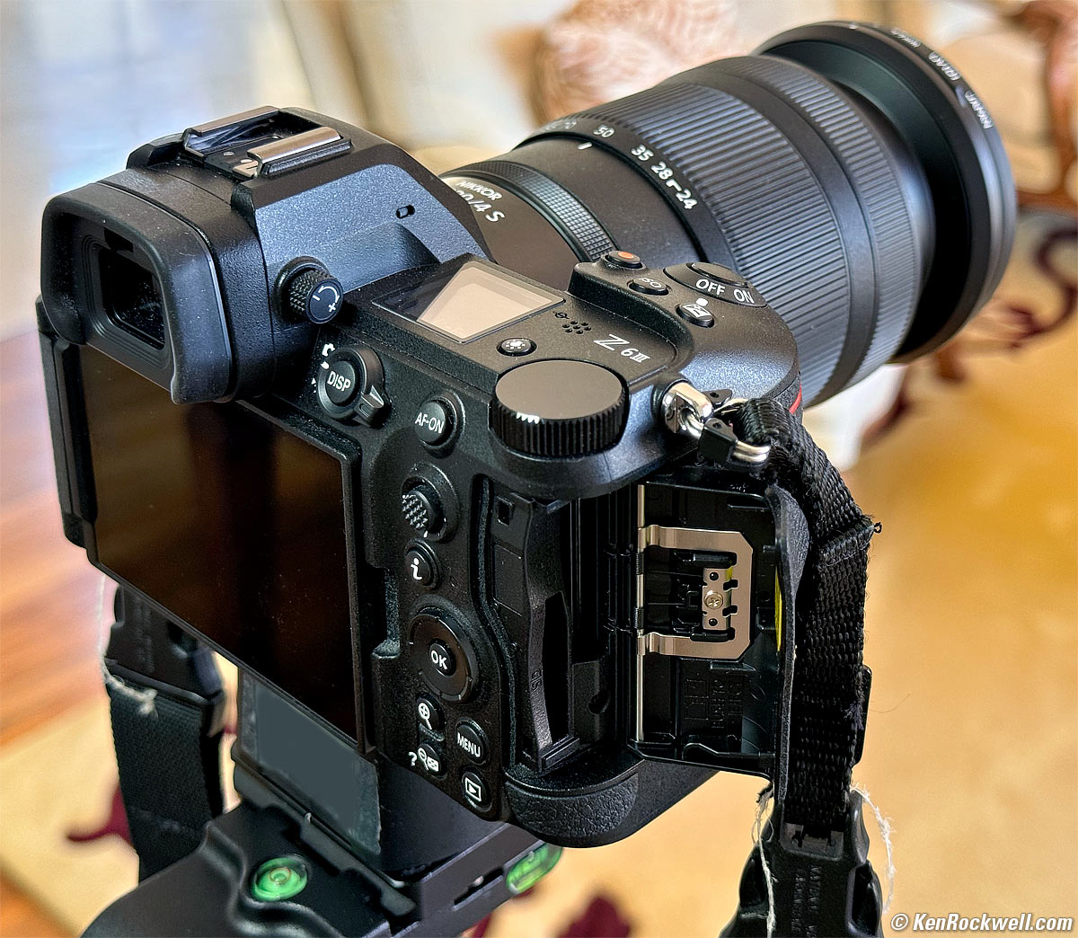 Oddly the strap lug is too close to the card door so you have to lift the strap out of the way to open the door all the way. Note how I lifted it up so I could open the door fully for this photo: Nikon Z6 III card door and cards. bigger. This is how far it opens if you open the door with the lug hanging down: Nikon Z6 III card door blocked, and therefore not open all the way. bigger. When this happens it's more difficult to get to the cards, so be sure your door is open all the way. Here's how it looks in practice with a strap pushed out of the way: Nikon Z6 III card door after pushing strap out of the way, mounted on Oben GH3W-15 geared head. bigger.