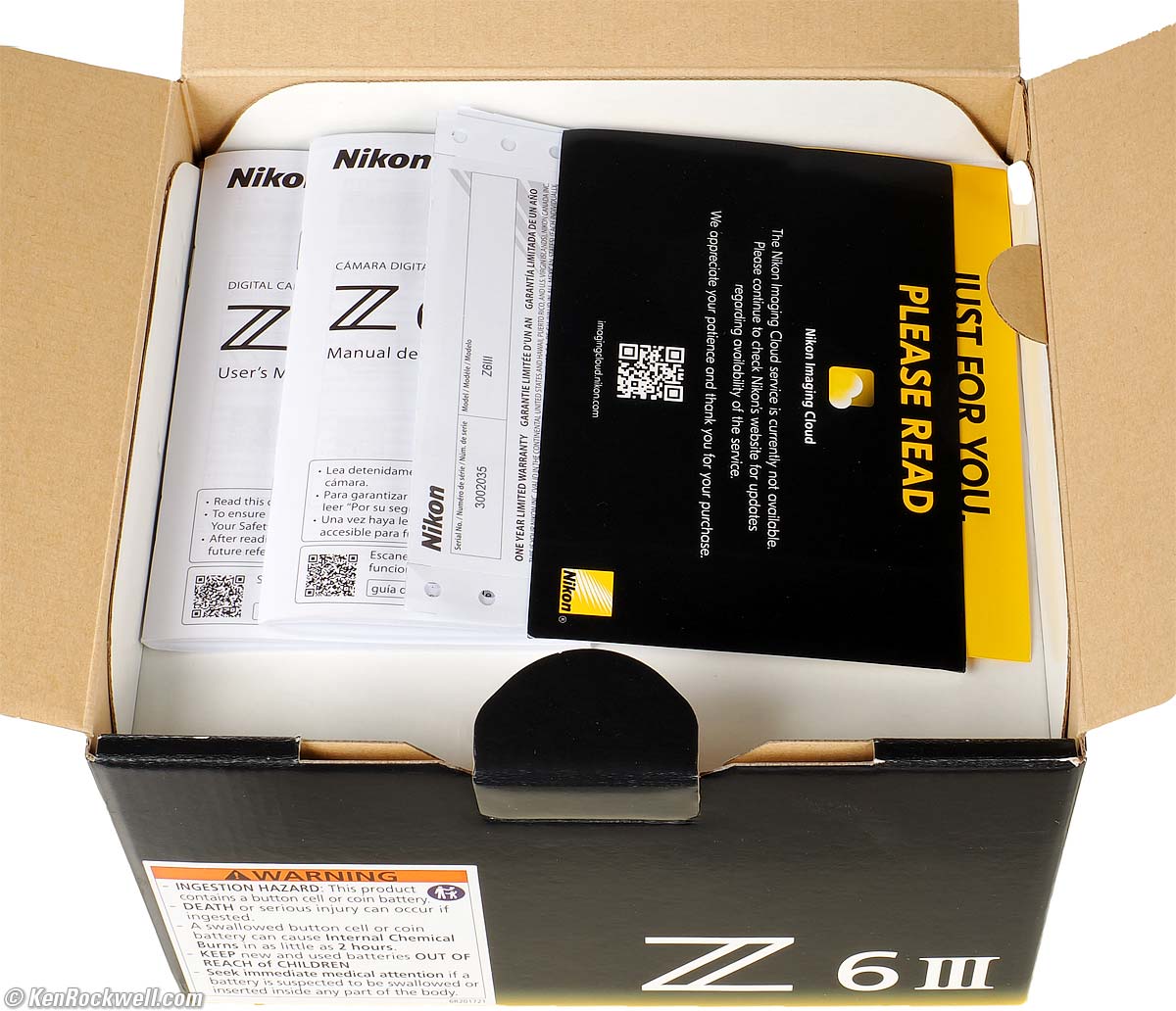 As shipped: Paperwork on top, Nikon Z6 III. bigger.