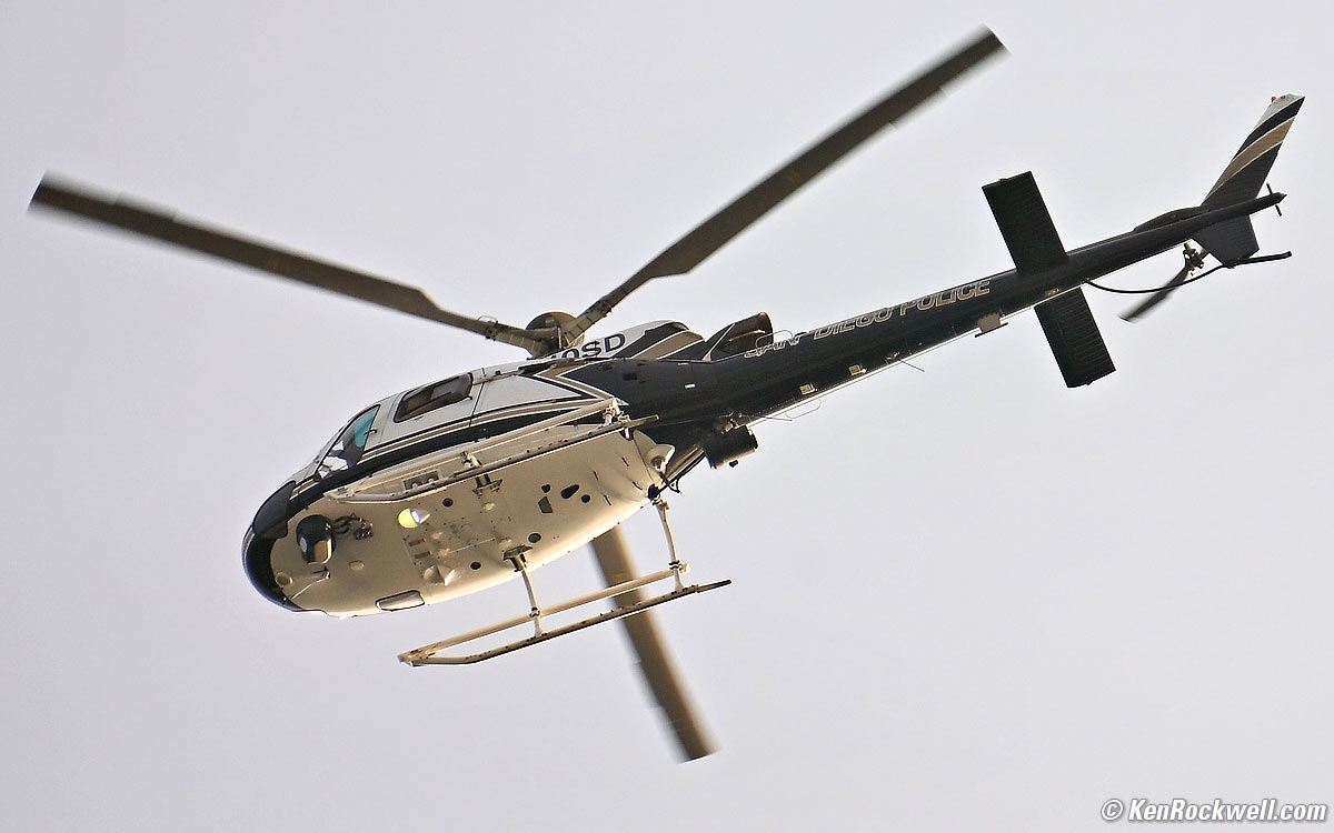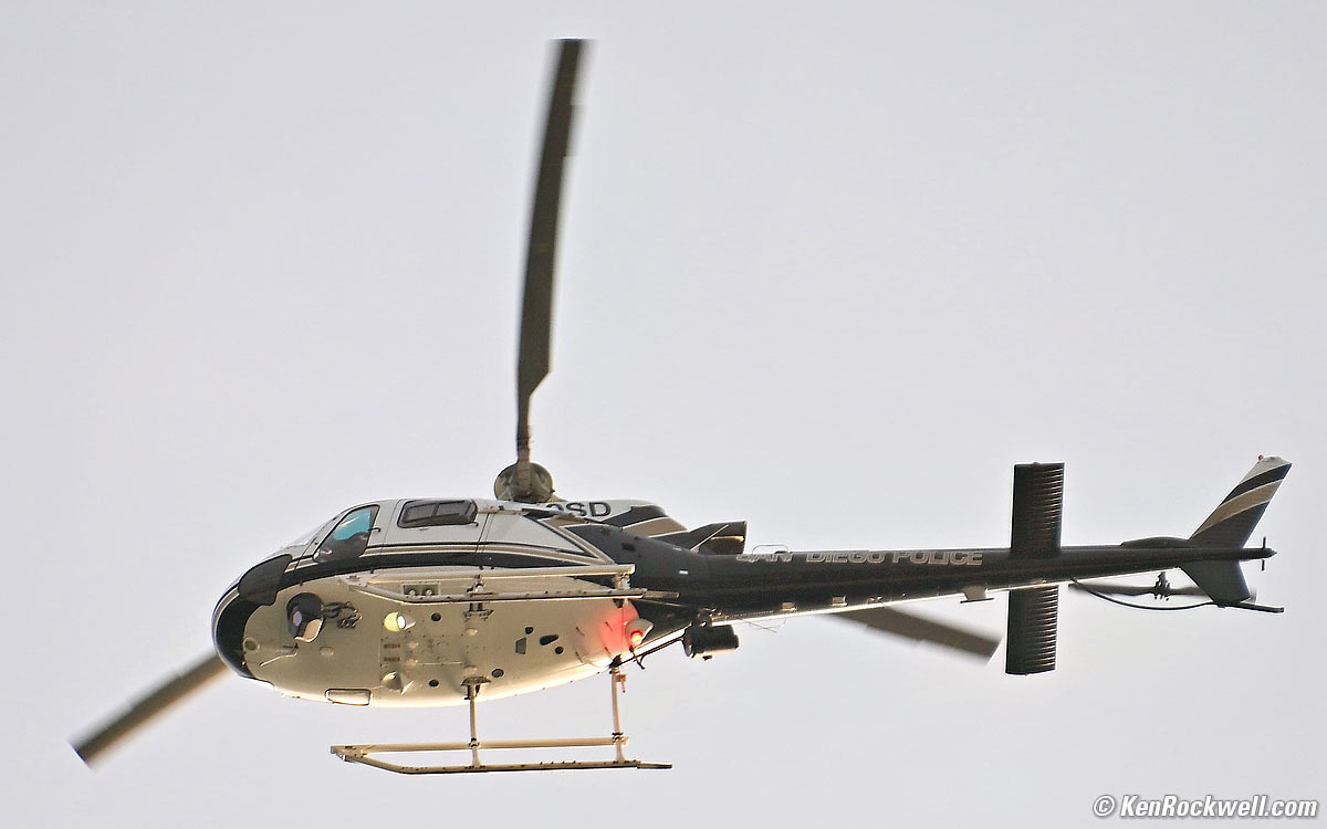 Rolling Electronic Shutter performance topIt's pretty good here; with the ability to shoot flash with 1/60 sync with the electronic shutter. Here's how it shoots a helicopter in flight. Here's about the worst bending: San Diego Police Helicopter, 6:53 PM, Thursday, 01 August 2024. Cropped Nikon Z6 III with Nikon AF-S 28-300mm VR on my FTZ at 300mm at f/5.6 at 1/1,000 at Auto ISO 360, +0.7 stops exposure compensation for the light sky and Radiant Photo software to bring back detail in the shadows (LV 13.1), Photoshop CC 2021. bigger. While most shots look pretty good, like this one: San Diego Police Helicopter, 6:53 PM, Thursday, 01 August 2024. Cropped Nikon Z6 III with Nikon AF-S 28-300mm VR on my FTZ at 300mm at f/5.6 at 1/1,000 at Auto ISO 360, +0.7 stops exposure compensation for the light sky and Radiant Photo software to bring back detail in the shadows (LV 13.1), Photoshop 2021. bigger. Of course a professional helicopter photographer wouldn't care, because much slower shutter speeds would be used to blur the blades to look realistic, not stopped here which says the helicopter is about to fall out of the sky.