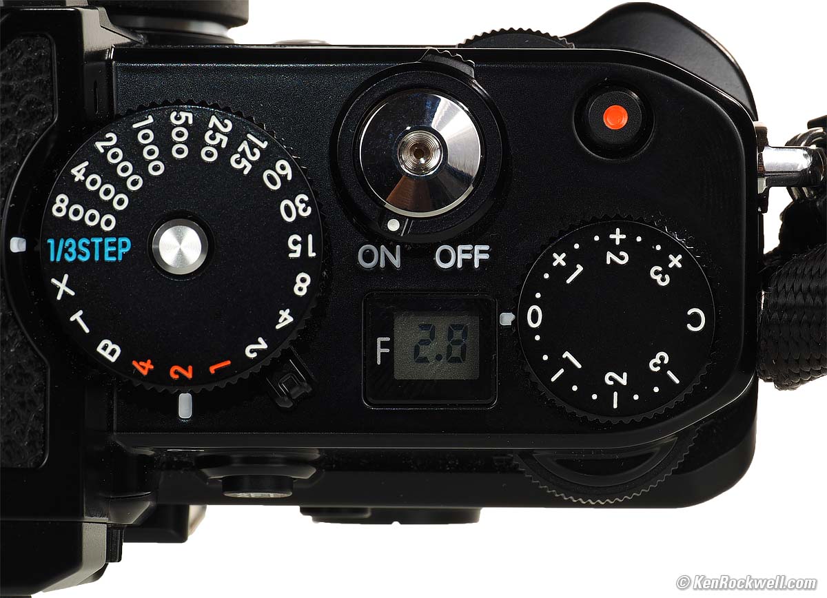 Top LCD performance topThe top LCD is a tiny thing that shows only two tiny digits for the aperture. This photo, made under studio light and greatly enlarged, makes it far more legible than it will be in actual use. It's smaller than just the seconds display of most LCD watches from the 1980s. It's essentially useless because it's set so deep. It's always in shadow and has no backlight. It's just for show and may safely be ignored.