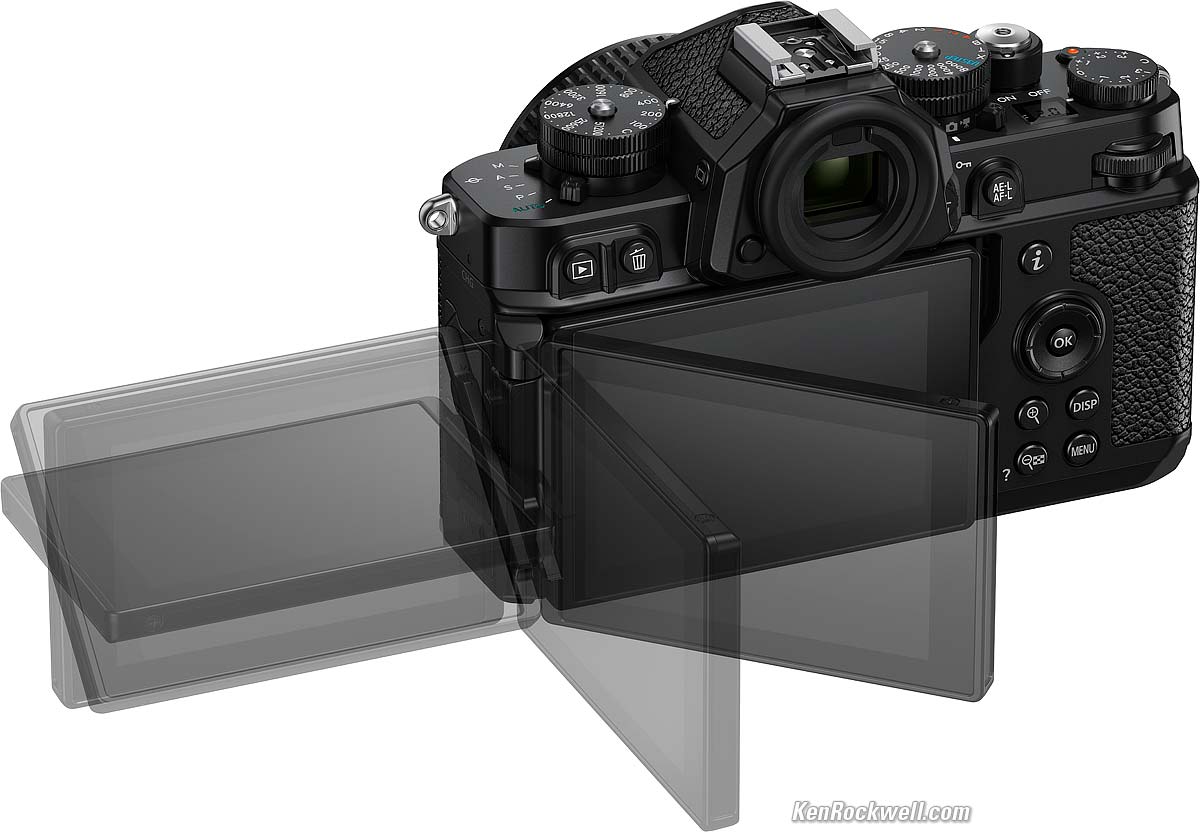 Nikon Zf flippy screen. bigger. 3.2" (8 cm) diagonal. Touch screen. 2,100,000 dots. 170º viewing. Manual brightness control only.