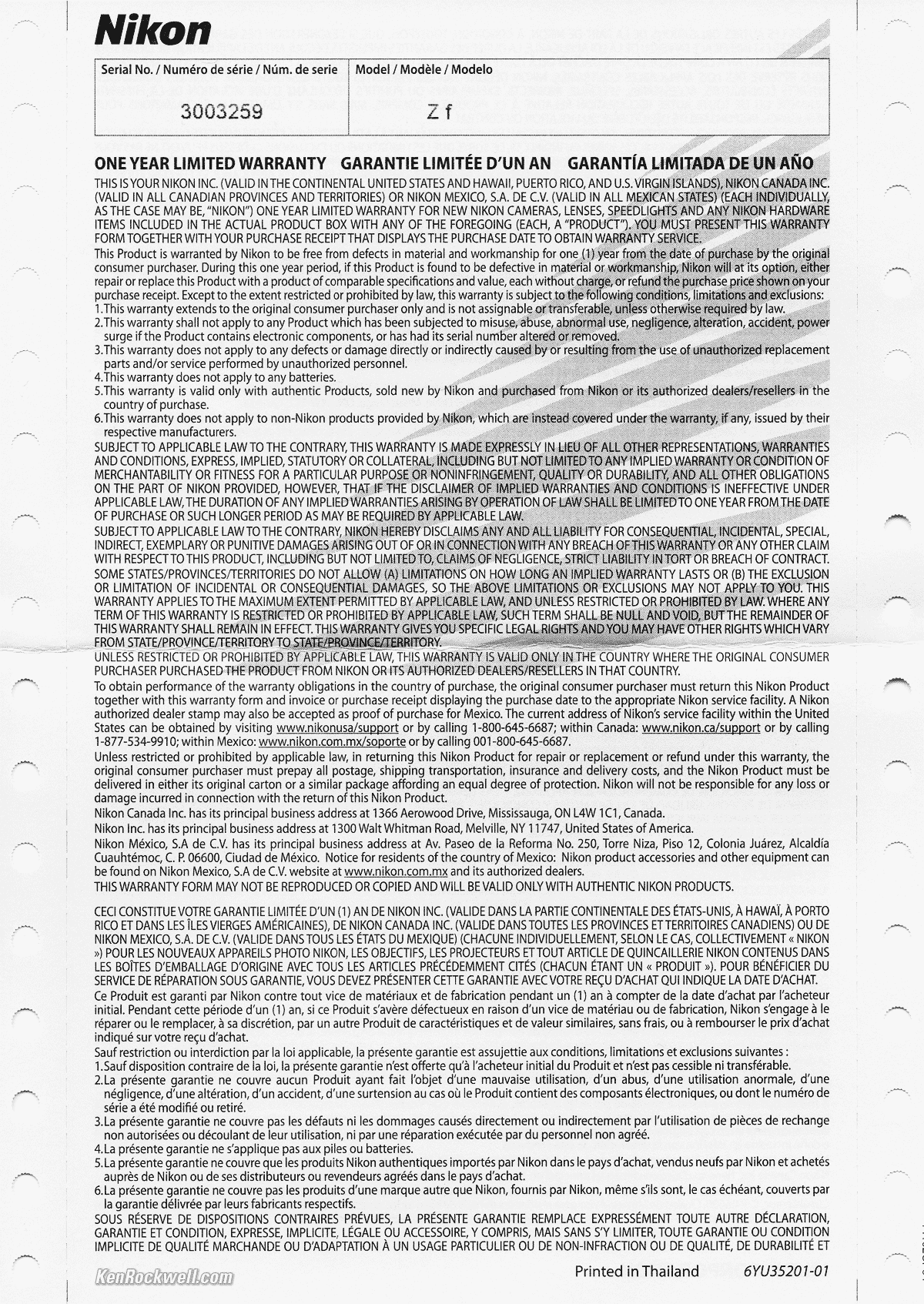 This section applies in the U. S. A. only. Your box should have "US" on the UPC sticker by the model number: Most importantly you need a USA Warranty Card, and the serial number must match the one on the back of your camera behind the LCD, otherwise you have no warranty. U. S. A. Warranty Card. bigger. If you don't have this card, if the card doesn't say "VALID IN THE CONTINENTAL UNITED STATES" or the serial number on the card doesn't match the one on your camera exactly, you got ripped off with a gray market version from another country. All legitimate cameras and lenses come with printed warranty cards, even if you prefer to register online. (The serial number on the outside of the box doesn't have to match, but if it doesn't it means you bought from a shady dealer who took cameras lenses out of boxes and then resold these used lenses cameras as new.) The U. S. A. warranty card comes from "Nikon, Inc.," the U. S. A. office; the Japanese headquarters is "Nikon Corporation." The card should be inside your box. The serial number on the card must match the serial number on the back of your camera behind the LCD. The warranty is also valid only if you are the original purchaser and only if it was purchased from an authorized dealer. All because a store or someone claims to be authorized doesn't mean they are. That's why I only buy from my personally approved sources. Shifty dealers may include color copies of a card from a legitimate U. S. A. product in a gray-market box, hoping you won't check serial numbers and catch their fraud. A card with the wrong serial number means nothing other than that you have no warranty coverage. Did you notice the clever nod to ancient computer technology? This is printed on tractor-fed paper with tear-off sides and dot-matrix printing of model and serial numbers! If your card lacks these side perforations, beware. Everyone counterfeits laser holograms, but few people have dot-matrix printers floating around to fake these. Always be sure to check your box, warranty card and serial numbers while you can still return it, or just don't buy from unapproved sources or at retail so you'll be able to have your camera serviced and get free updated firmware as needed. This is why I never buy anyplace other than from my personally approved sources. You just can't take the chance of buying elsewhere, especially at any retail store, because non-USA versions have no warranty in the U. S. A., and you won't even be able to get firmware or service for it — even if you're willing to pay out-of-pocket for it when you need it! Nikon U. S. A. enforces its trademarks strictly. It's unlikely, but possible that US customs won't let your camera back in the country if you bought a gray-market version in the U. S. A., carried it overseas, and try to bring it back in. (If you take the chance of buying one overseas, be sure you have a receipt to prove you bought it overseas and be prepared to pay duty on it.) If a gray market version saves you $500 it may be worth it, but for $200 or less I wouldn't risk having no warranty or support. U. S. A. versions include two small, abbreviated 70-page printed manuals, one in English y uno en español. Get yours from the same places I do and you won't have a problem, but if you take the risk of getting yours elsewhere, be sure to check everything while you still can return it.