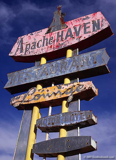 New Mexico. © 2001 Ken Rockwell This sign was designed by John M. Evans in 1963. Today John is a freelance artist in his off hours and a scientific Illustrator for the USGS the rest of the time. In 1963 he was a highschool freshman in Dulce N.M. who had recently moved from Yuma Arizona, where his Dad had been in the Army in the same place my dad was here and here. John was then transfered to the Bureau of Indian Affairs Offices in Dulce New Mexico (culture shock). In 1963, Dulce had one small merchantile store that had saddles for sale, saw dust on the rough hewn floors, and very little in the way of groceries. By summer's end 1963 the local paper, the Jicarilla Chieftan, launched a contest for all ages to submit: 1.) A name to be used on the new Motel, and 2.) A working design for the actual signage. After weeks of sketching and wracking his brain for a name, John submitted the proposal, and won the grand prize of $75.00 (a lot for a freshman in '63). John left Dulce for college in Portales NM and in 1967 joined the Navy (Pacific) in 68. John began his carreer as an Illustrator in 1972 in Boulder Colorado. Today John can be found at www.pdsrv.com and his latest work can be seen at the graphics link. Bigger, clearer image for special fast internet connections |