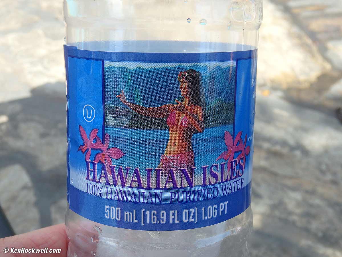MacroMacro, as on the TG-4, is the best I've ever seen. It focuses to four inches (10 cm) in the regular shooting mode, at every zoom setting! This lets you get super-duper close and never have to fiddle with macro modes. Spin the mode dial to the flower with the S (Super Macro), and it now focuses essentially to zero (the front of the camera), even at the telephoto setting, so you can get to microscopic close-ups. Water Bottle (just a separate overview shot for reference). bigger.