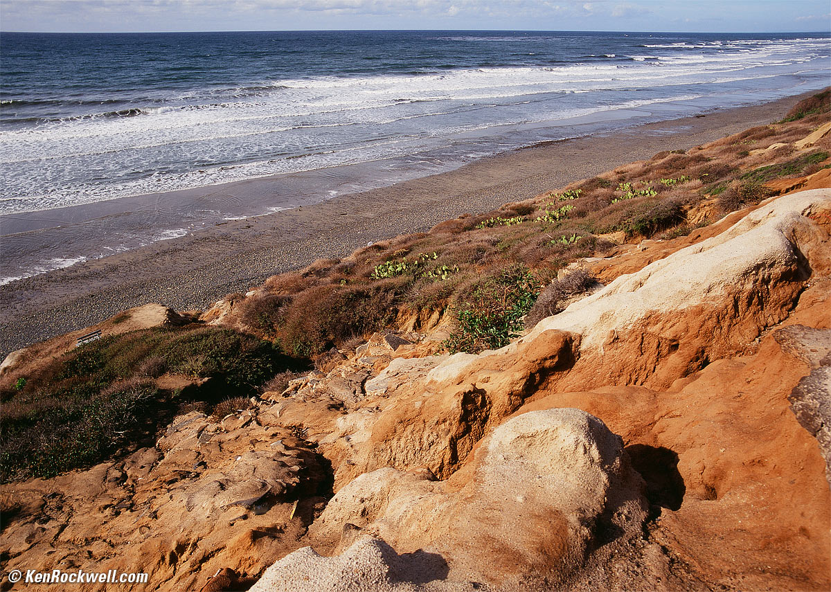 The Pentax 35mm f/3.5 has no visible distortion. This is the worst I can make it look: Horizon, worst case. enlarge. You're not going to get any better with any other ultrawide SLR lenses. Pentax 35mm with 81C filter on expired-three-years-ago Fuji Velvia 100, 6x4.5 cm, processed and scanned at NCPS, f/9.5 at 1/125, program auto. This is extraordinary for an SLR lens; you usually need a rangefinder or view camera lens to work any better. For very critical use, plug +0.5 into Photoshop CS2's lens distortion filter to correct the invisible barrel distortion, after which there is just a little bit of waviness left. I see the same distortion at 10 feet (3 meters) as I do at infinity. Your chromes will look great. Shoot interiors with vertical lines or the horizon at the beach, and all is well. For any shots other than the horizon above, there simply isn't any visible distortion. Lay off the straight shots of brick walls and everything else looks perfect.
