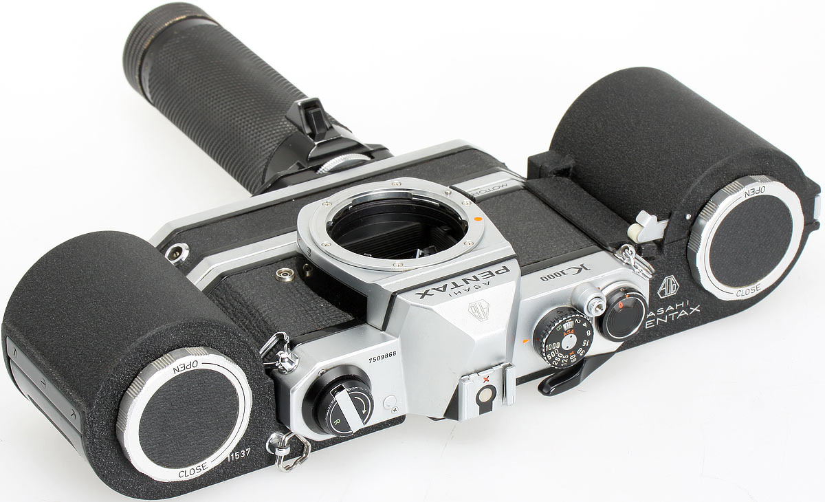 Pentax K1000 with Motor Drive (custom). enlarge. There was no production motor drive, however this one-of-a-kind camera turned up and is for sale at National Camera Exchange.