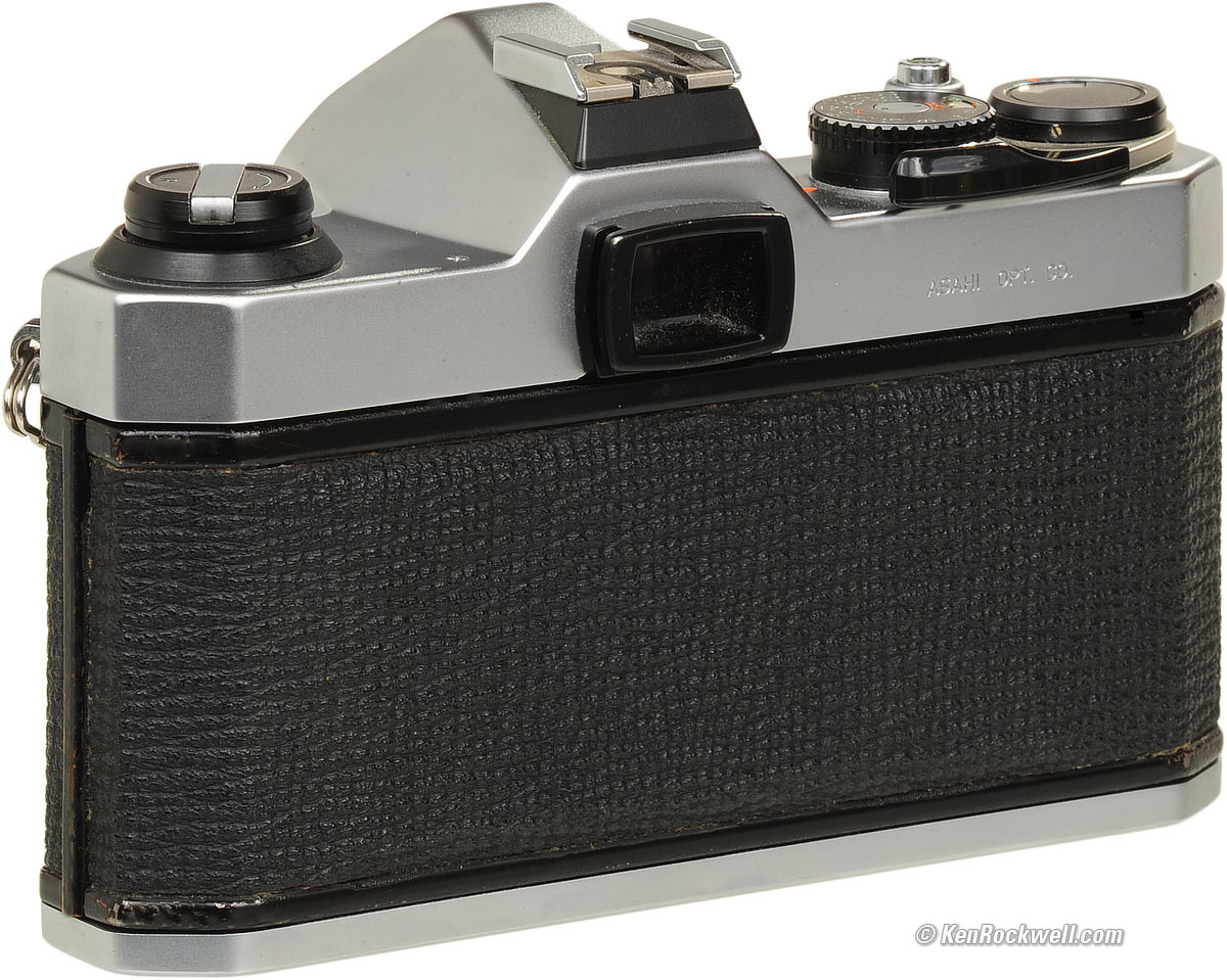 Compared top Intro Specs Performance Compared Usage Recommendations The Canon AE-1 Program is another favorite of mine. It requires a bigger and less common 6V 544 (4LR44) battery to operate and is more plasticy, but has a much more reliable exposure meter and fully automatic exposure. The K1000 and AE-1 Program are amateur cameras, while the Nikon FM, Nikon FE, FE2, FM2 and FM3a are professional-level cameras. The Canon and Pentax of this era are not as tough, while these Nikons can cheerfully take a beating and keep on shooting. The K1000 is simplicity incarnate, the AE-1 Program adds a better meter and automation, while the Nikon FE is as simple, while built much tougher with a far more accurate meter. Want simple for the lowest price? Get a K1000 for $60 complete with lens. Want automatic exposure and a better meter, but with a little more complexity and harder to find battery? Get a Canon AE-1 Program. Want professional toughness and metering, but for more money? Get a Nikon. The K1000 never asks you to move or think about a power switch, while the Canon and Nikon do. It's much faster and easier to set the K1000's manual exposure than to play with other camera's menus. It's much faster to turn the big focus ring than to dick with other camera's autofocus settings, and no matter what you do, the K1000 always fires when you press the shutter.