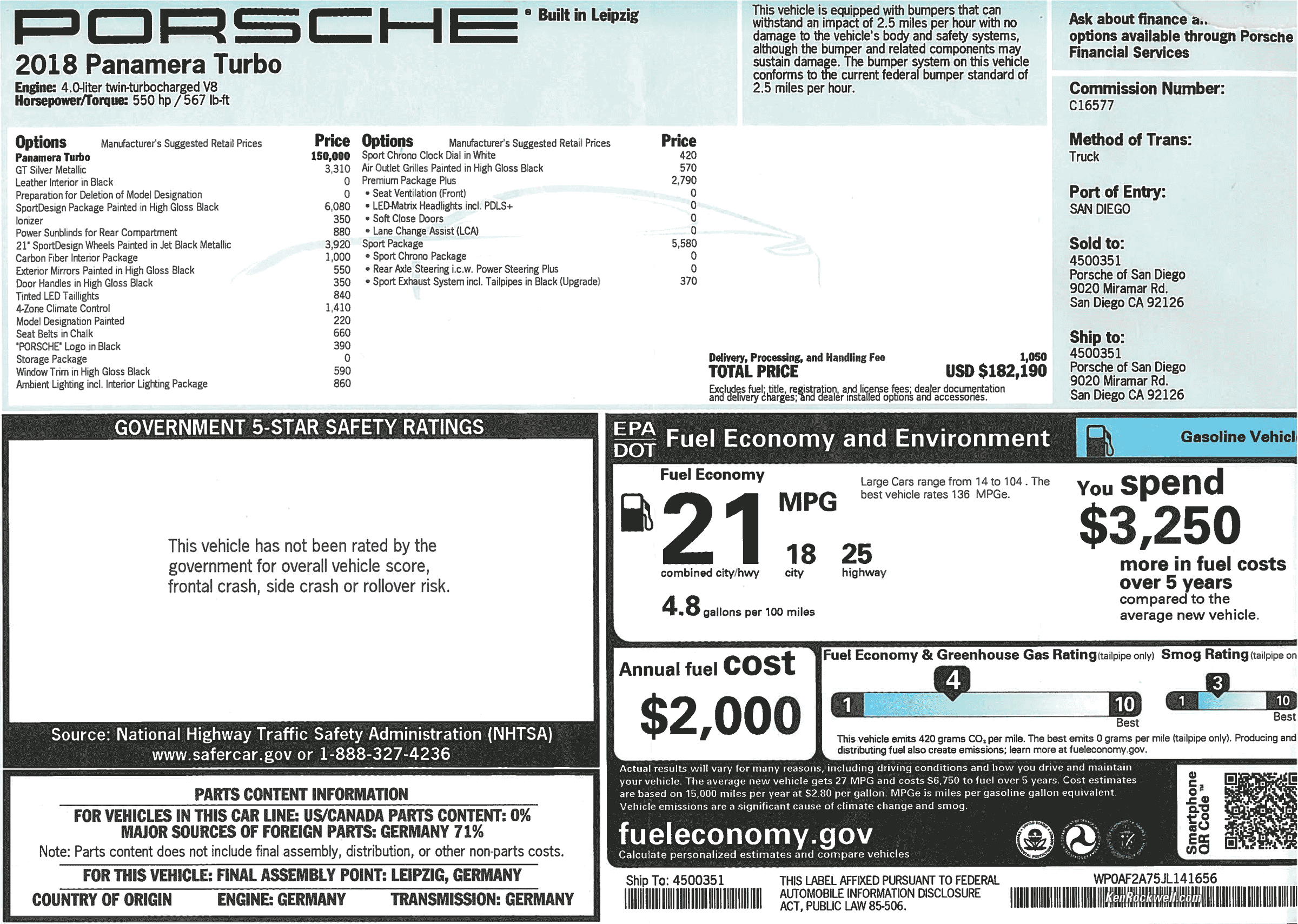 Performance2.9 seconds 0-60 MPH. 190 MPH top speed. 11.3 seconds at 122 MPH standing quarter mile. Rated 8.0 pounds per horsepower (I calculate 8.35 with 4,593 pounds/550 hp). 37.4' turning circle with our optional rear-axle steering. EPA 18/21/25 city/overall/highway MPG.