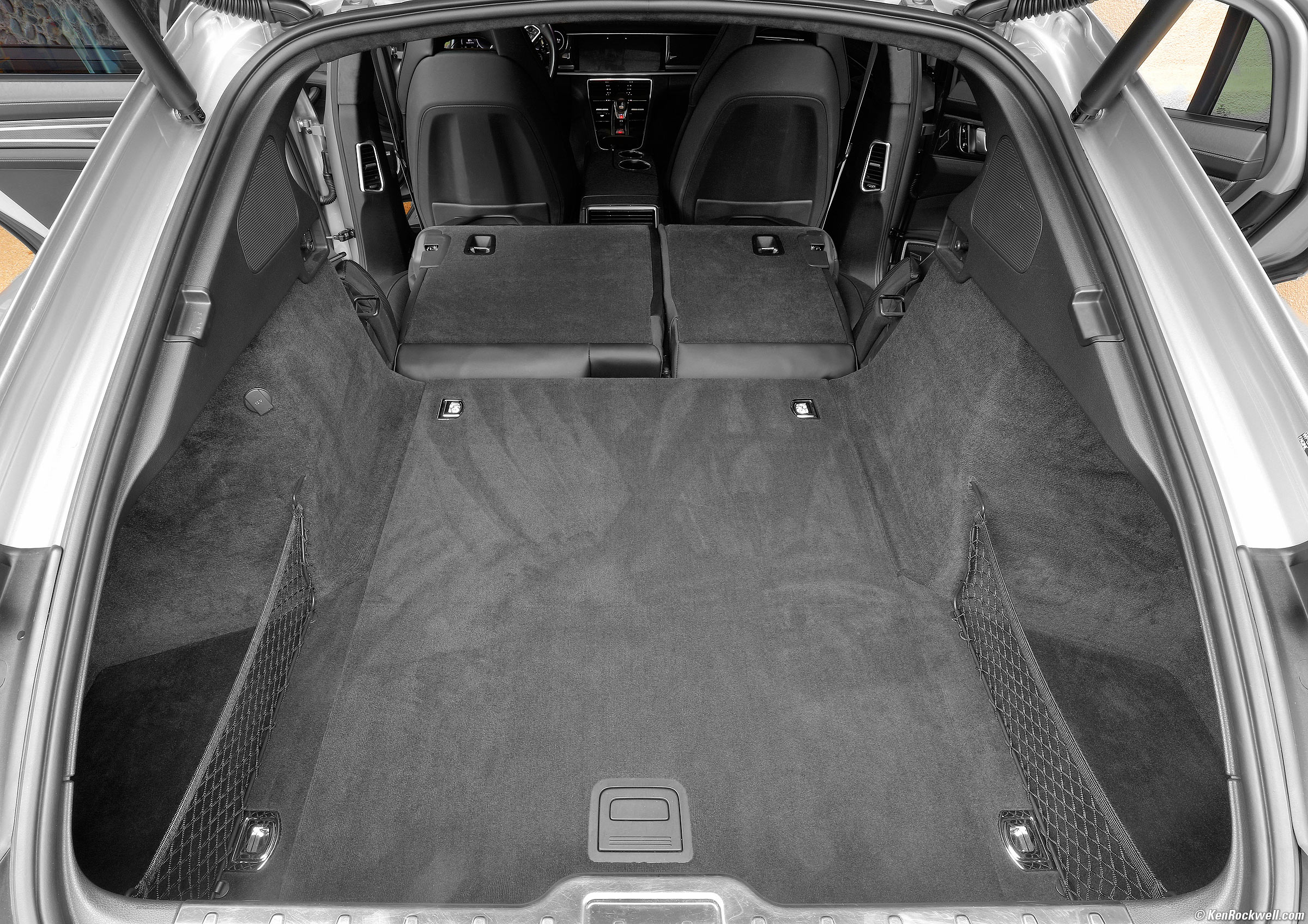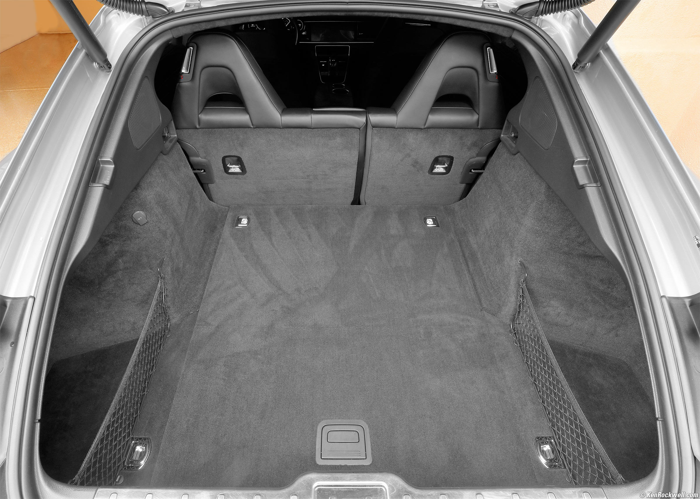 Rear Seats Folded DownPorsche Panamera Turbo Cargo Area, Rear Seats Folded Down. bigger. 36″ wide at the floor, excluding the left and right netted side sections and extra width between the rear seats. 72″ deep with both seats folded forward. If one seat is left up, they're split 21.5″ or 15″ wide, behind which the area is only 39″ deep. 24″ to 25.5″ tall from the back of the front seats going back 36″ to just behind the rear hatch pivot, then tapers down to 12″ tall at the very back.