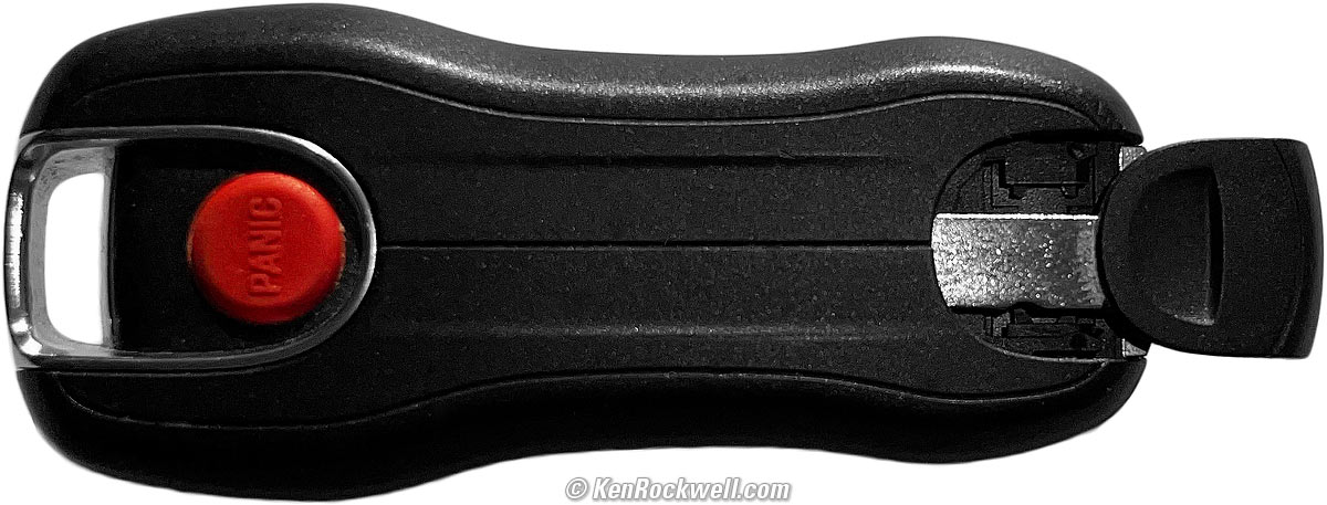 3.) Rotate the circular battery cover counterclockwise (just as it's marked) and swap the CR2032 cell. bigger. Snap it back together and you're done! It takes one CR2032 lithium cell. You can get them at the grocery store checkout for $10 each, or just order them from Amazon in advance for about $1 each so you'll have them when you need them. I think they last about 6 months each. You may as well order from Amazon as you'll have them in a day or two, and you should have plenty of warning when you see LOW KEY BATTERY displayed on your dashboard to change it. No worries, if your key battery ever dies completely, pull out the mechanical key as shown below to open the door (pullout the handle to find the key slot), and them leave the dead key in the front cupholder to start the car. That's just me, I'd rather die than pay $10 at retail for a $1 cell.